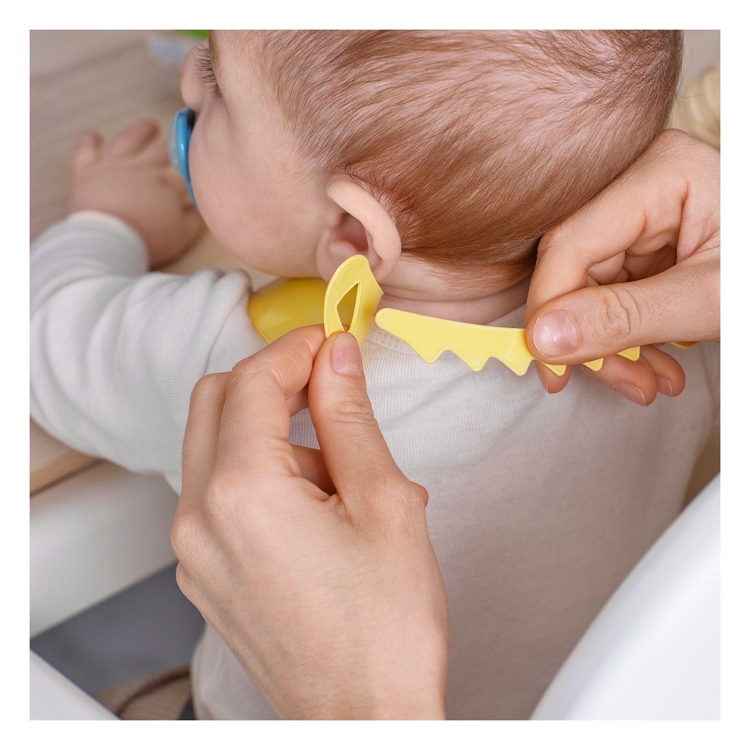 Нагрудник легко надевается на шею малыша. Большой карман довольно вместительный и легко удерживает всё, что не попадает малышу в рот.