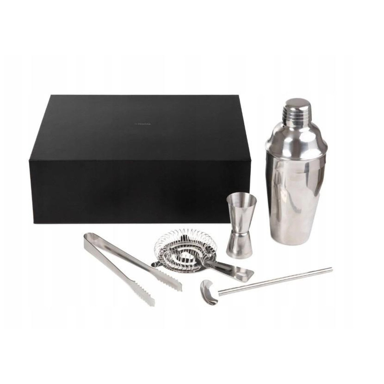 Этот набор предназначен для приготовления самых разнообразных напитков. В комплект входят пять предметов: шейкер для льда, барный ситечко, барная ложка в форме диска, мерный стакан и щипцы для льда. Все предметы изготовлены из высококачественной нержавеющей стали, что гарантирует их долговечность. Набор отличается элегантным дизайном и красивой серебристой отделкой. Набор упакован в элегантную черную коробку размером 24 см в ширину, 32 см в длину и 10 см в высоту.