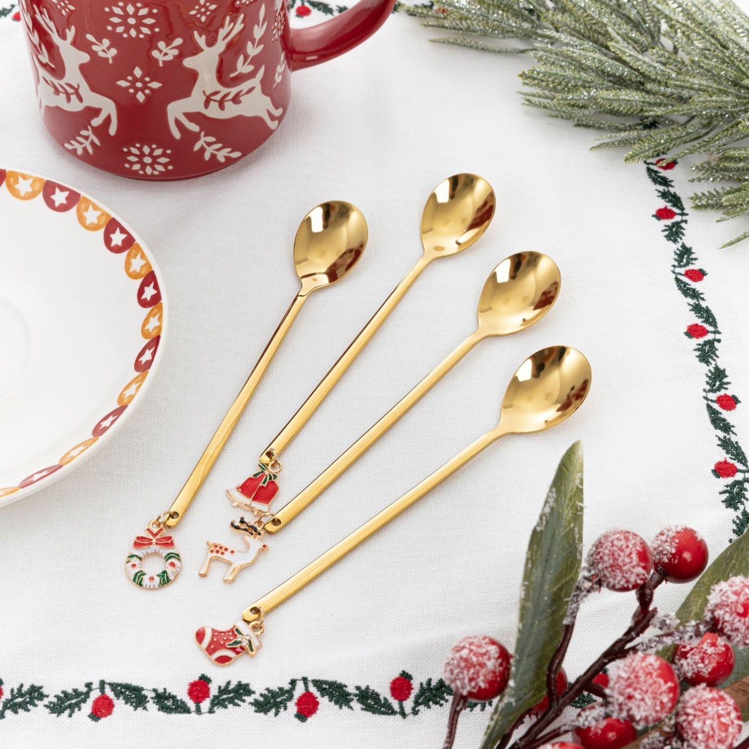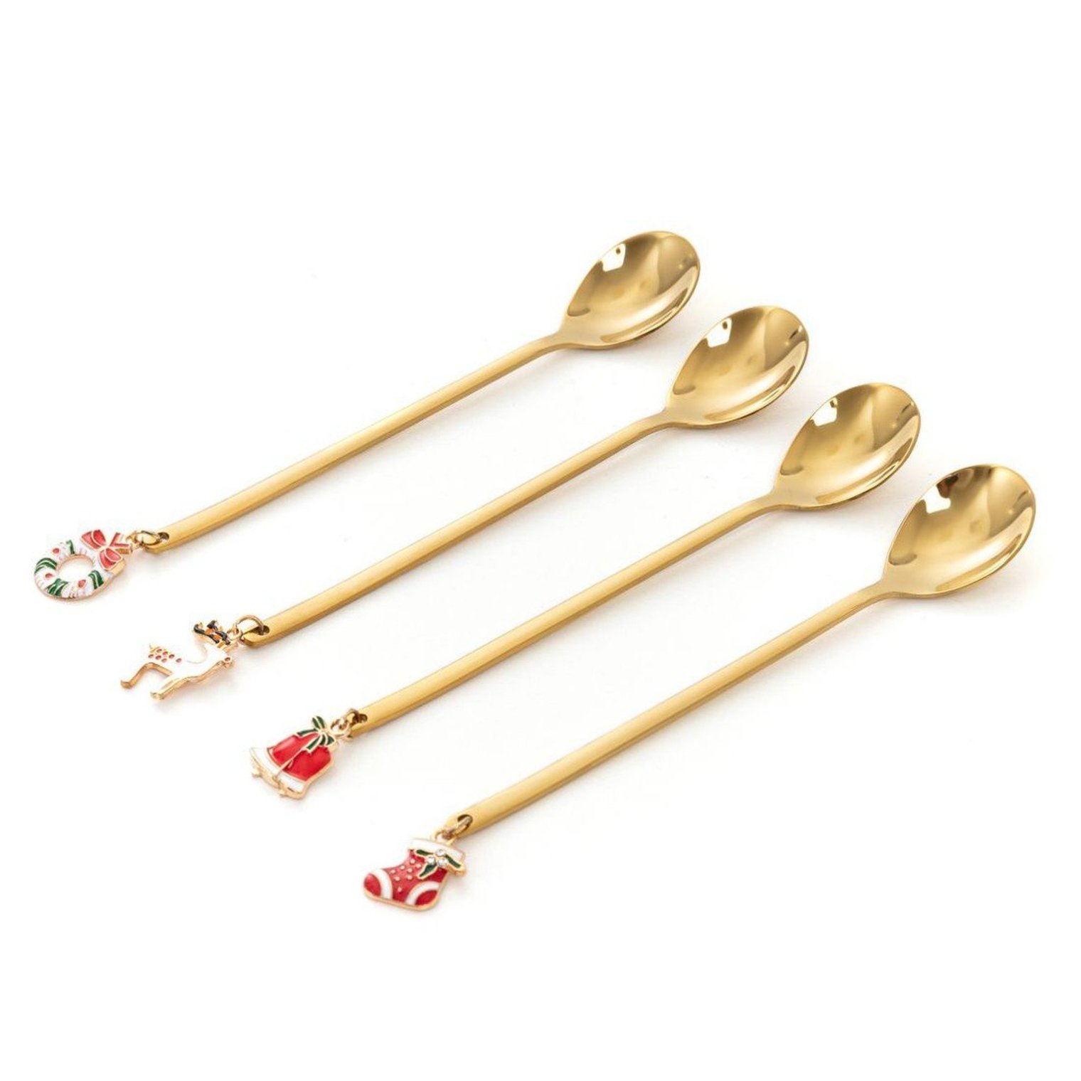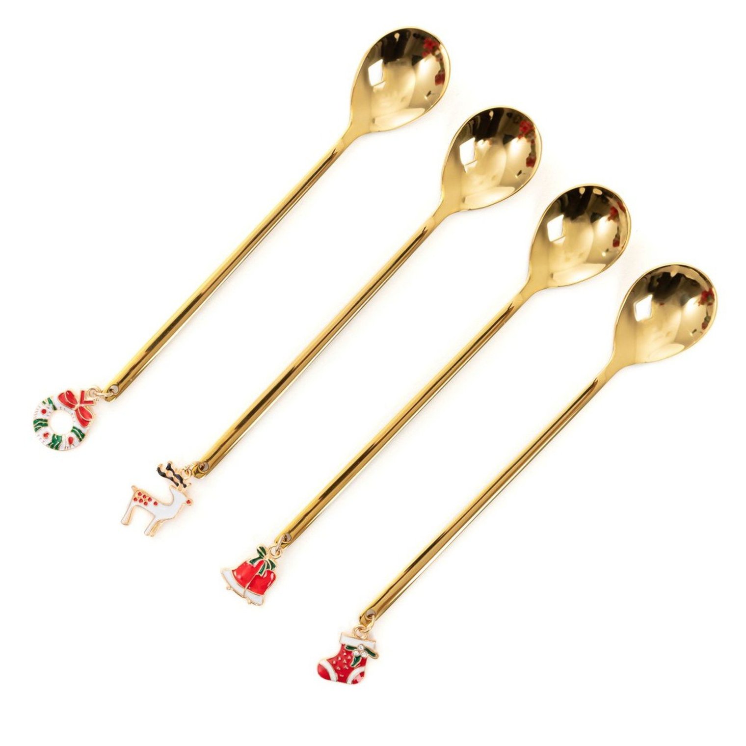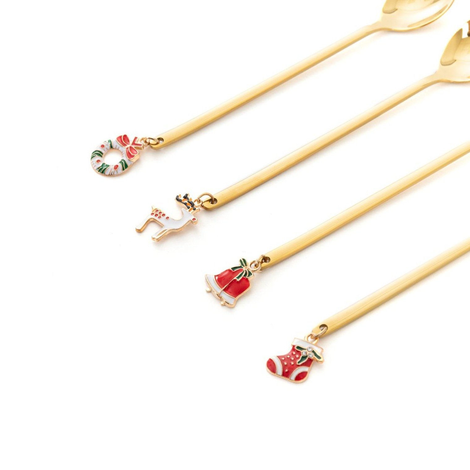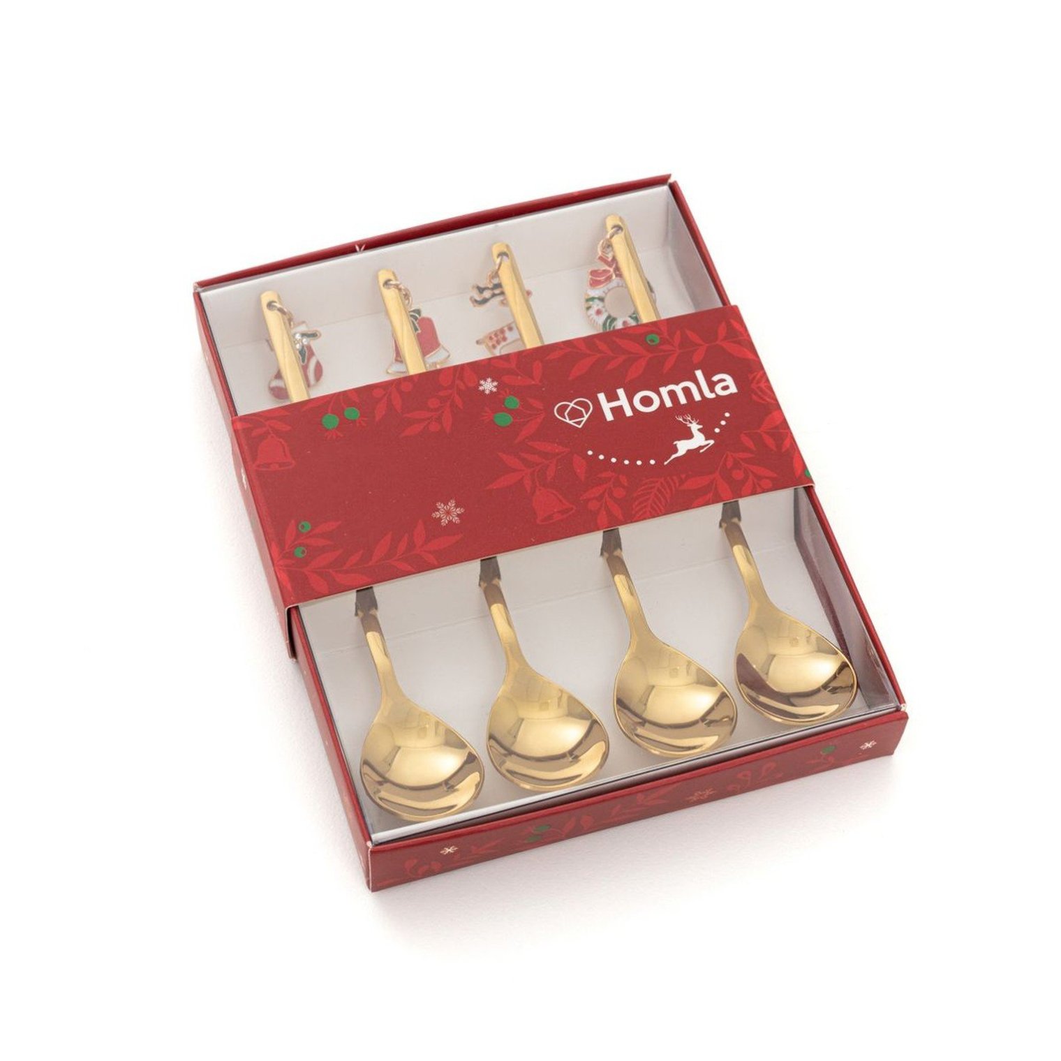 Набор из 4-х десертных ложек с очаровательным декором в виде маленьких рождественских подвесок. Сочетание стильной формы и золотистого цвета делает ложеки идеальным дополнением к сервировке рождественского стола.
