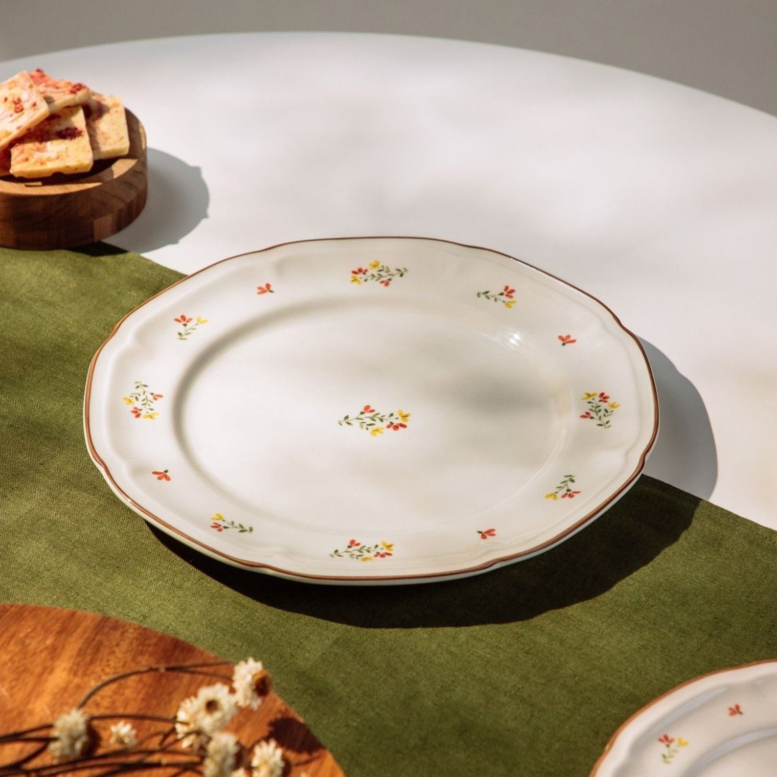 Тарелка изготовлена из высококачественного фарфора, который отличается прочностью и эстетичной красотой. Ее можно мыть в посудомоечной машине и использовать в микроволновой печи, что обеспечивает удобство и комфорт при повседневном использовании.