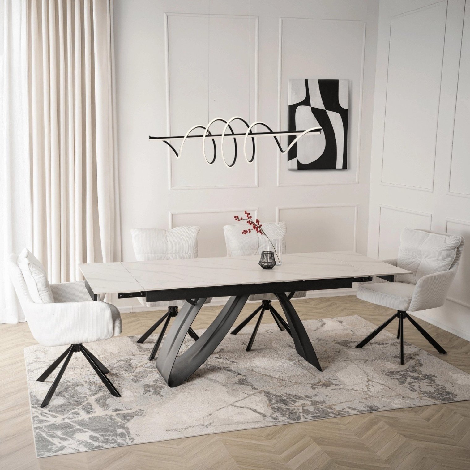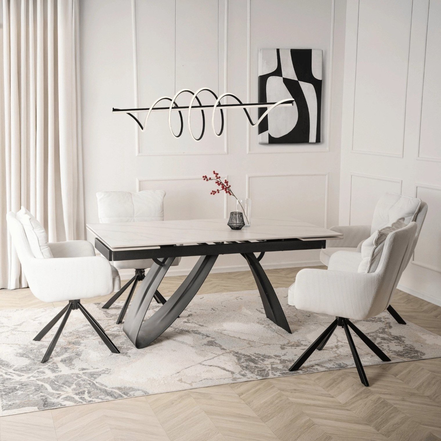 Черно-белая цветовая гамма идеально дополняет современные, минималистичные и элегантные интерьеры. Стол Devon быстро станет центром внимания, привлекая взгляды и обеспечивая комфорт.