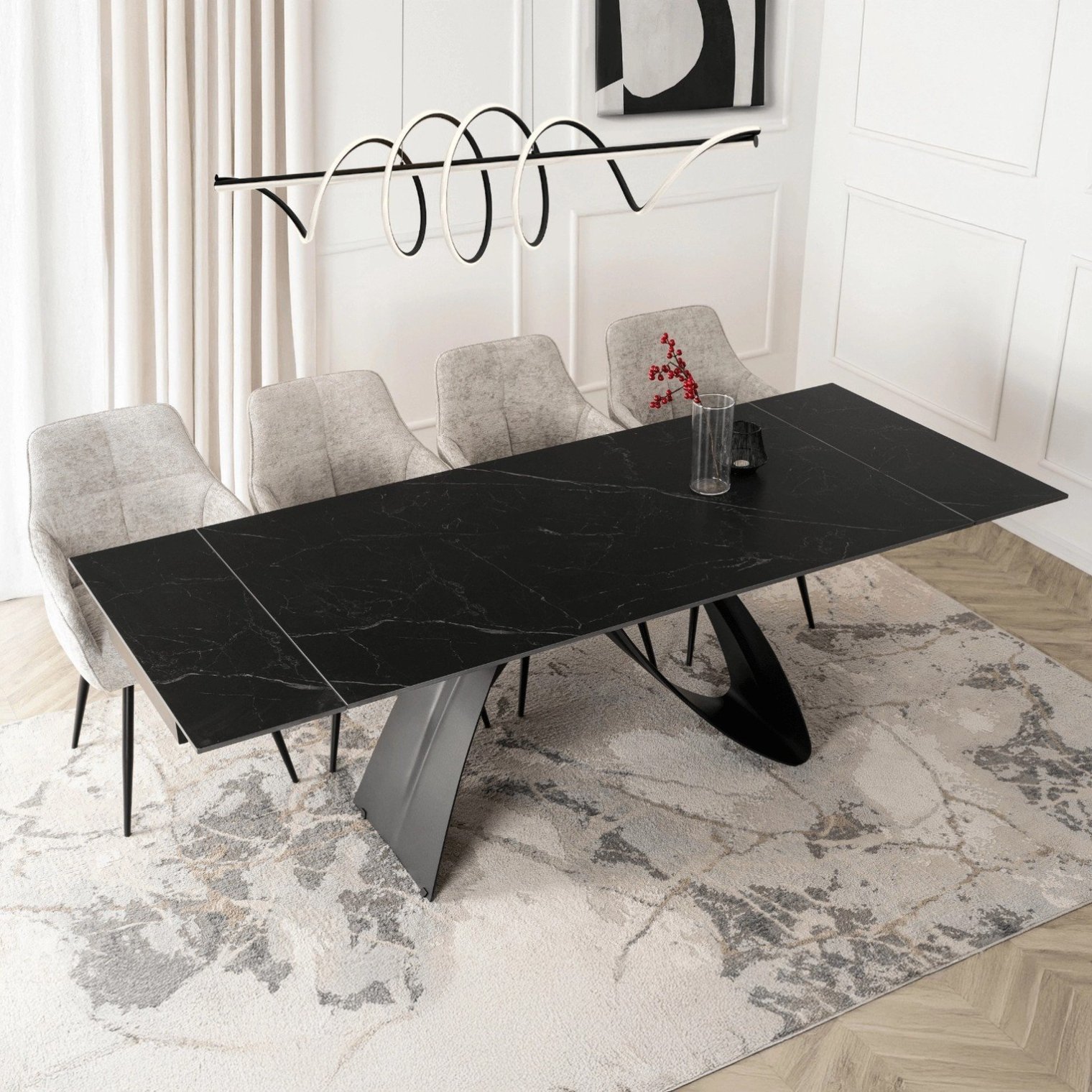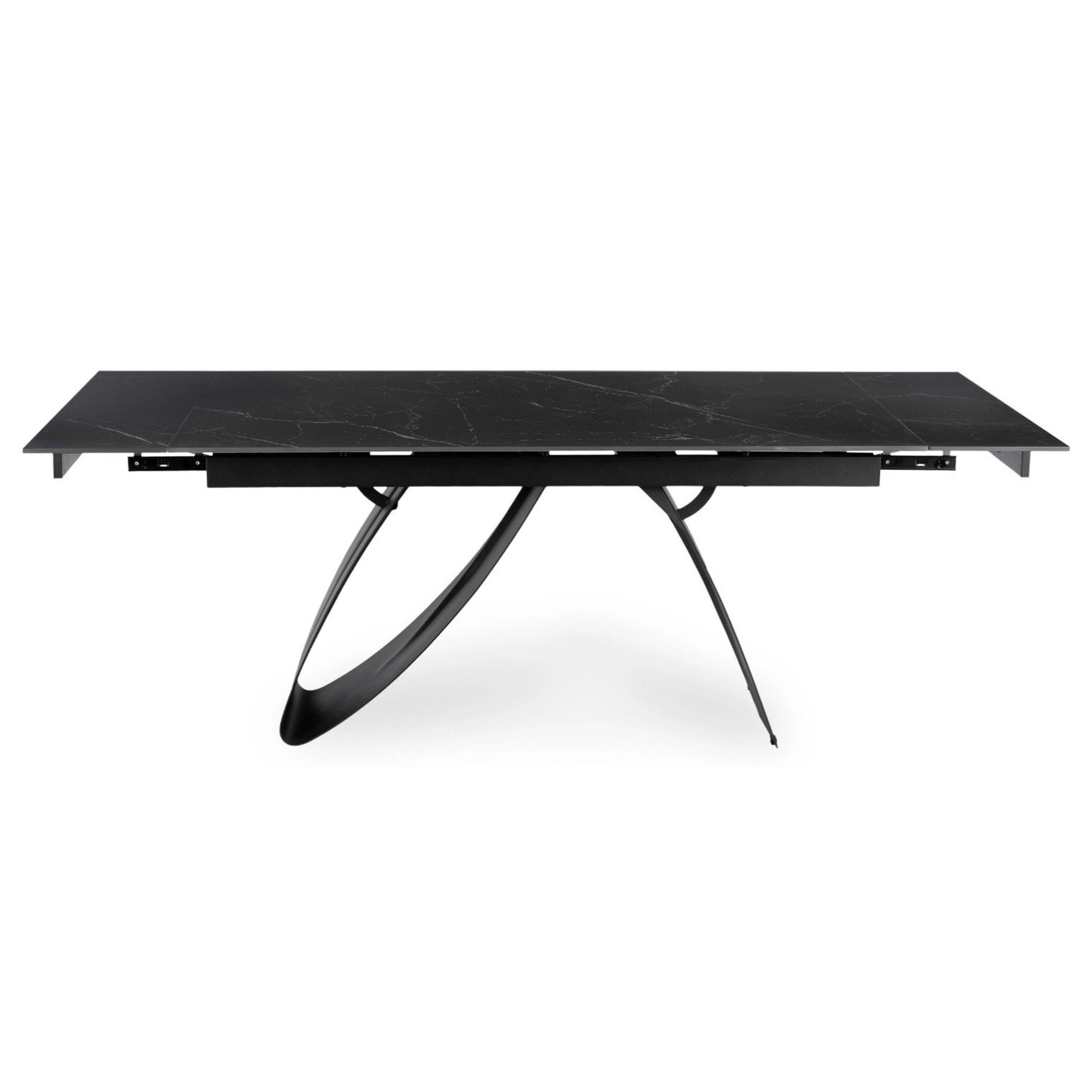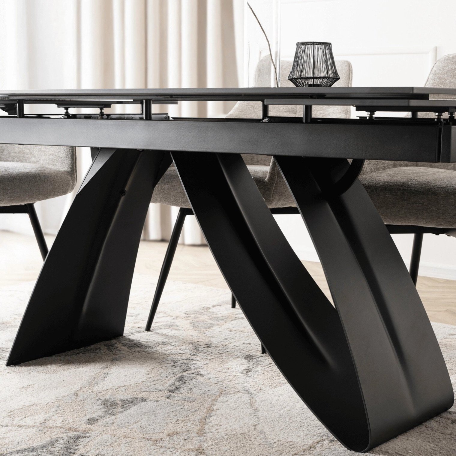 Современная черная металлическая конструкция обеспечивает устойчивость и подчеркивает характер мебели. Сочетание черного основания и черной керамической столешницы создает элегантное, гармоничное целое, идеально подходящее для лофт-, минималистских и современных интерьеров.