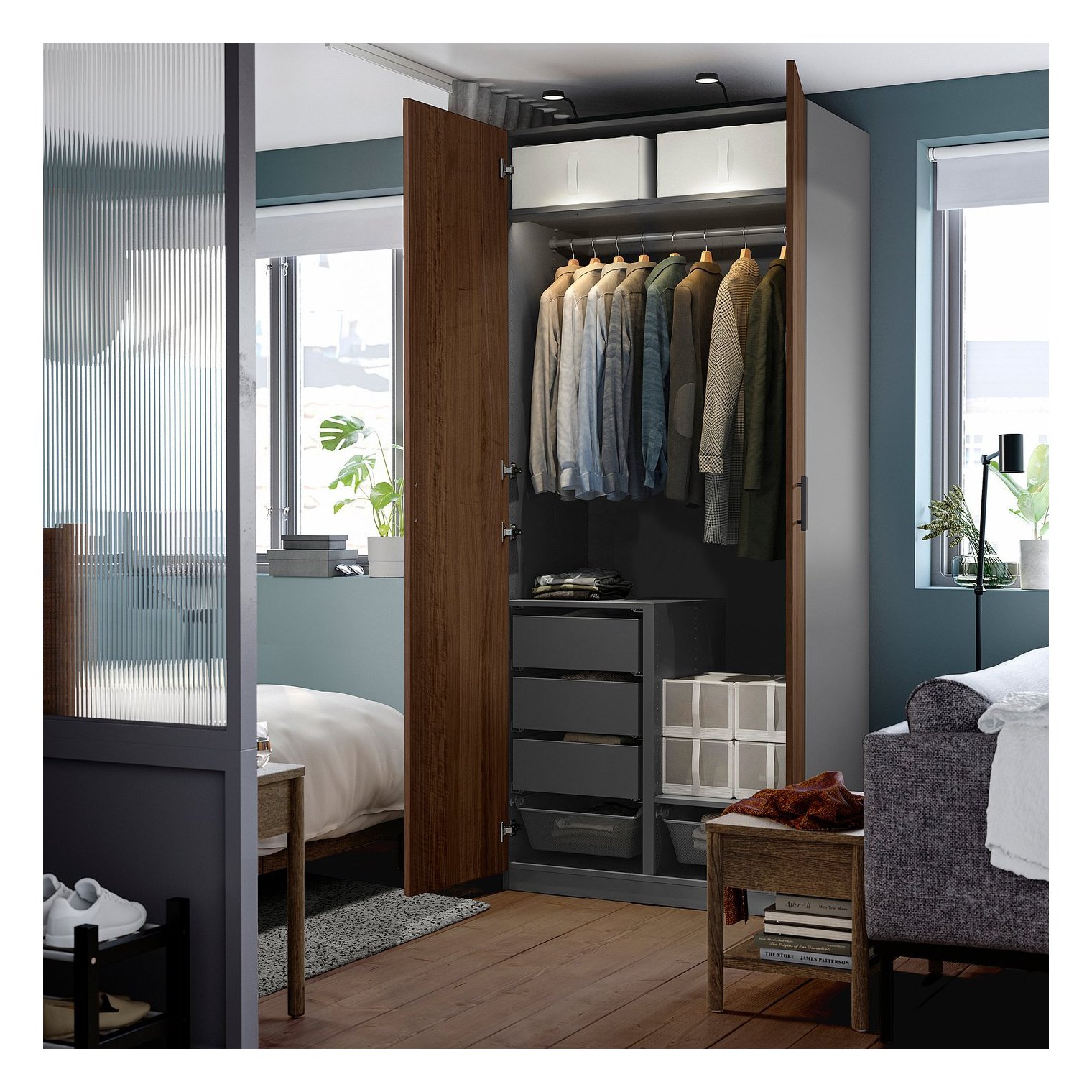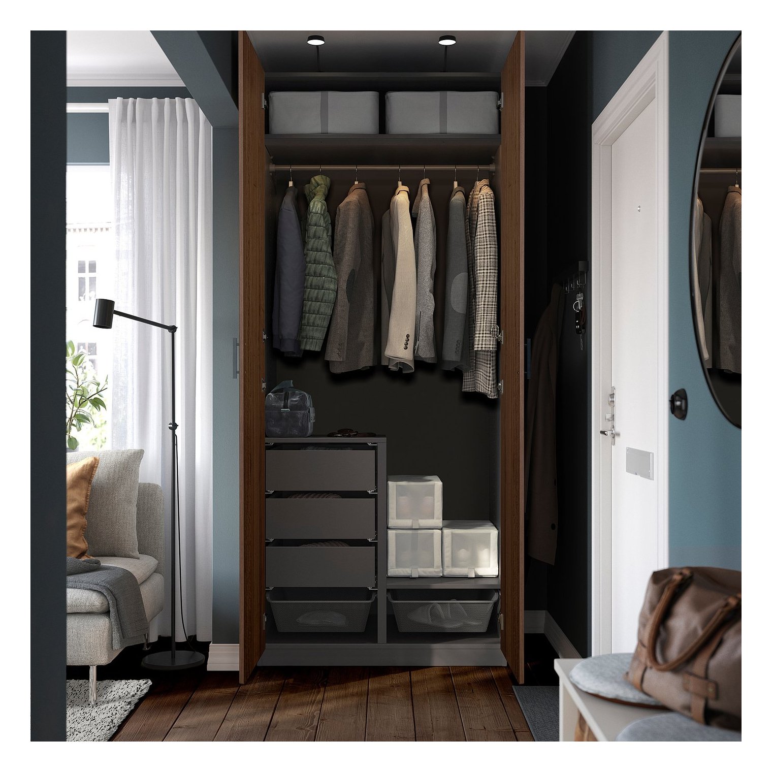 Вместительная вешалка для одежды как длинных, так и коротких размеров. У вас только рубашки одинаковой длины? При желании вы легко можете добавить ящики или корзины.