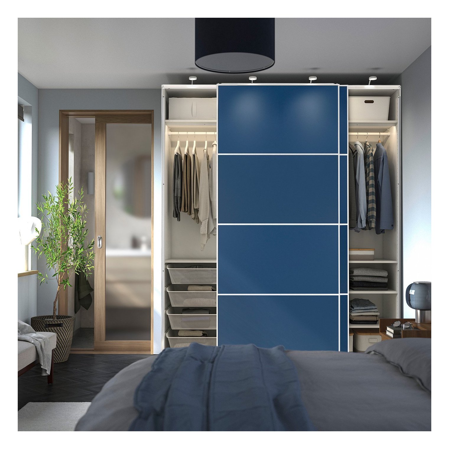 Темно-синий цвет дверей идентичен цвету задних панелей и внутренних поверхностей ящиков в мебельной серии RÅDMANSÖ.