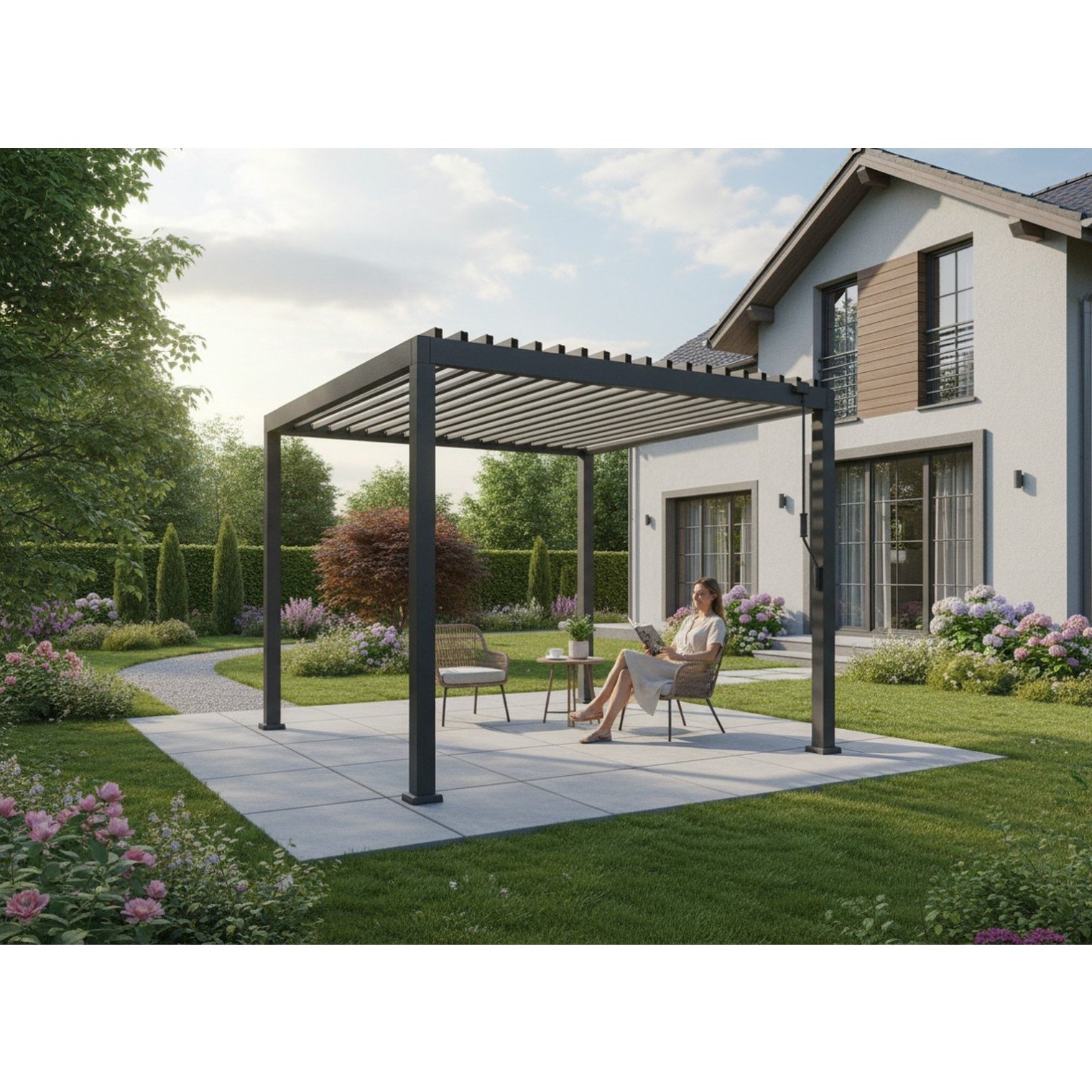 Прочная алюминиевая конструкция и двойные ламели крыши гарантируют стабильность, эффективный отвод воды и высокий комфорт ежедневного использования.