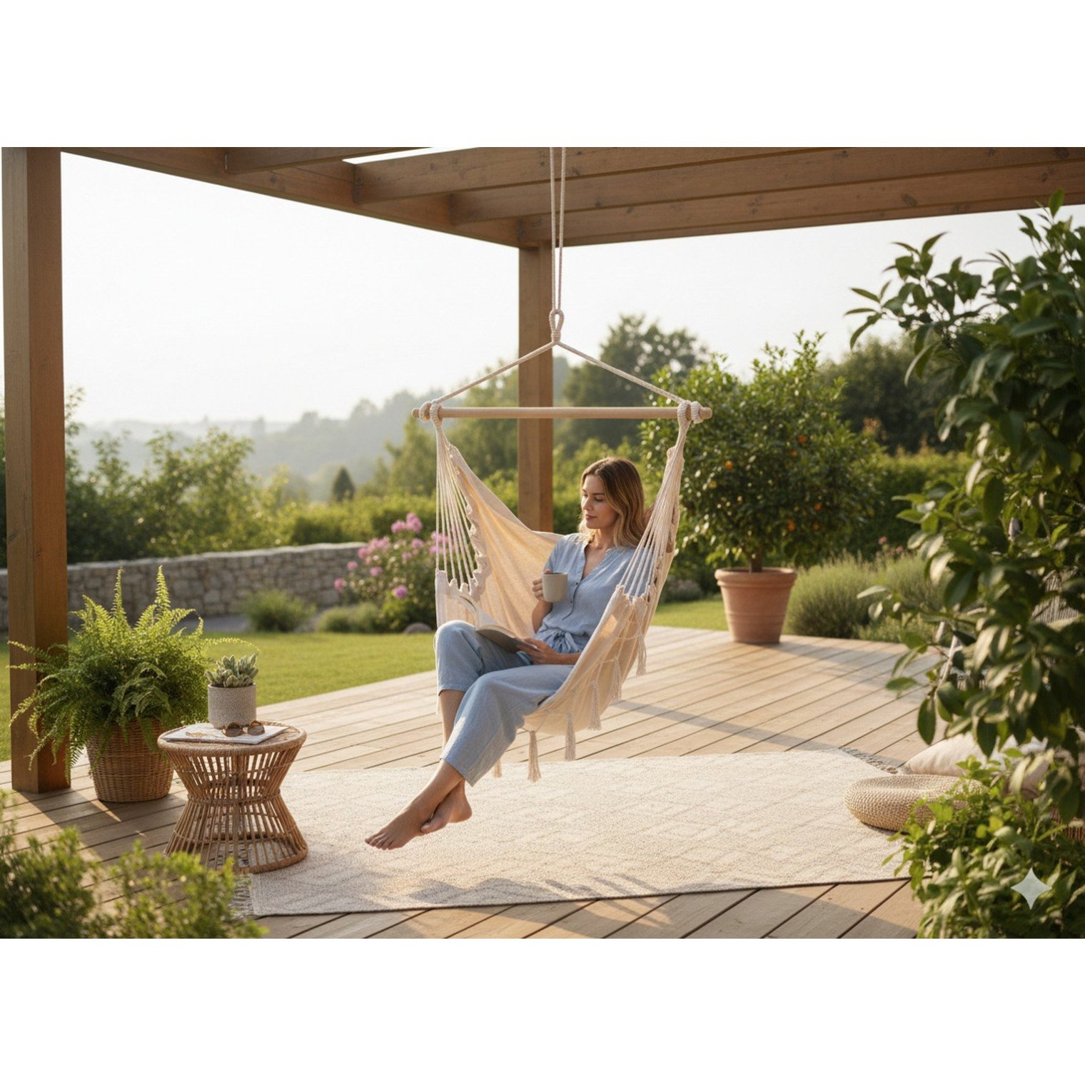 Вам не придется беспокоиться о сложном уходе за креслом-гамаком. Материалы, из которых он изготовлен, устойчивы к атмосферным воздействиям (полиэстер-хлопчатобумажная ткань), а значит, его можно надолго оставить на открытом воздухе, не беспокоясь о повреждениях. Более того, благодаря своим цветам он добавляет элегантности и стиля вашему окружению.