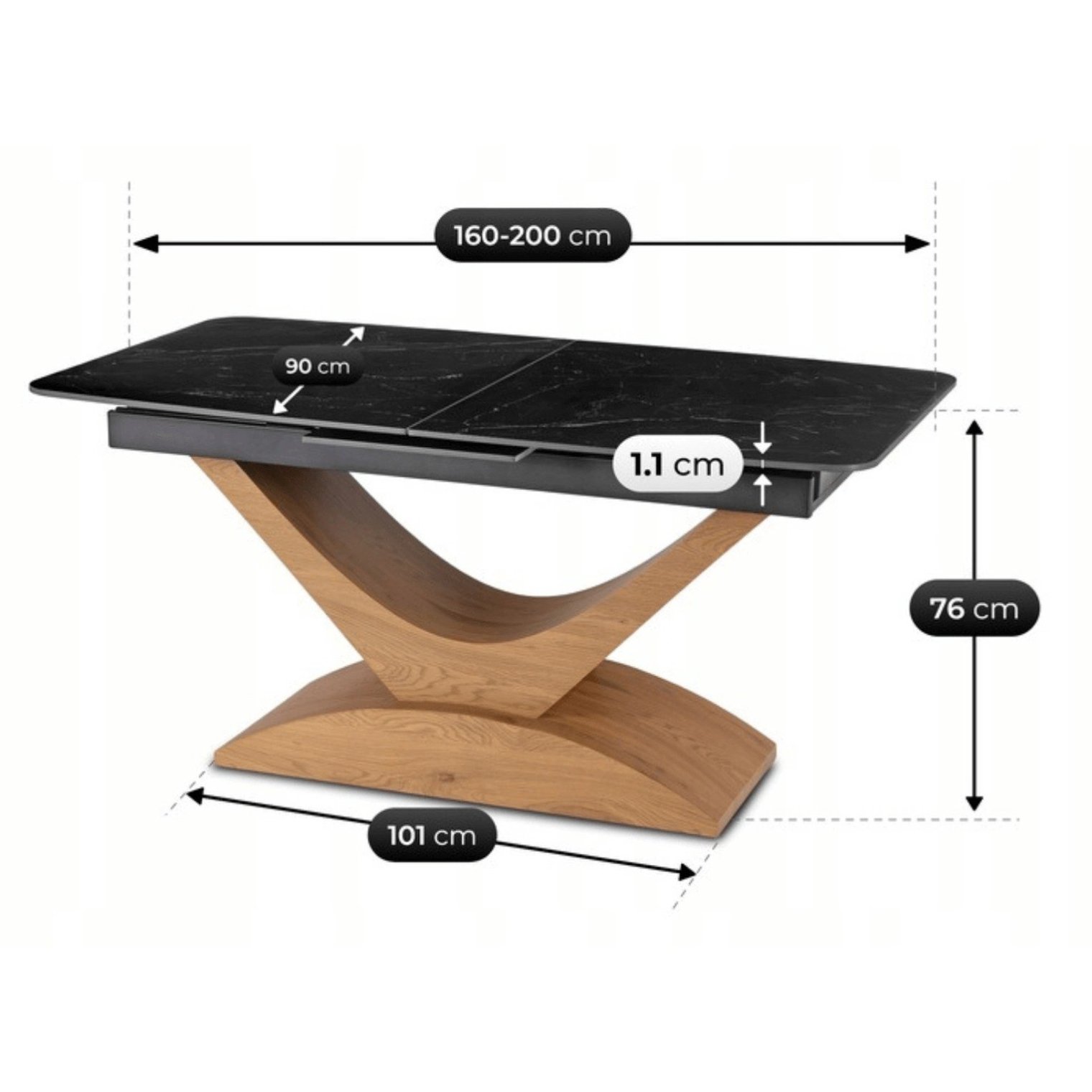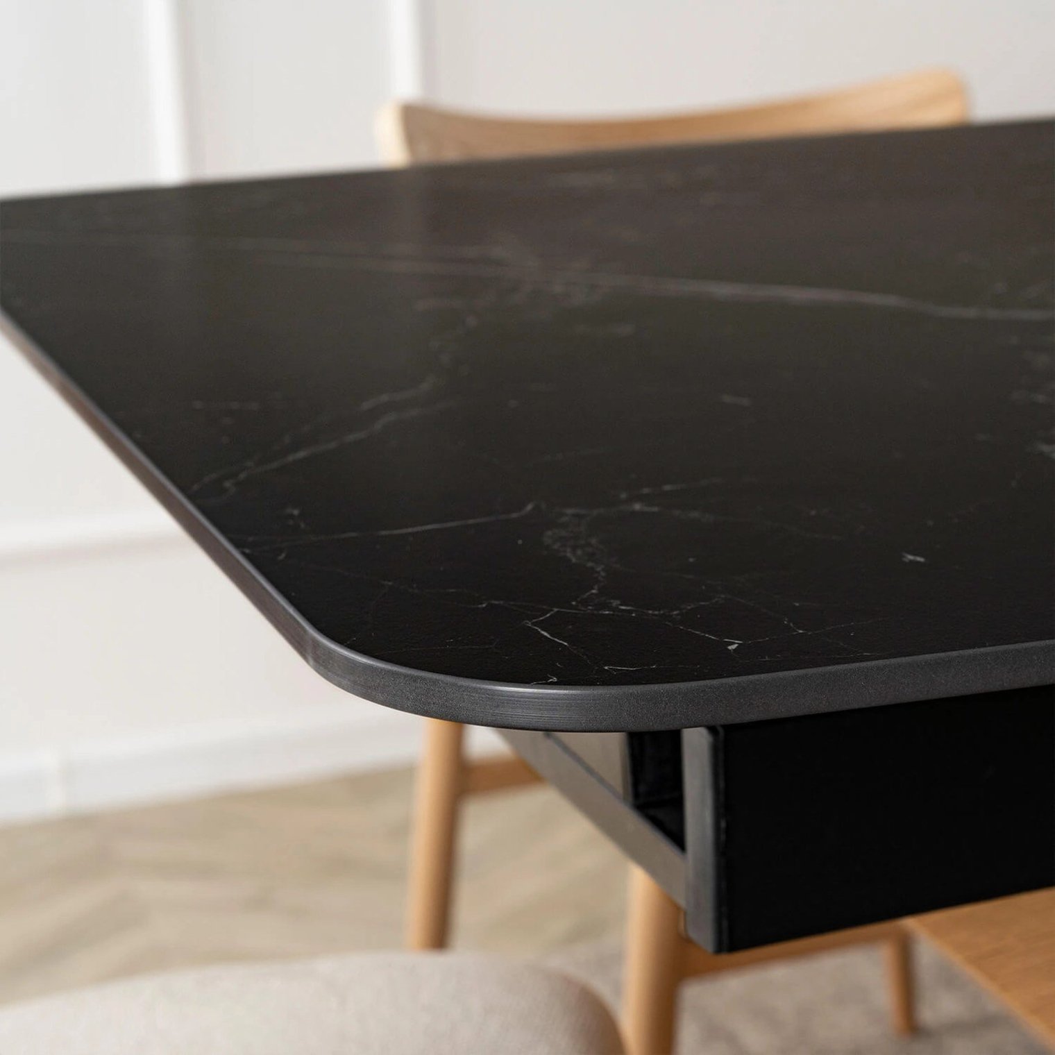 - Черная керамическая столешница (из спеченного кварца) устойчива к царапинам, высоким температурам и износу. Стол невероятно легко содержать в чистоте — достаточно протереть его влажной тканью.