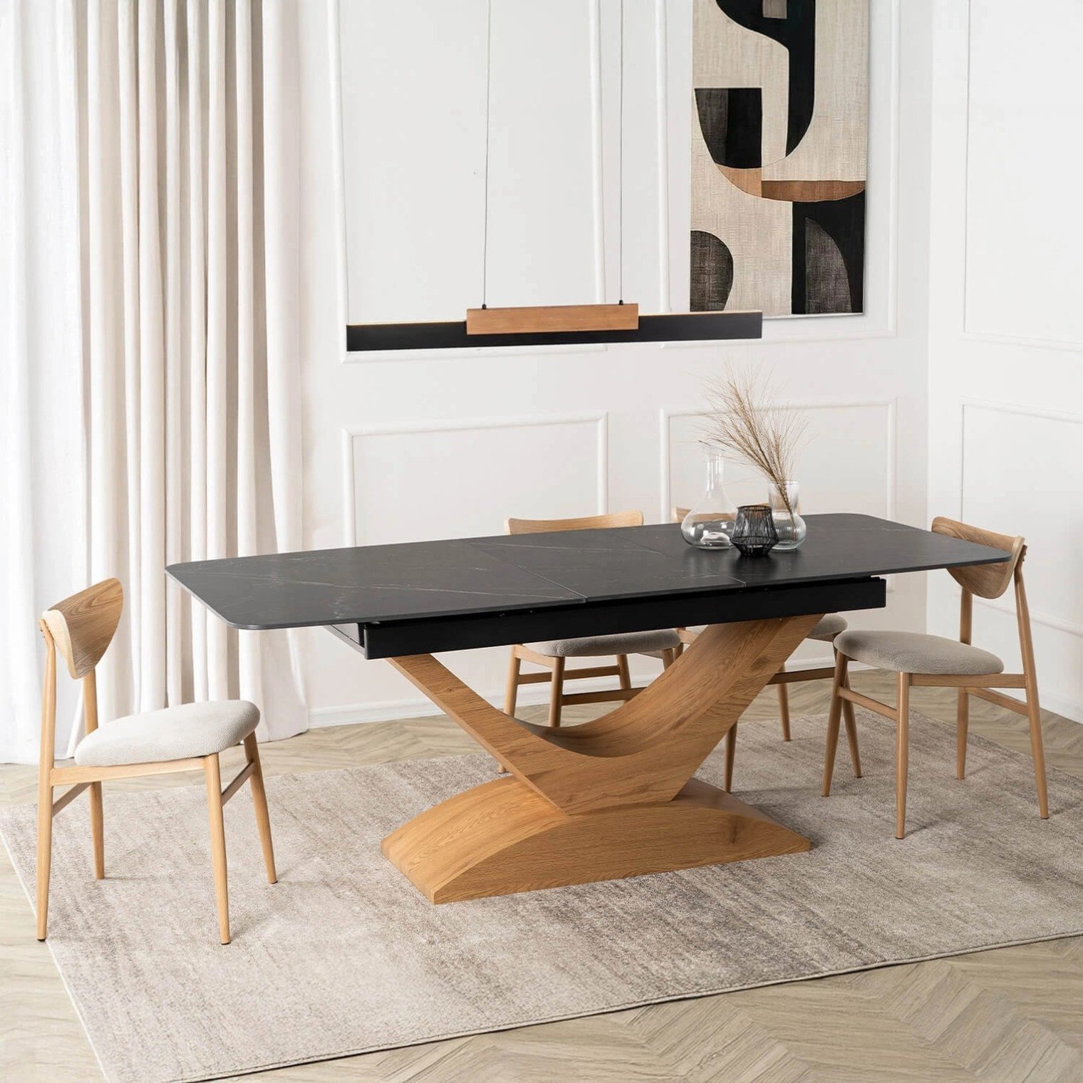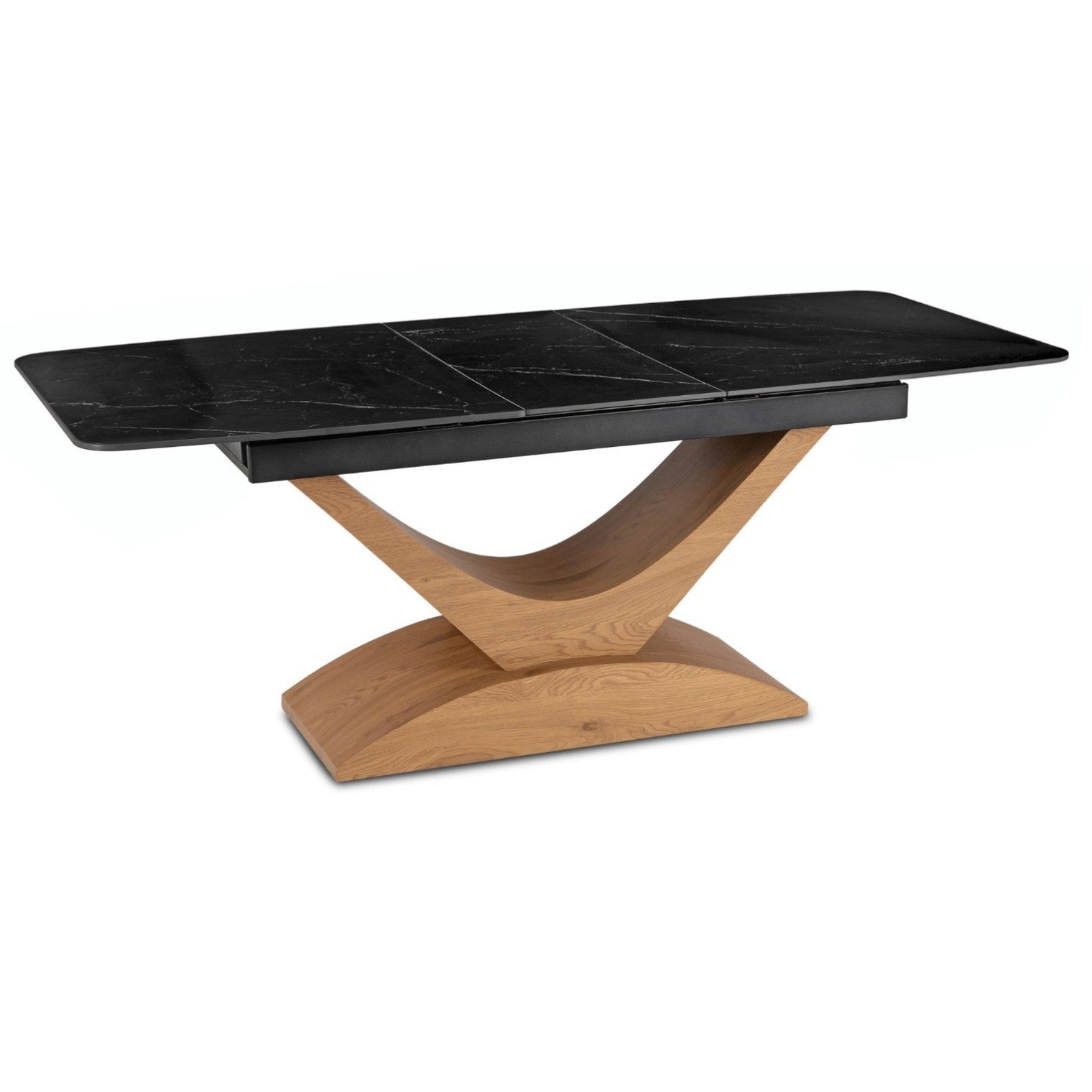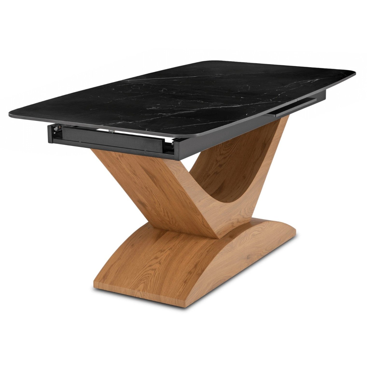 Модель Alicante оснащена незаметным, но функциональным раздвижным механизмом. Это позволяет легко увеличить длину столешницы с 160 см до 200 см. Дополнительная вставка, искусно спрятанная под столешницей, плавно выдвигается по направляющим, сохраняя целостный вид и лёгкость конструкции. В разложенном виде стол вмещает до 10 человек — идеальное решение для семейных посиделок или дружеских вечеринок.