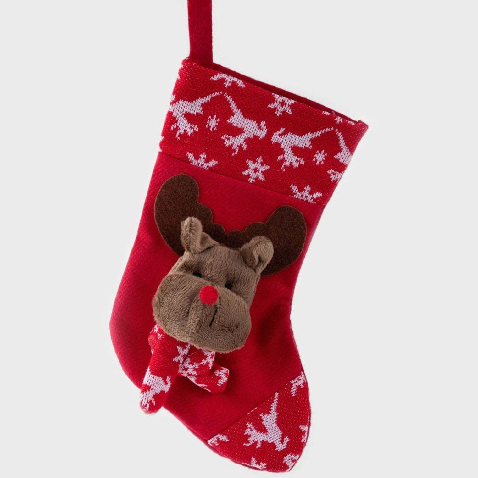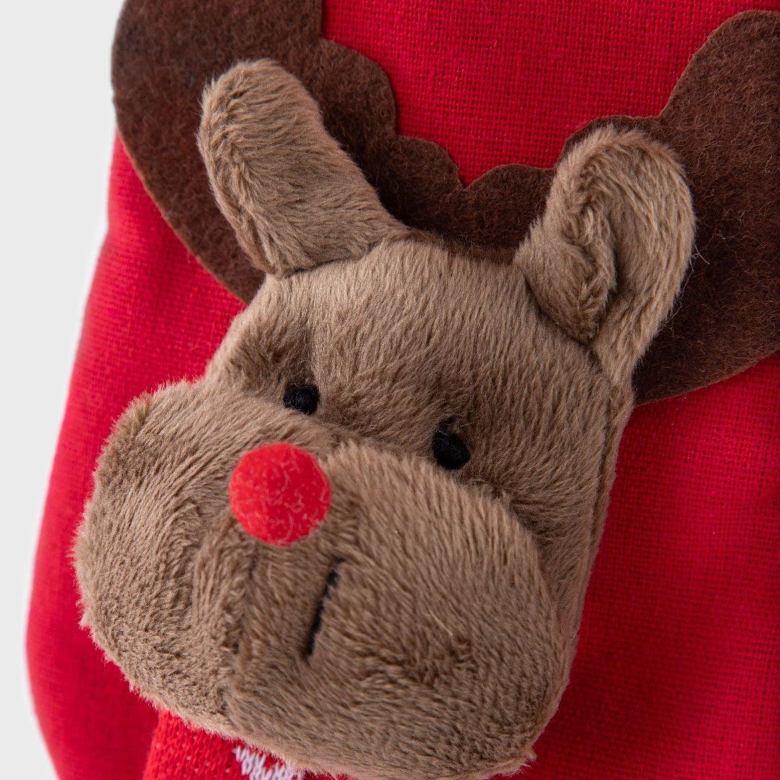 Размер чулка 15х32 см. Он изготовлен из натурального льняного полотна ярко-красного цвета, а отделка связана красно-белым рождественским узором. Чулок украшен коричневой головой лося. Он особенно понравится самым маленьким, так как напоминает очаровательную плюшевую игрушку. Сверху пришита петелька, благодаря которой чулку легко повесить – над камином, на оконную ручку или на крючок.