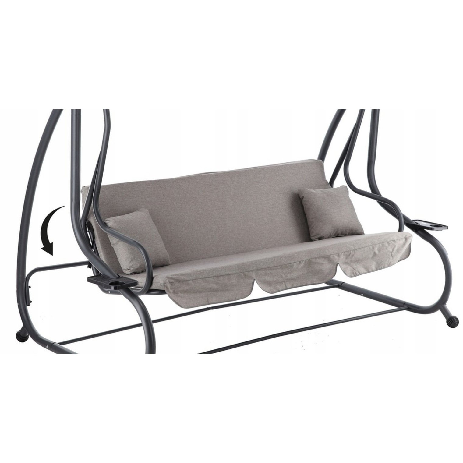 Элегантные и удобные качели прекрасно дополнят декор вашего сада и позволят комфортно отдохнуть на свежем воздухе. Качели оснащены регулируемым навесом. В комплект входят все необходимые соединители, винты и пружины. Скамейка состоит из металлической конструкции, на которой прочный материал растягивается.Внутри упаковки вы найдете инструкцию по сборке, а также все сменные элементы набора.Дополнительно в комплект входят подставки для напитков с обеих сторон и функция кушетки.
