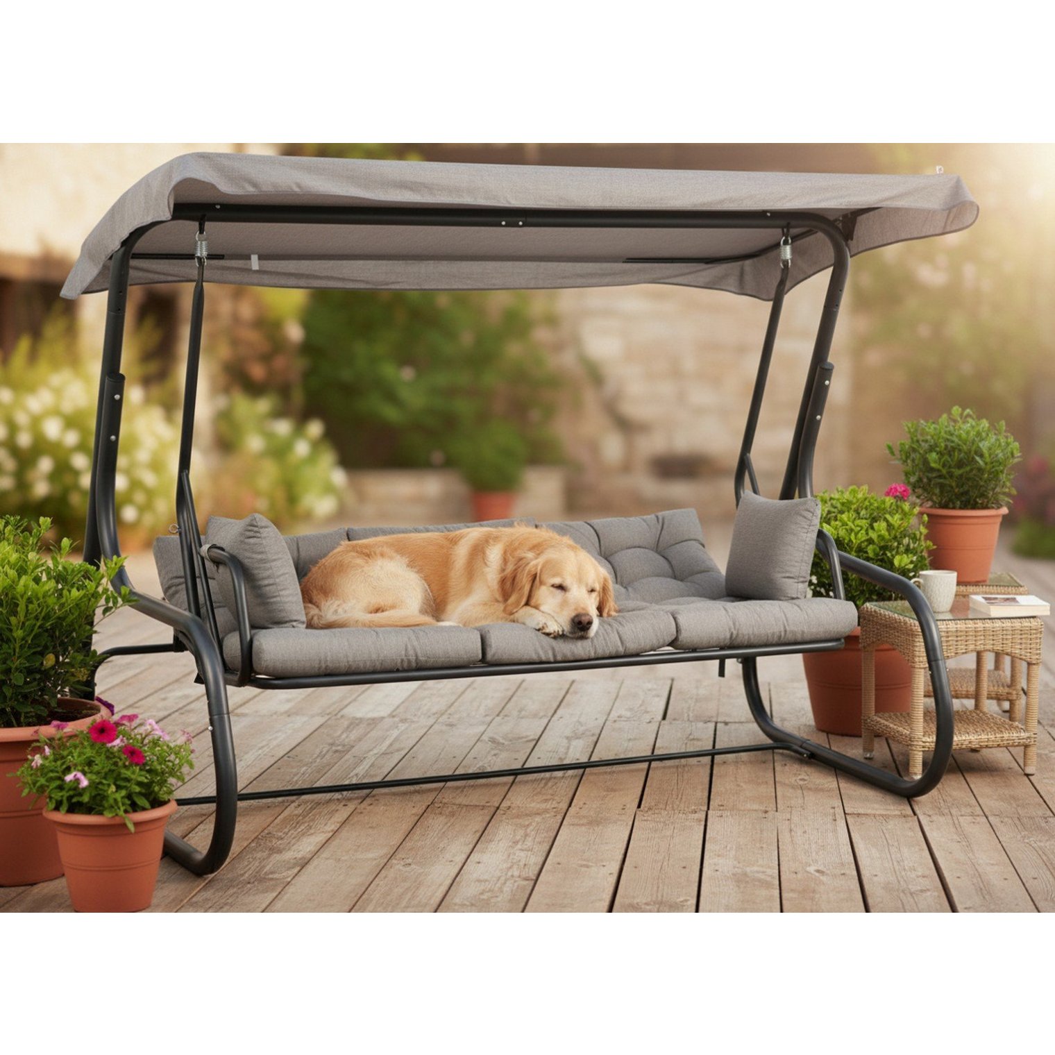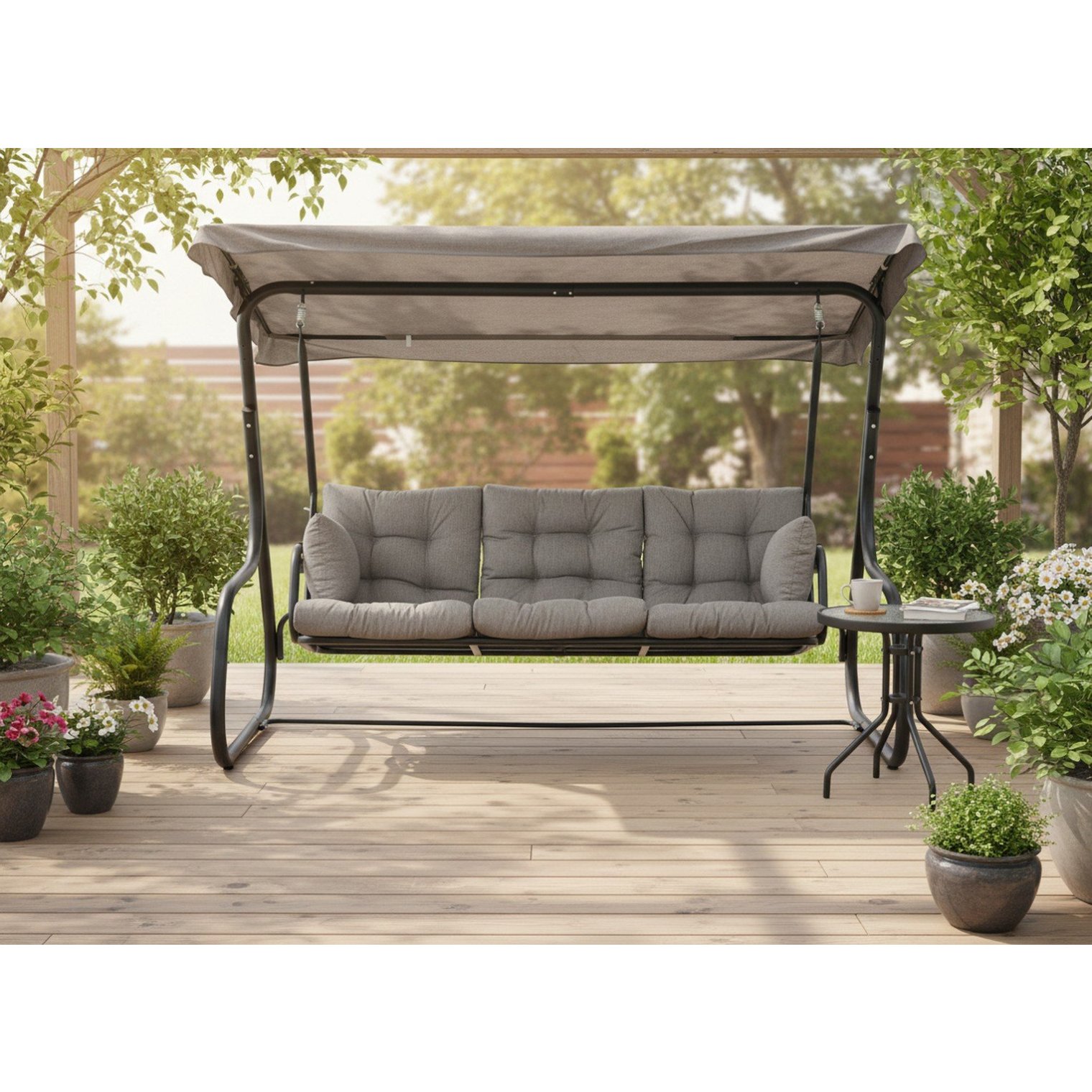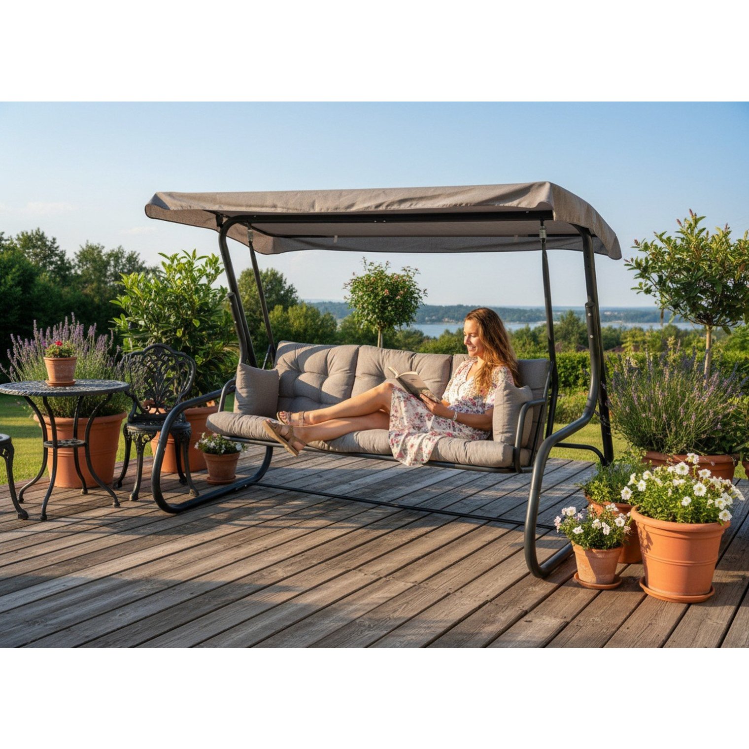 Эта просторная садовая качеля с функцией лежанки — идеальное решение для тех, кто ценит удобство и элегантный вид в садовом оформлении.