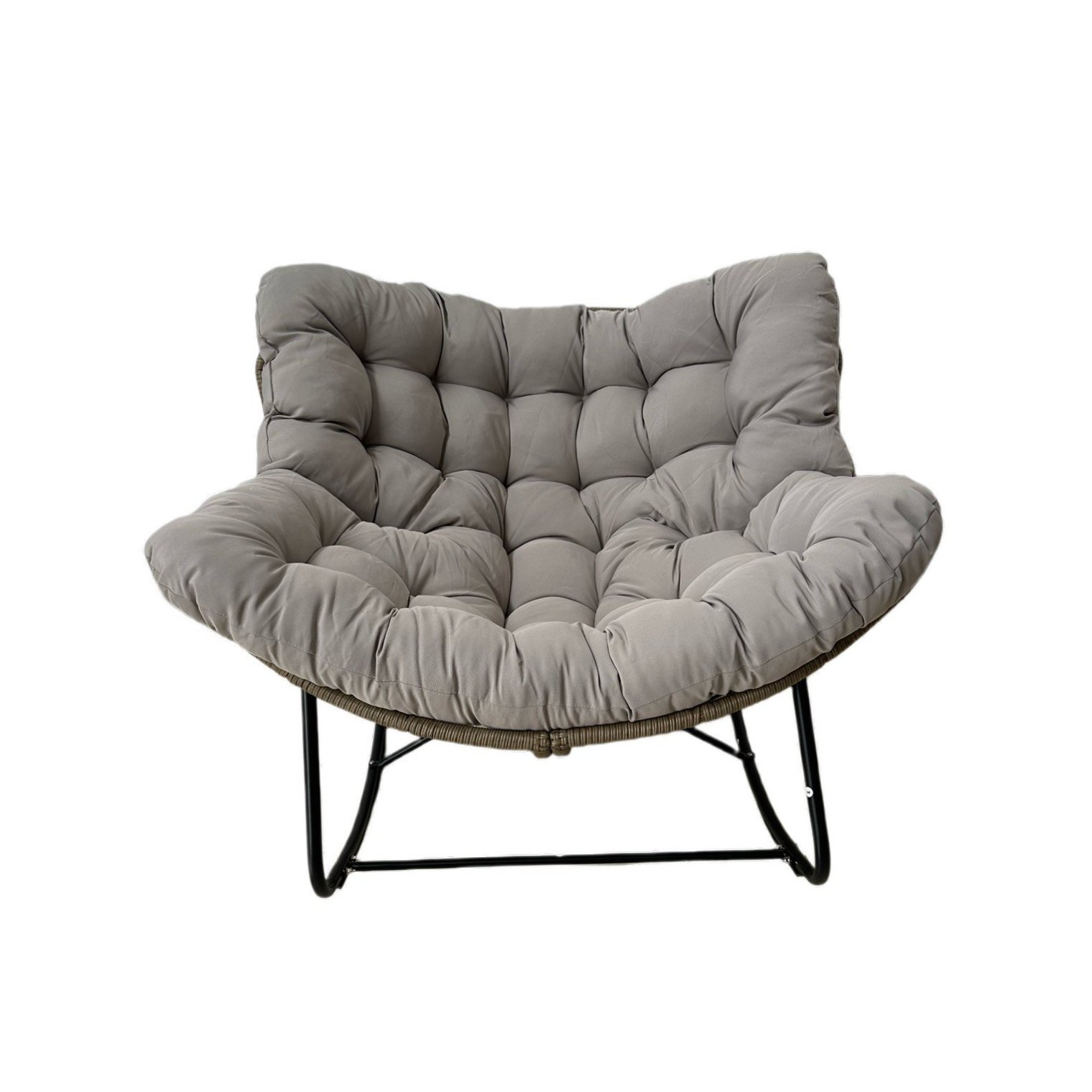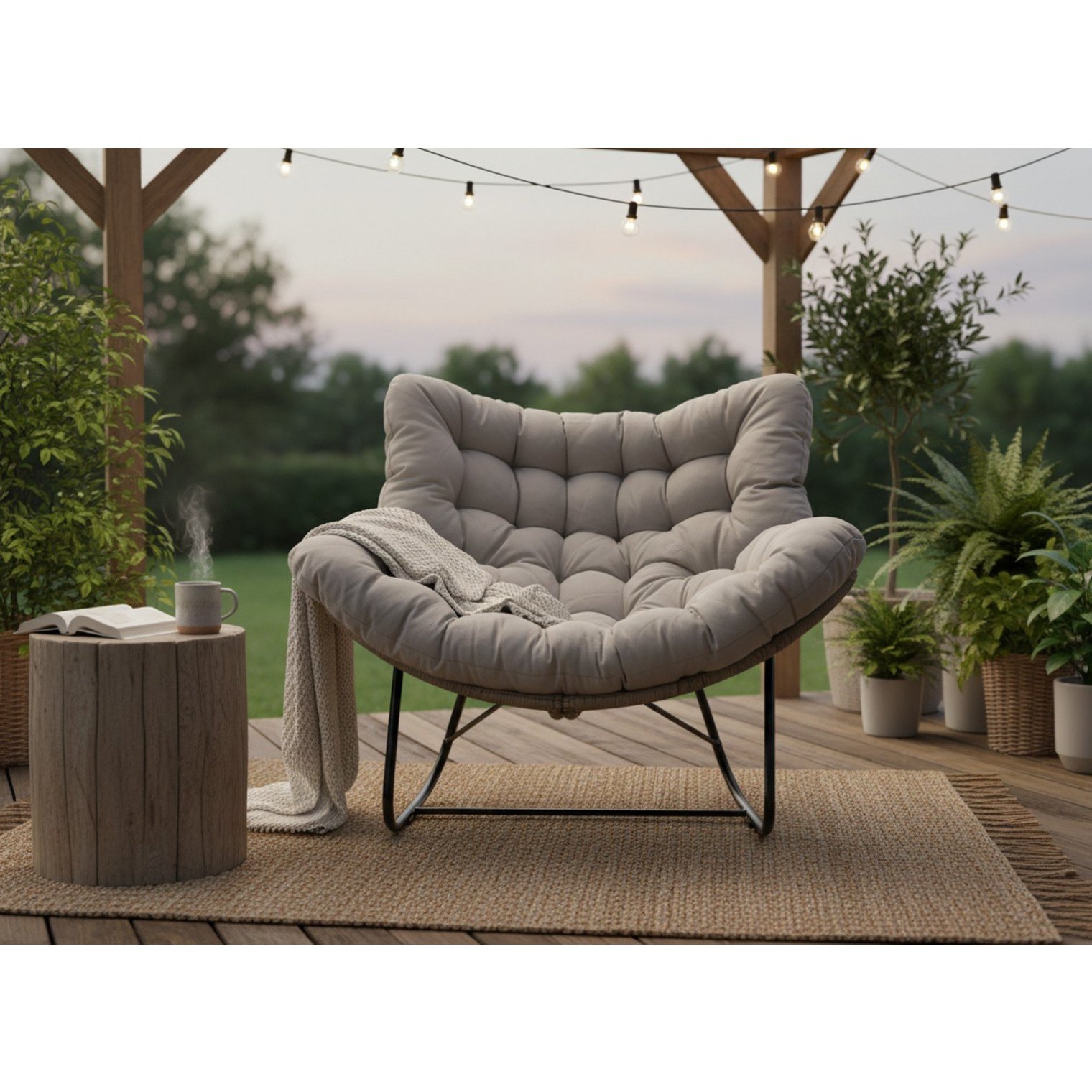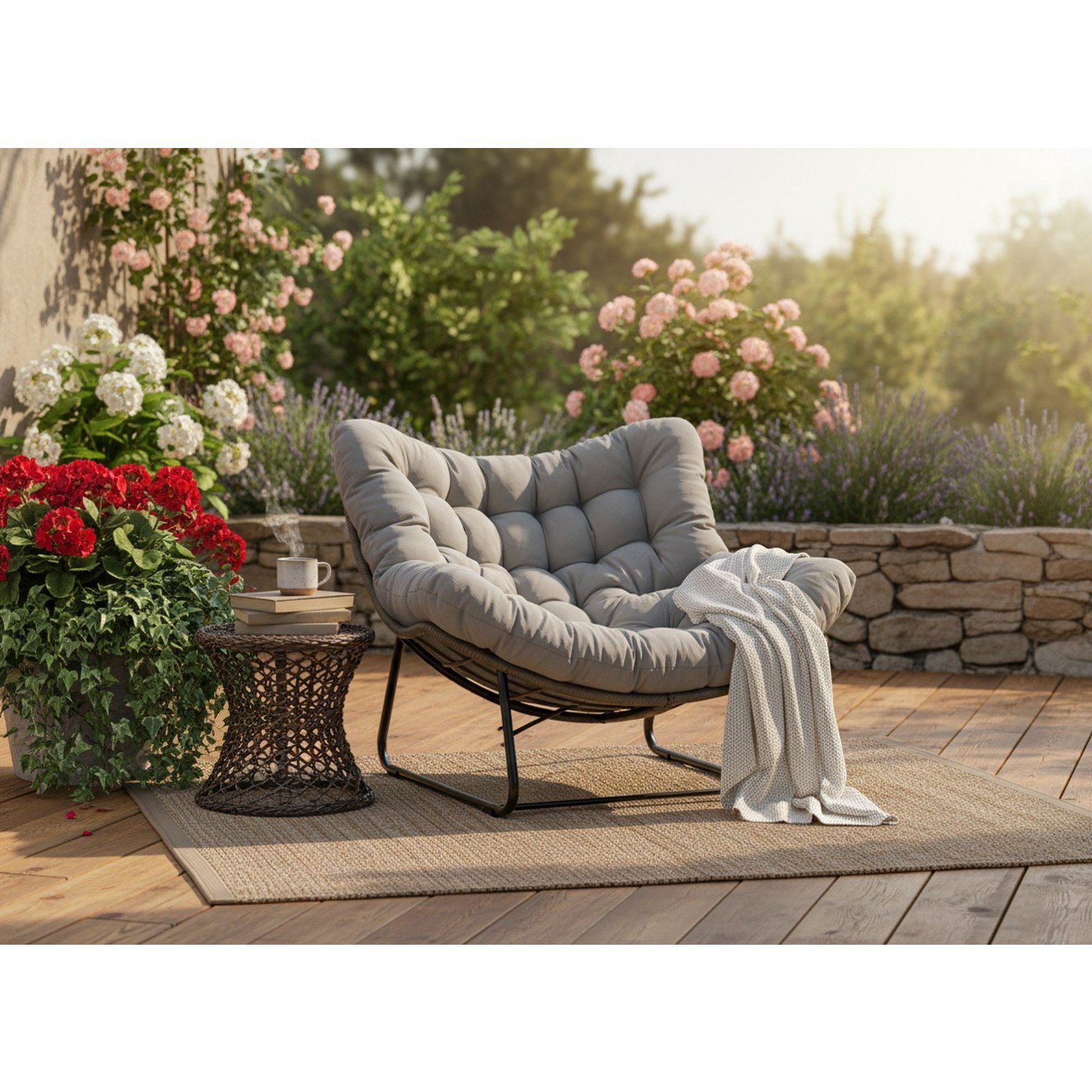Коричневый полиэтиленовый ротанг добавляет уюта, а серые подушки гармонично вписываются в любой интерьер. Прочный стальной каркас и толстое сиденье гарантируют долговечность и комфорт.