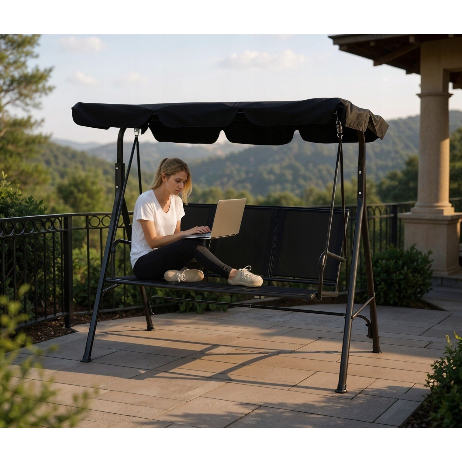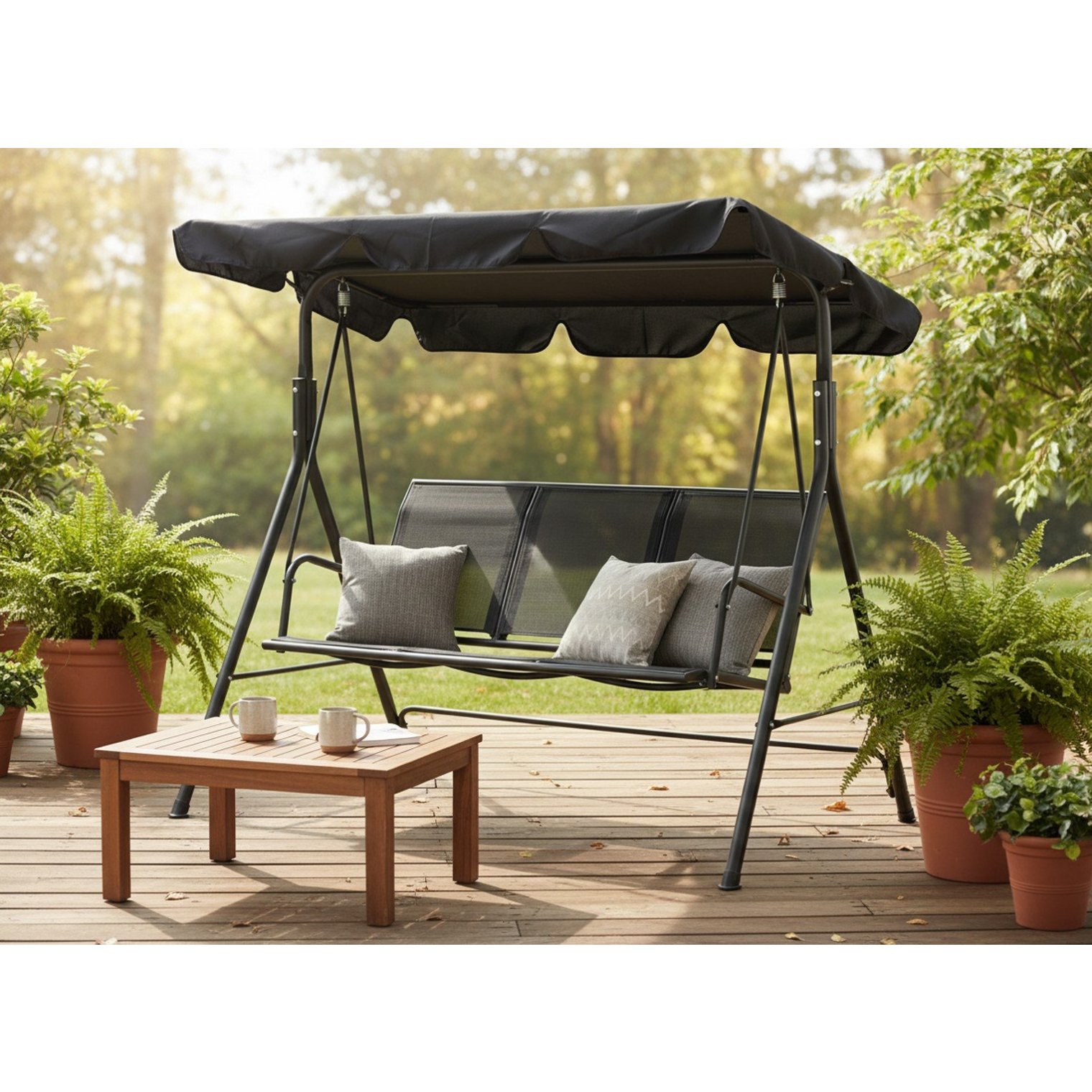 - Эти качели рассчитаны на трех человек и обеспечивают тень благодаря большому навесу