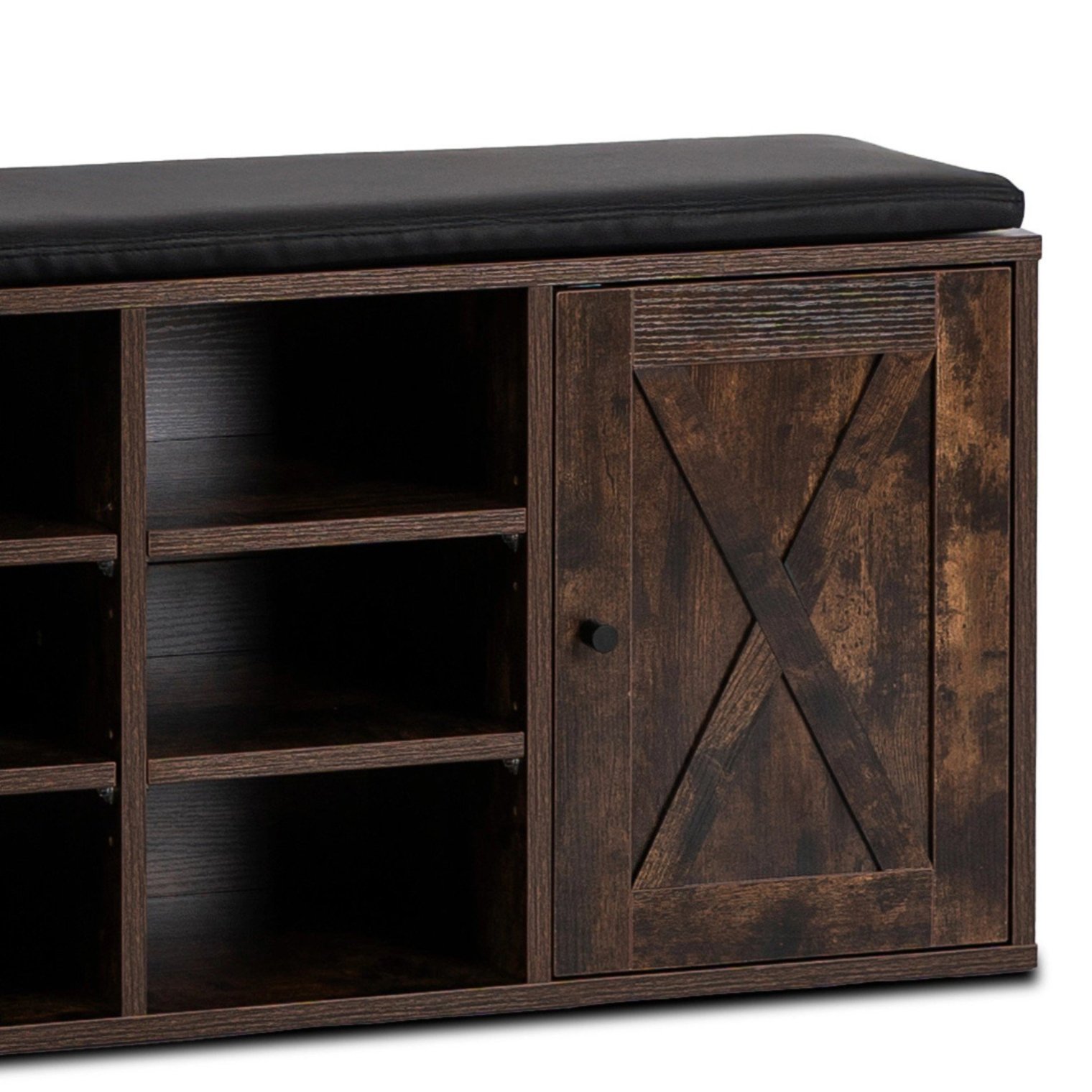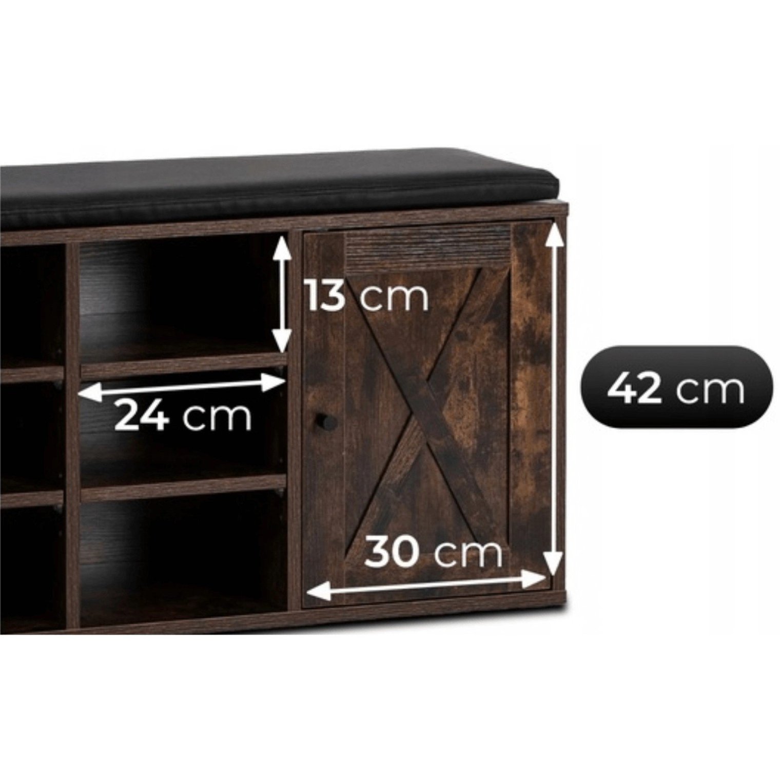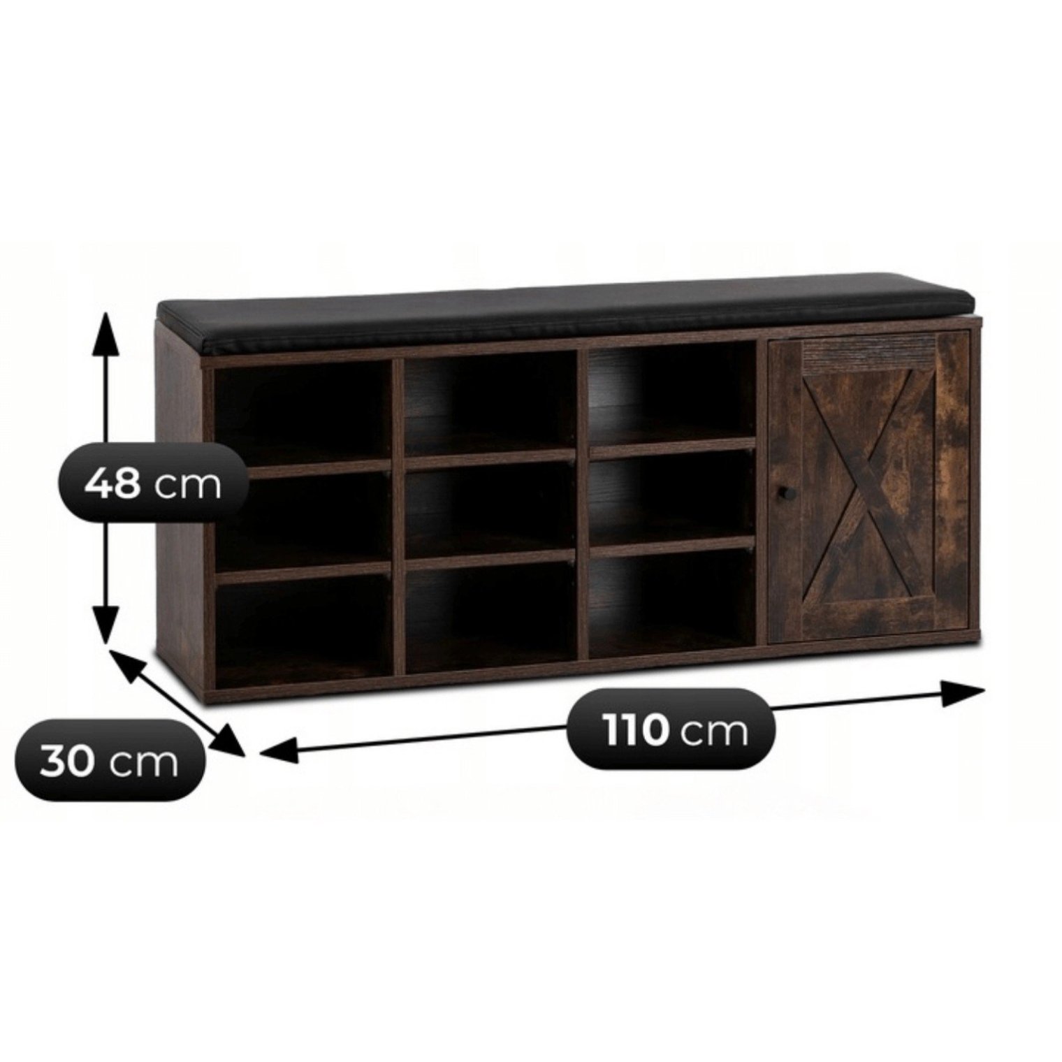 Шкаф для обуви Arya с удобным сиденьем и декоративной отделкой в стиле «амбарные двери» — это предмет мебели, который преобразит любую прихожую. Отделка под состаренный дуб и черная подушка из искусственной кожи создают гармоничное и практичное сочетание.