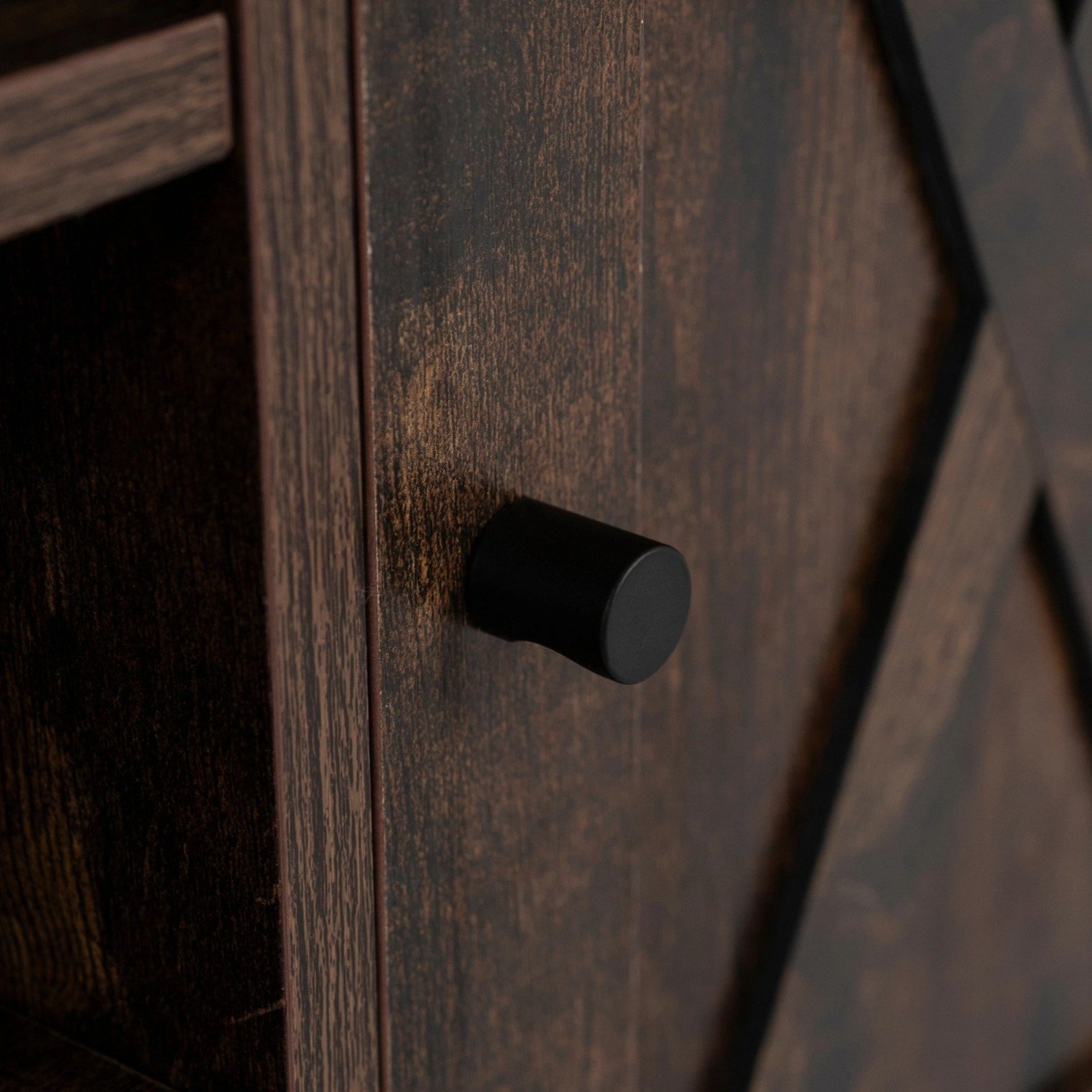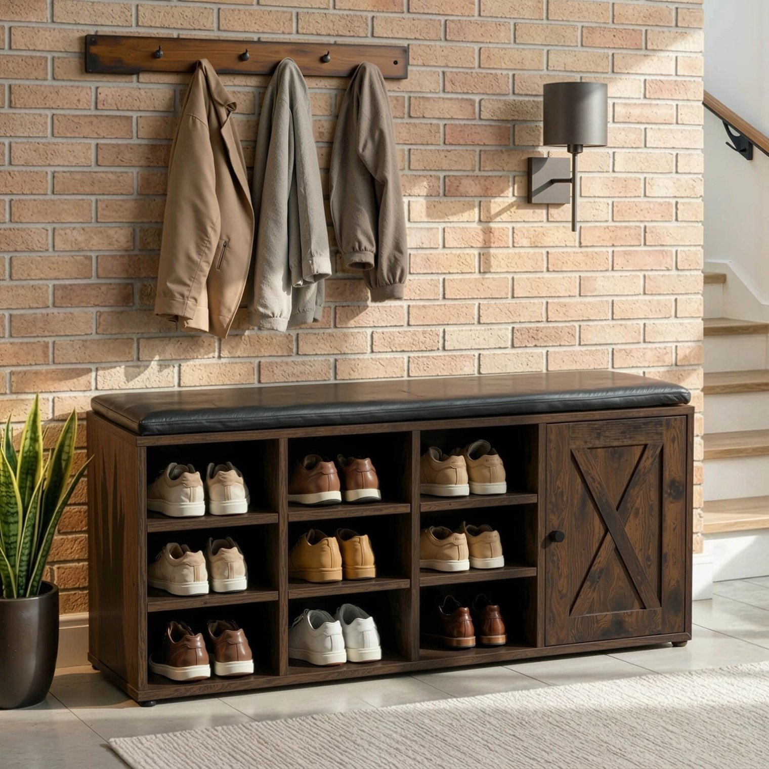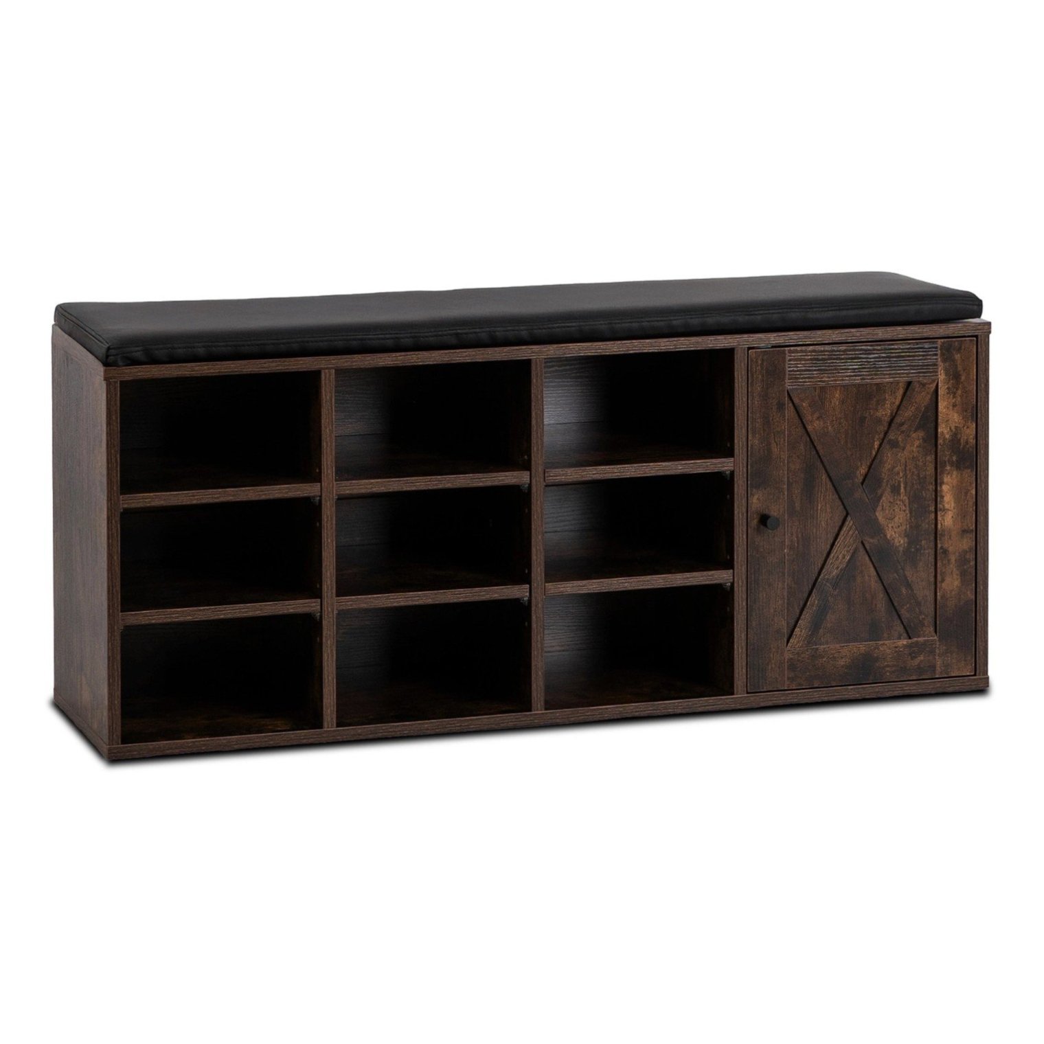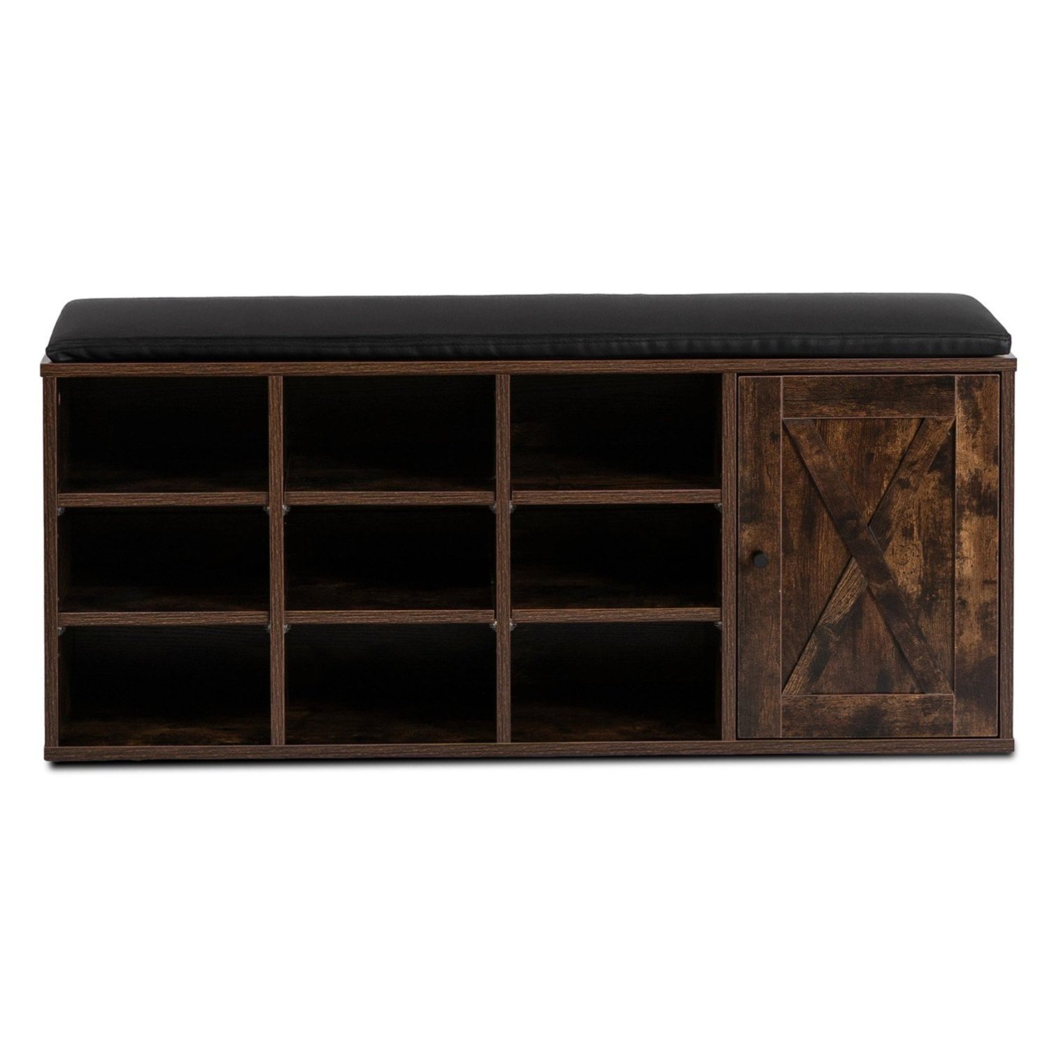 Шкаф для обуви Arya с удобным сиденьем и декоративной отделкой в стиле «амбарные двери» — это предмет мебели, который преобразит любую прихожую. Отделка под состаренный дуб и черная подушка из искусственной кожи создают гармоничное и практичное сочетание.