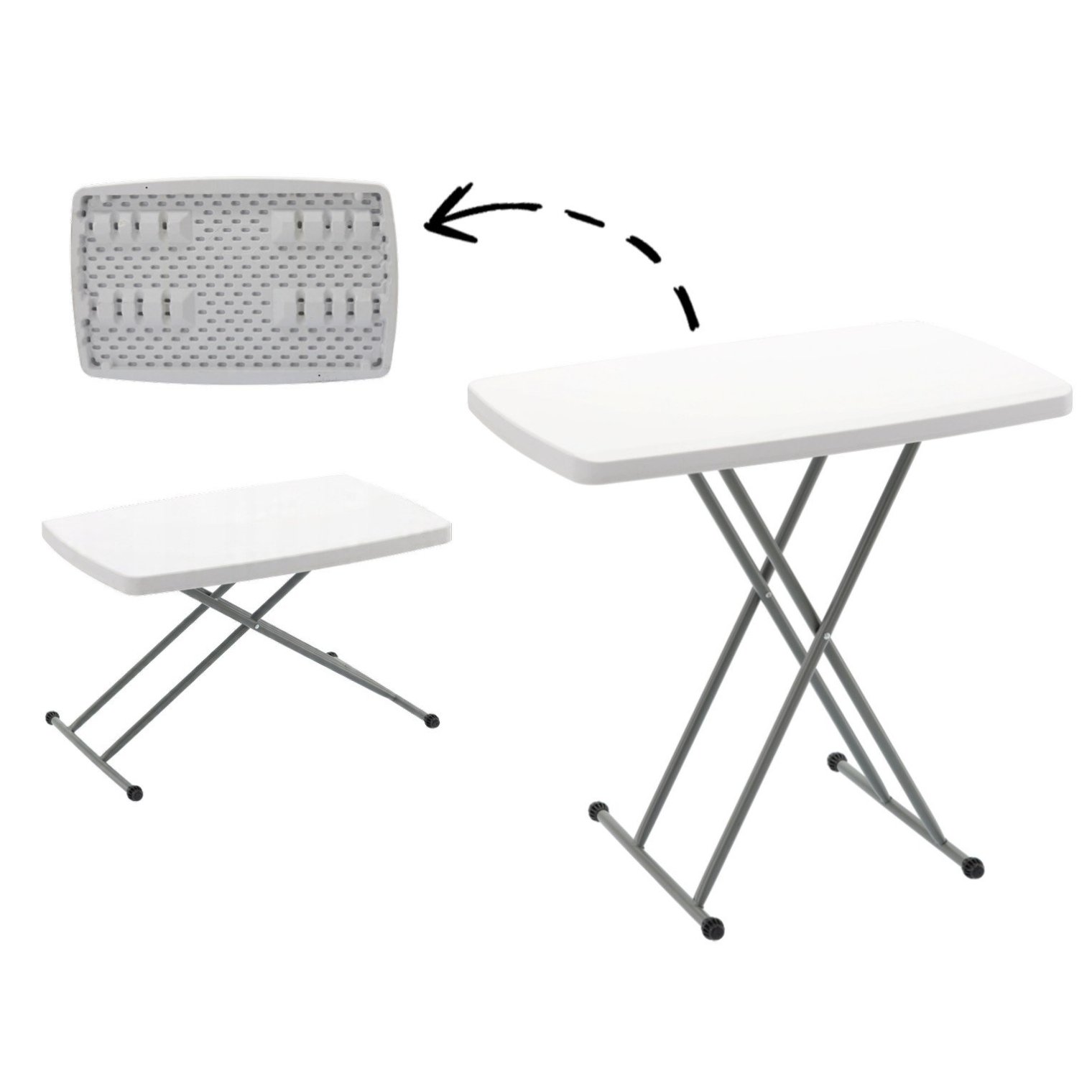 Стабильная конструкция, металлические профили и эстетичная белая столешница обеспечивают долговечность и удобство использования. В сложенном виде занимает мало места, поэтому его легко взять в поездку, на дачу или убрать в кладовку.