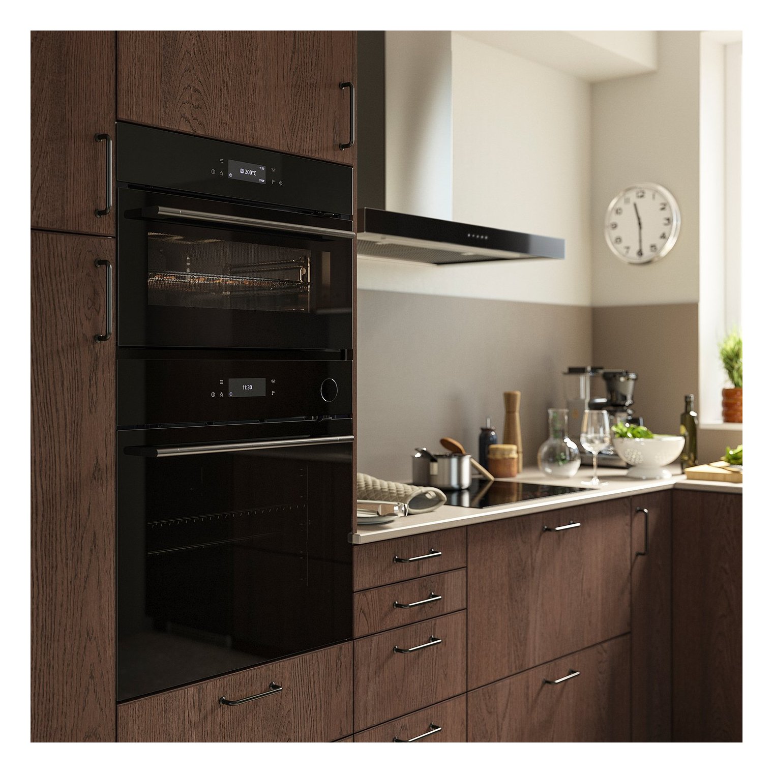 Серия SPJUTBO со стильной черной рамой, дверцами из тонированного стекла и прочными стальными ручками и фурнитурой создает современный, элегантный эстетический вид, который органично вписывается в остальную часть кухни.