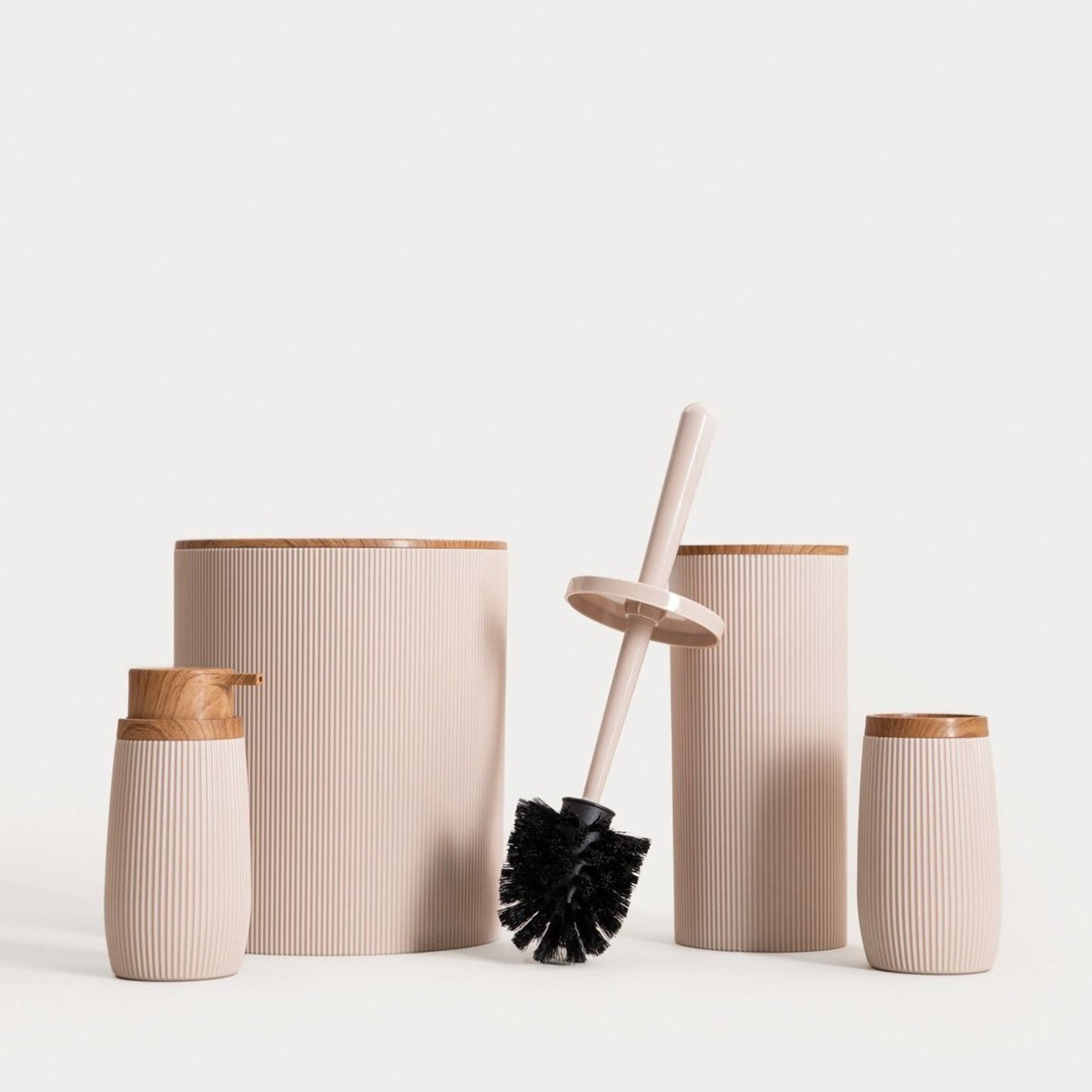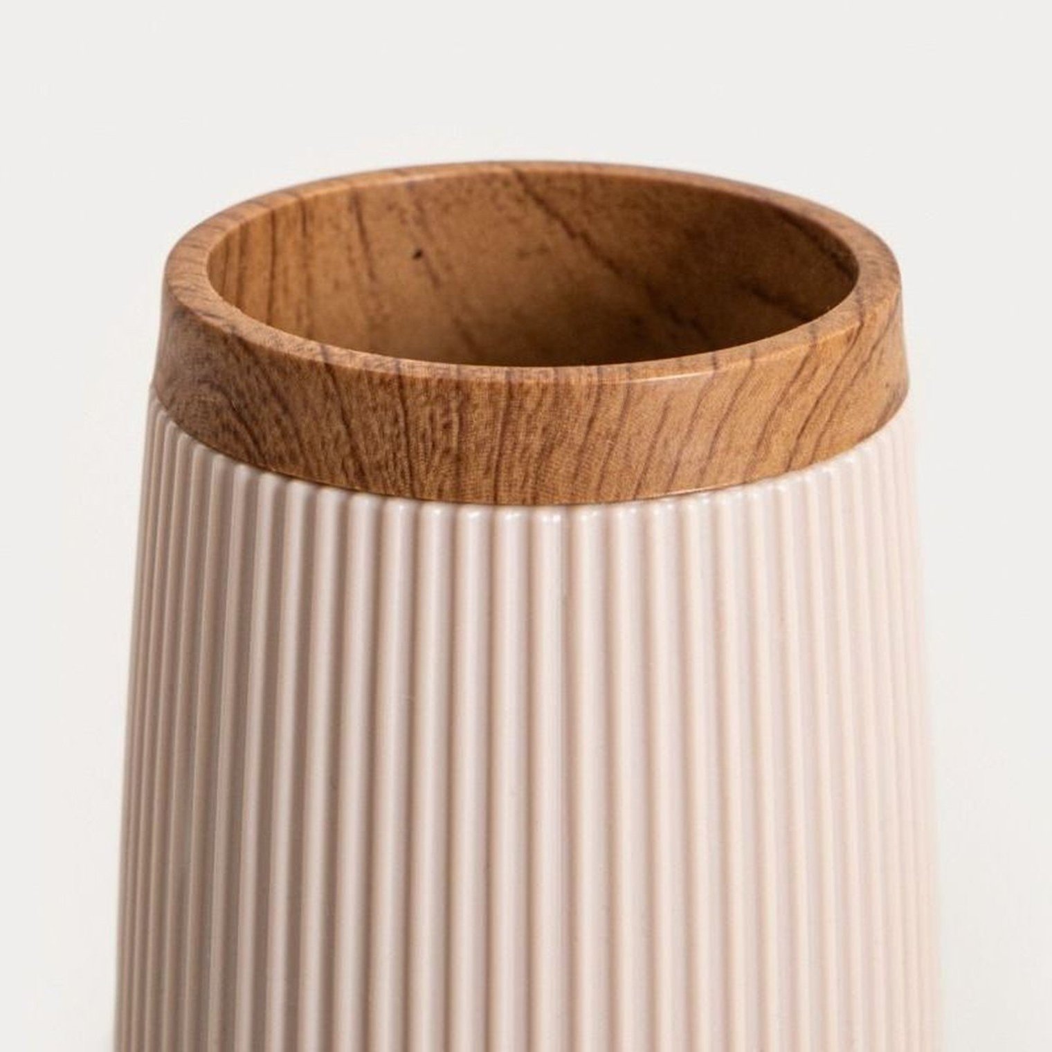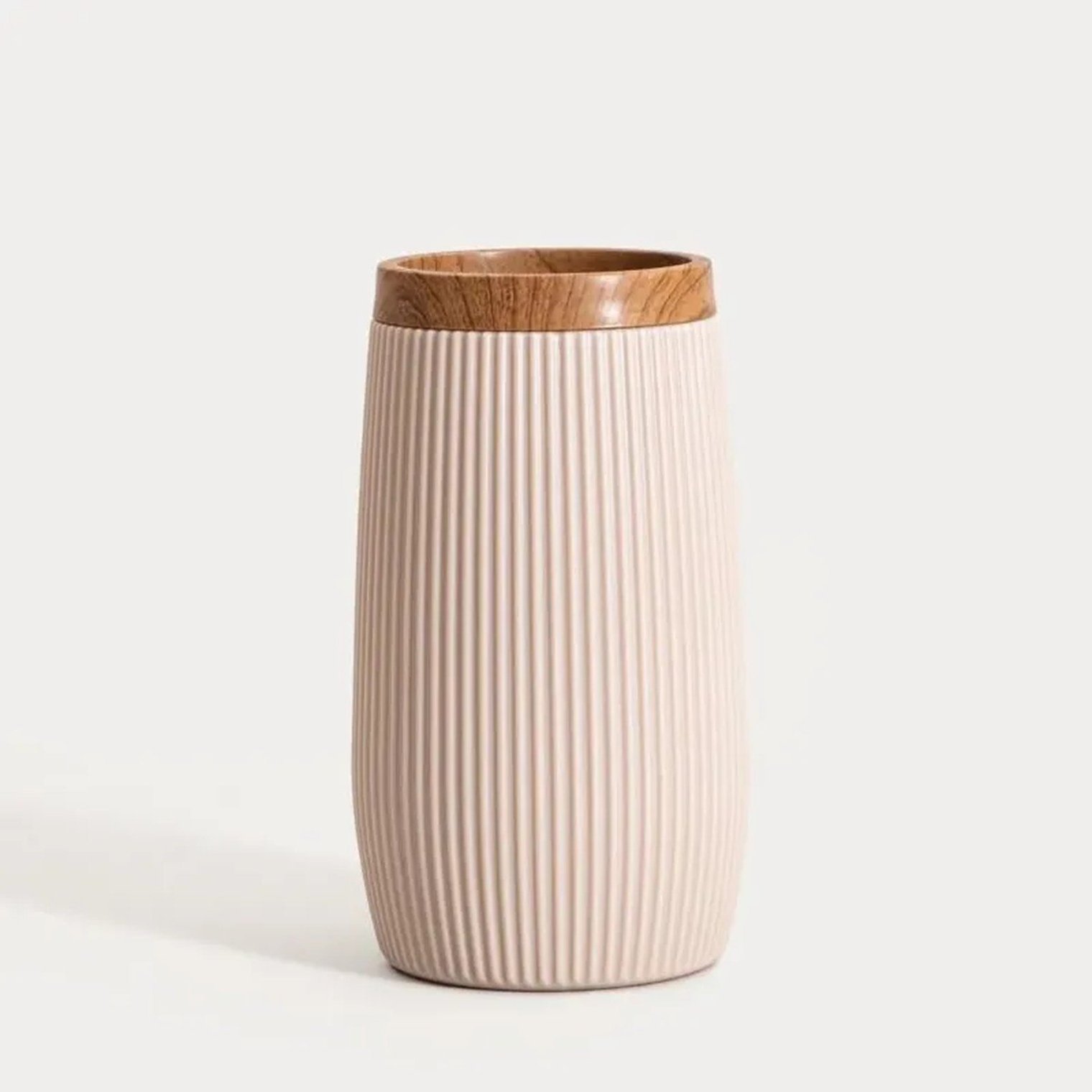 Кружка для ванной DIALL — это эстетически привлекательный и функциональный аксессуар, который идеально дополнит современную ванную комнату. Ее нежный бежевый цвет в сочетании с вертикальными бороздками придает ей элегантный минималистичный вид, а отделка под дерево подчеркивает теплый характер изделия.