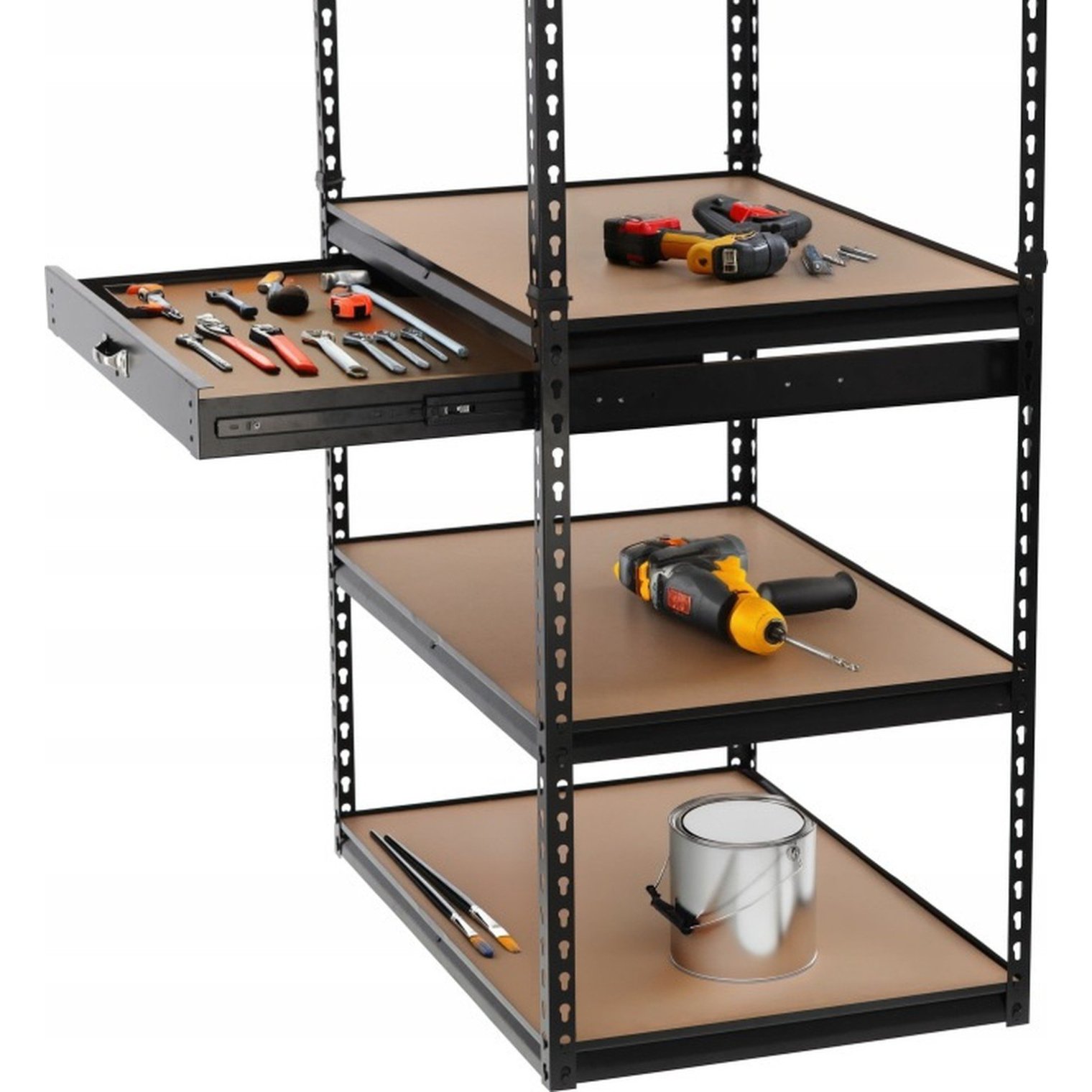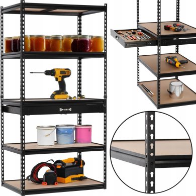 Прочная конструкция из оцинкованной стали обеспечивает высокую стабильность и устойчивость к коррозии, что гарантирует долгую службу стеллажа. Регулируемые полки из плит MDF позволяют легко подогнать высоту под хранимые предметы, а практичный ящик обеспечивает удобное хранение мелких элементов и инструментов.