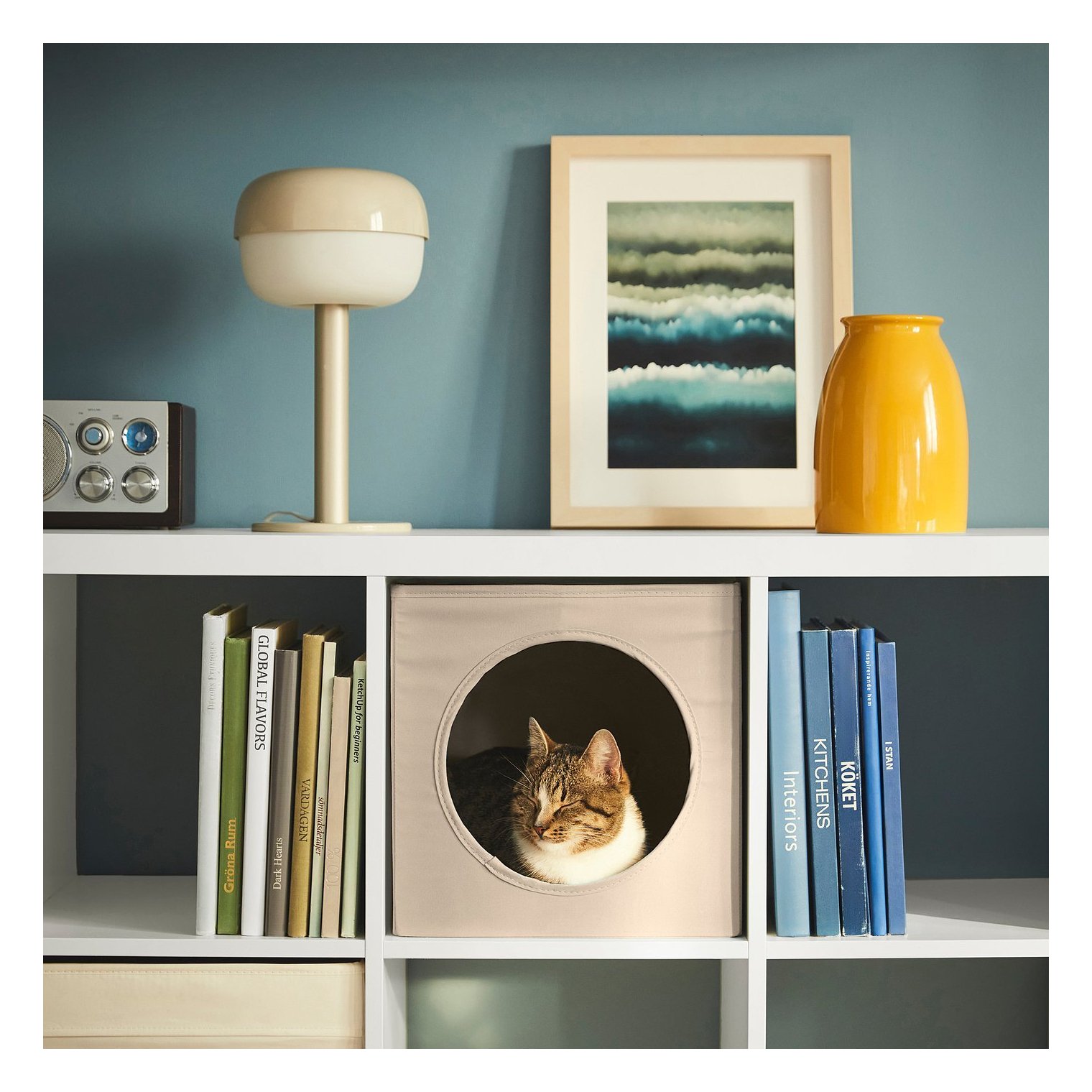 Поместите кошачий домик внутрь полки KALLAX, чтобы ваша кошка могла безопасно и комфортно спать, любуясь прекрасным видом.