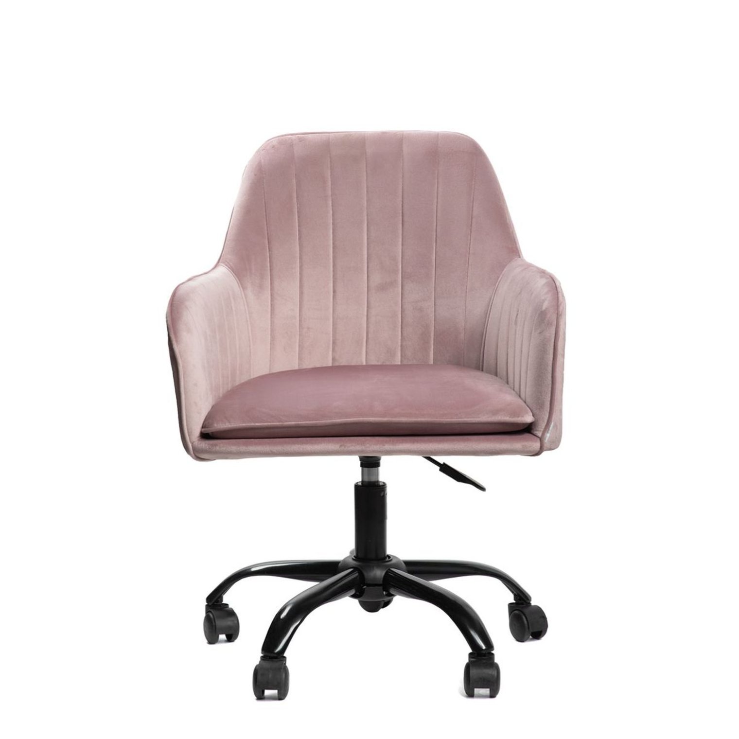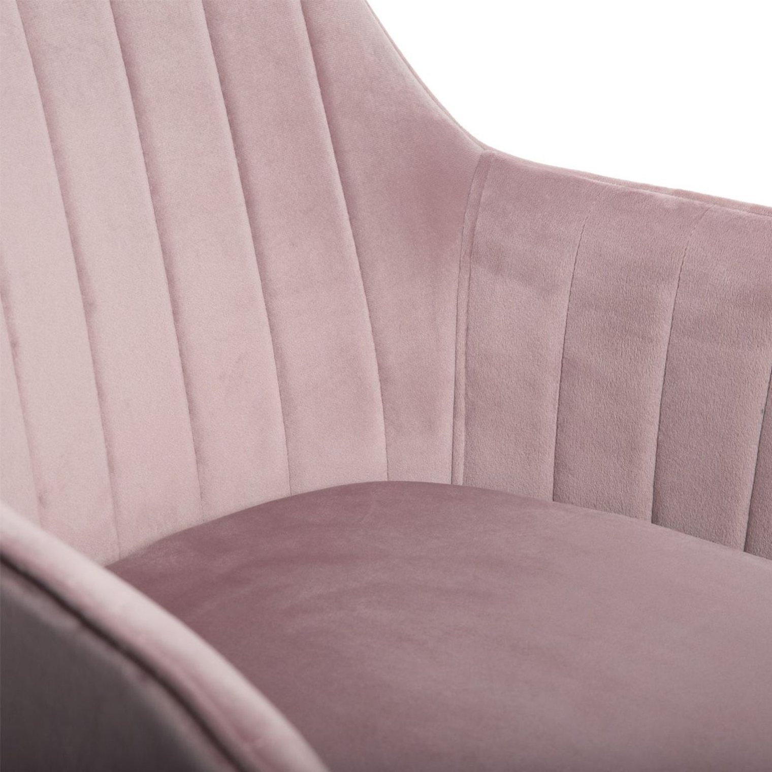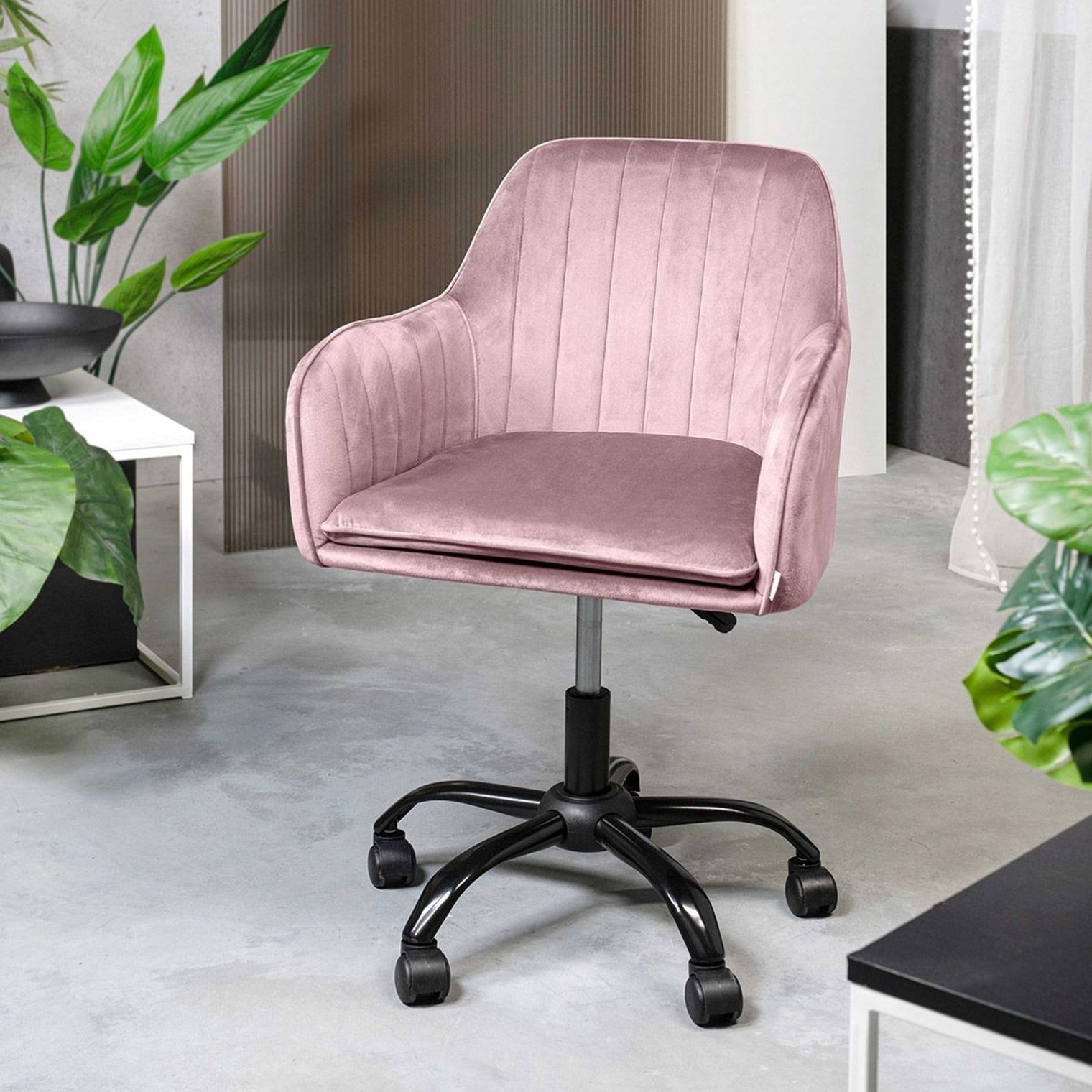Вращающееся кресло HOMLA TEILL практично и удобно. Цвет обивки впечатляет – модный розовый оттенок мебели гармонично впишется в интерьеры с элементами гламурного стиля . Изделие установлено на чёрное основание. Подушка сиденья идеально подогнана, надёжно держится и не спадает. Строчка образует вертикальные полосы, добавляя элегантности. Удобство сидения обеспечивают, прежде всего, мягкое сиденье, чётко очерченная спинка и функциональные подлокотники.