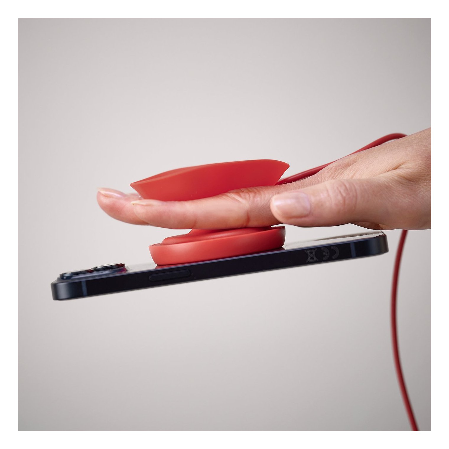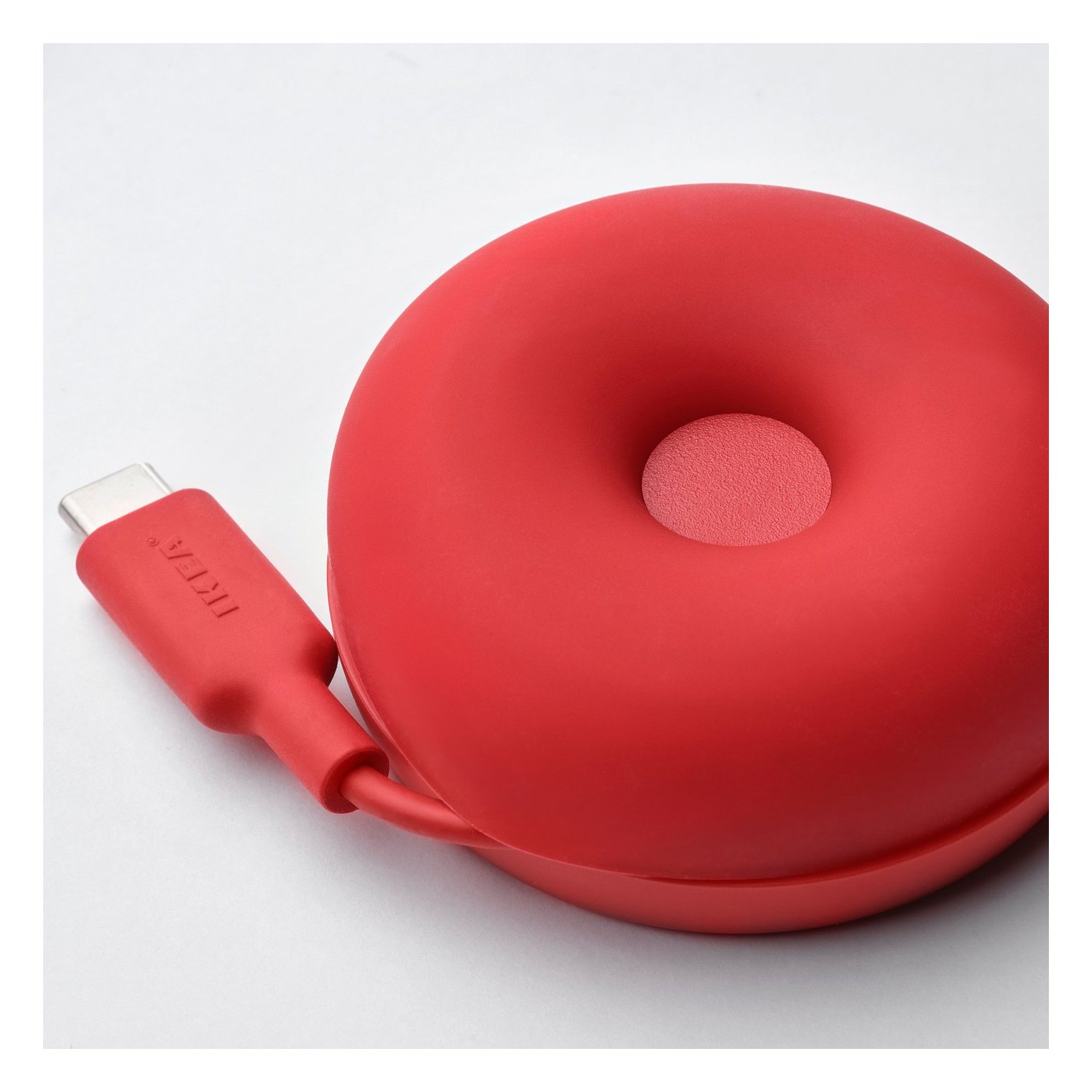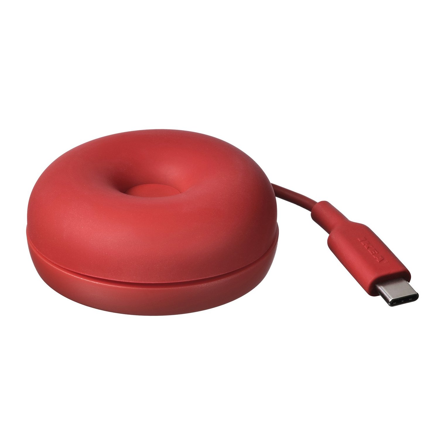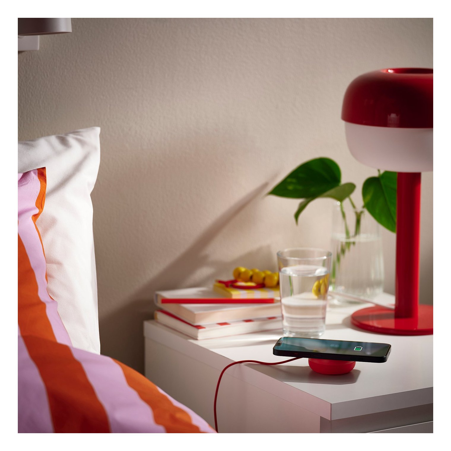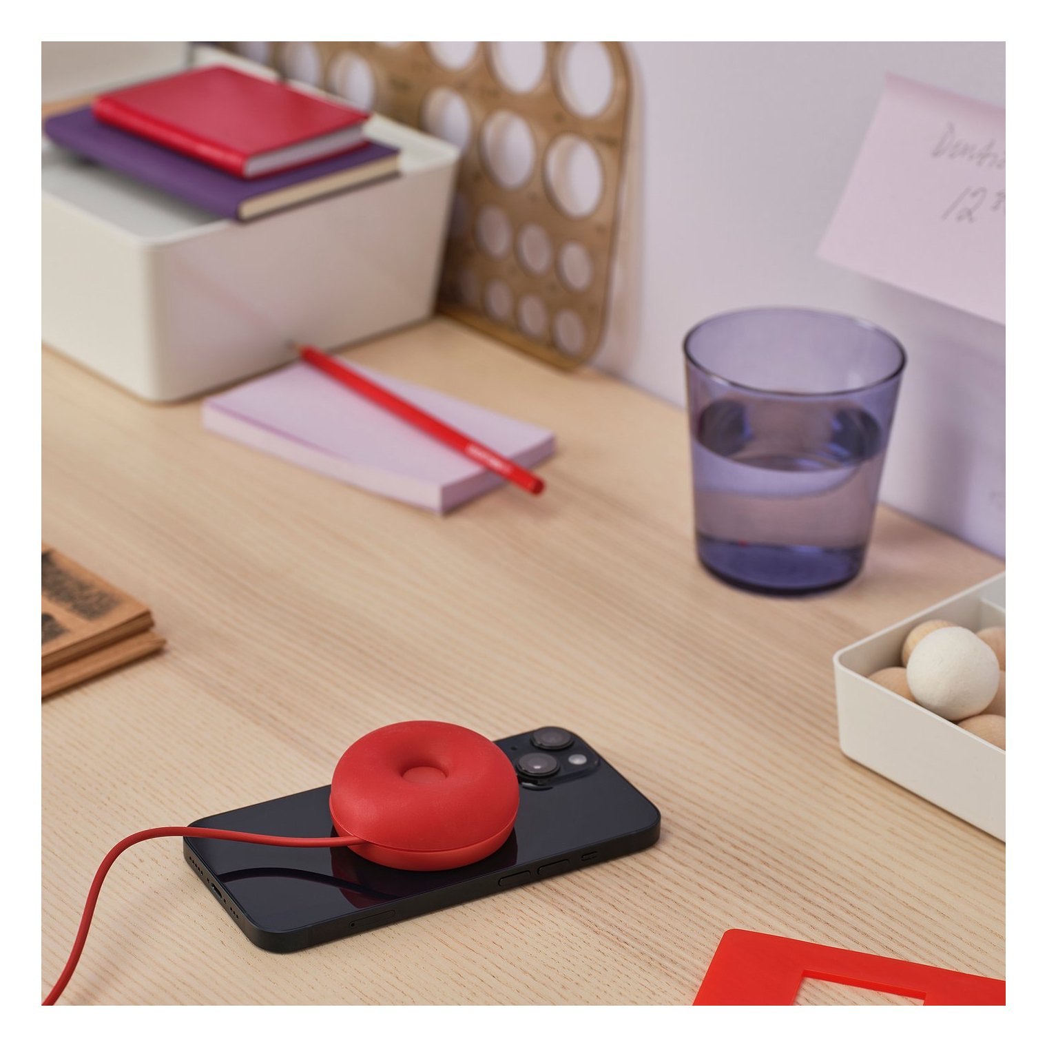 Индукционное зарядное устройство VÄSTMÄRKE удивляет своим жизнерадостным красным цветом и забавной формой, напоминающей пончик.