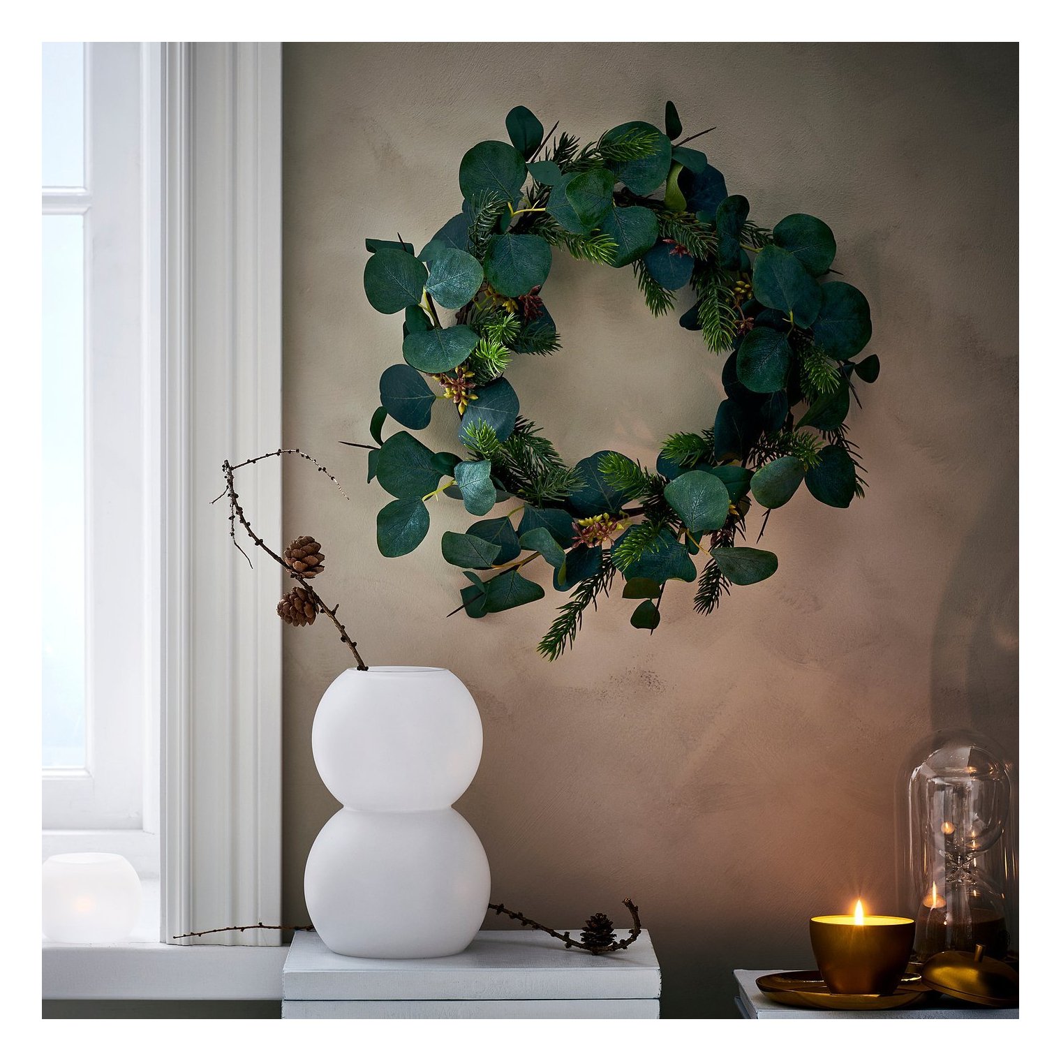 Декоративный венок одинаково красиво смотрится как на стене, так и на дверном проёме, на окне или как украшение стола. Он создаёт прекрасную праздничную атмосферу.