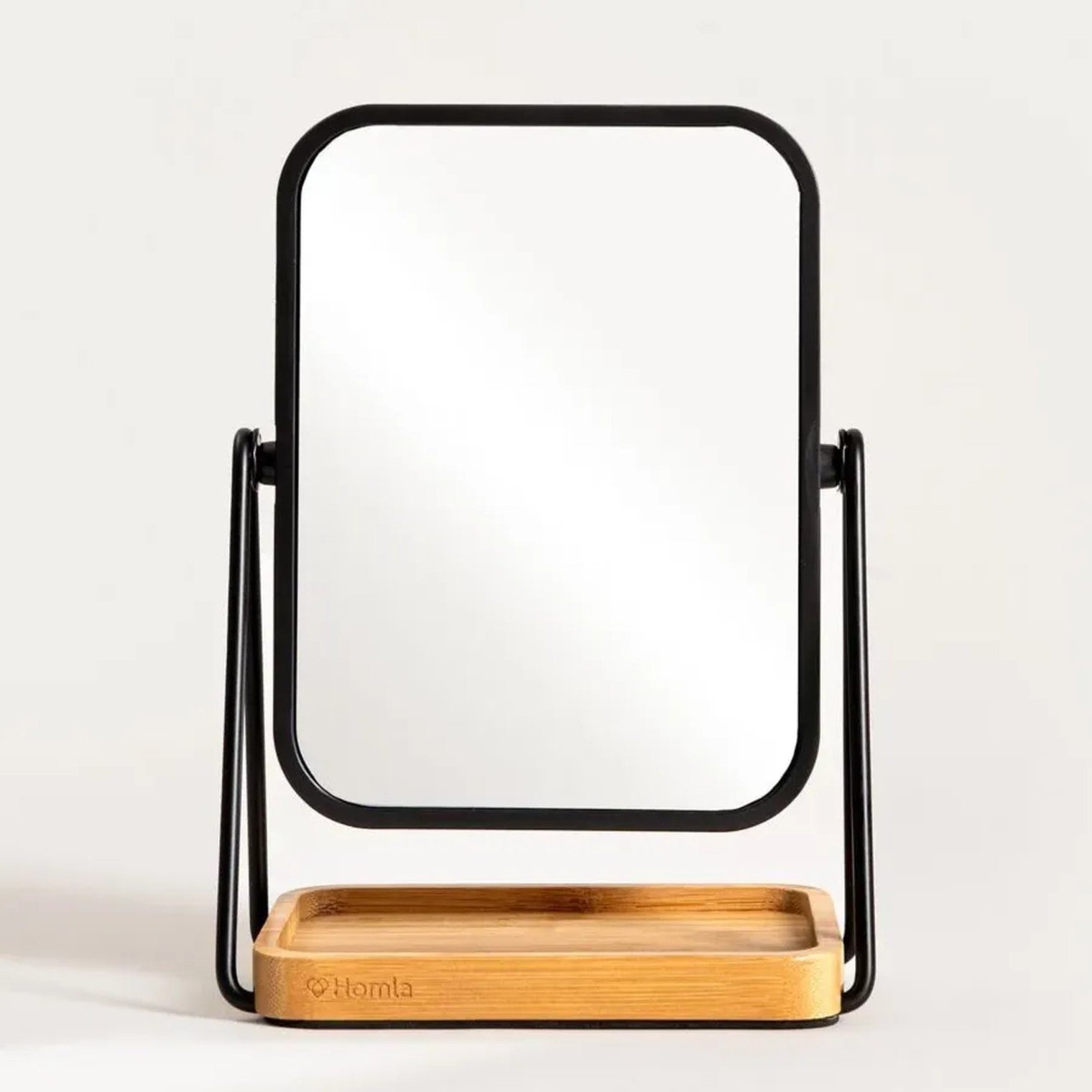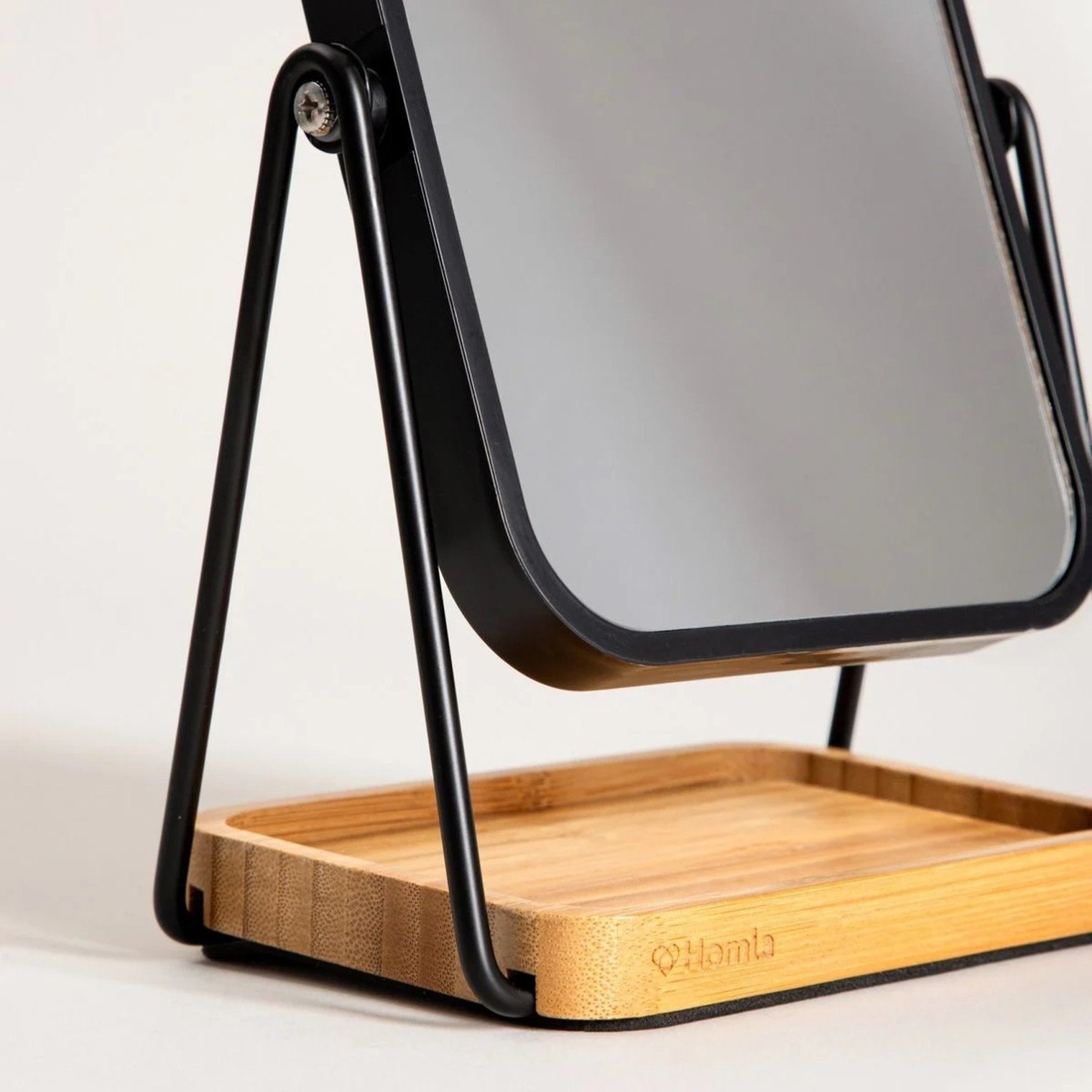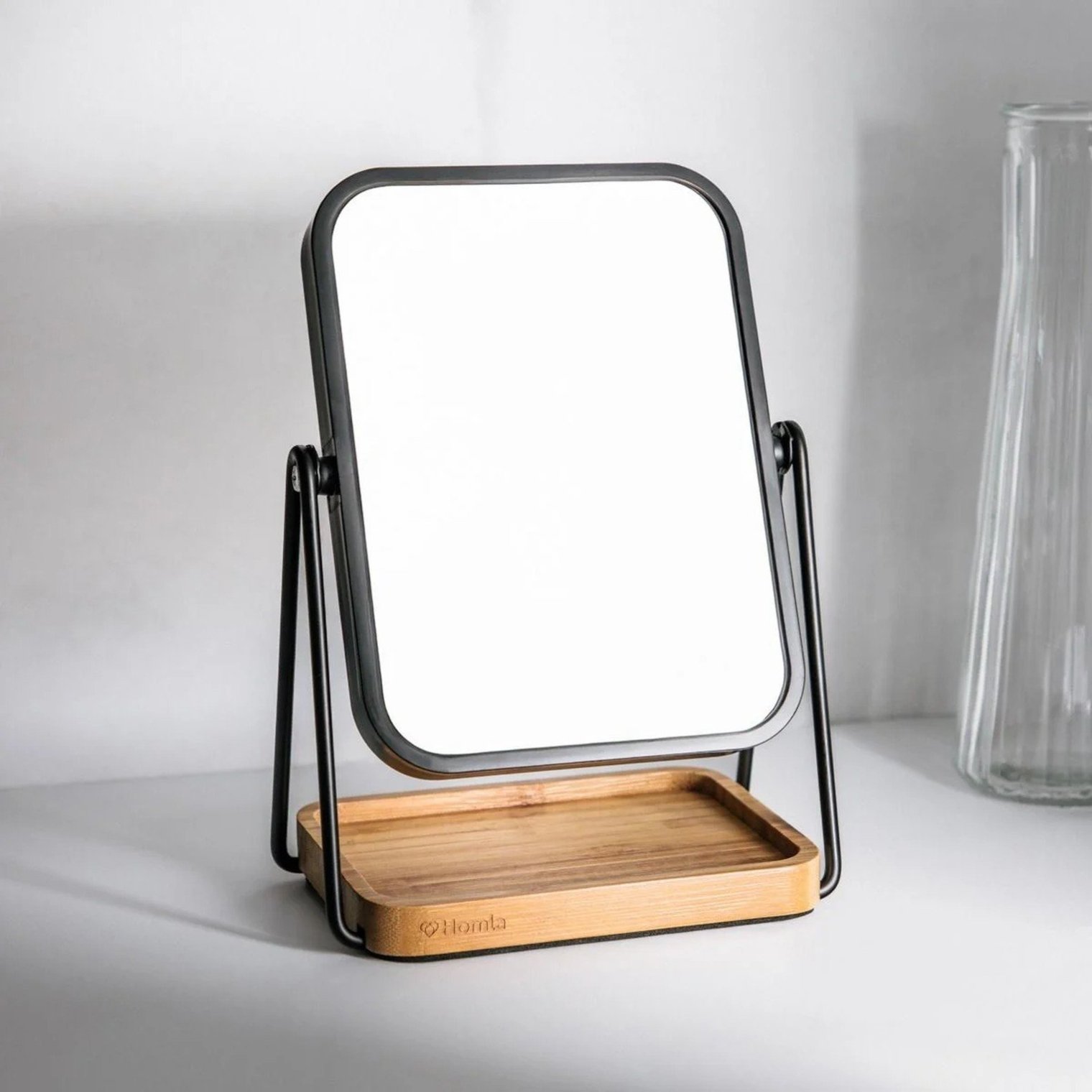 Зеркало изготовлено из прочных материалов: металлическая рама обеспечивает устойчивость, стеклянная панель обеспечивает четкое отражение, а деревянная подставка служит практичным контейнером для мелких предметов.