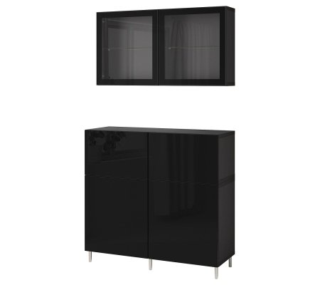 Комбінація полиць із дверцятами/ящиками, чорно-коричневий/Сельсвікен/Осарп глянсове/чорне прозоре скло, 120x42x213 смнемає в наявності