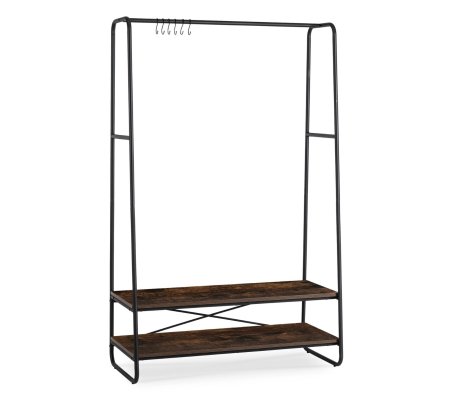 Купила на дачу в прихожую. Скажу честно очень тендитная вещь. Если на ней пару детских вещей, пару взрослых и обуви буквально пар 6 все ок. Чуть больше повесили, поставили обуви, полка для обуви упала ,трубы вылезли из пазов. И вообще она на бок завалилась. Пришлось вторую полку для обуви прикрутить аж в самом верху как дополнительное ребро жесткости ,только так эта вся конструкция может что то выдержать. Скорее все рассчитана на летние вещи не куртки. И не больше чем на пару человек.