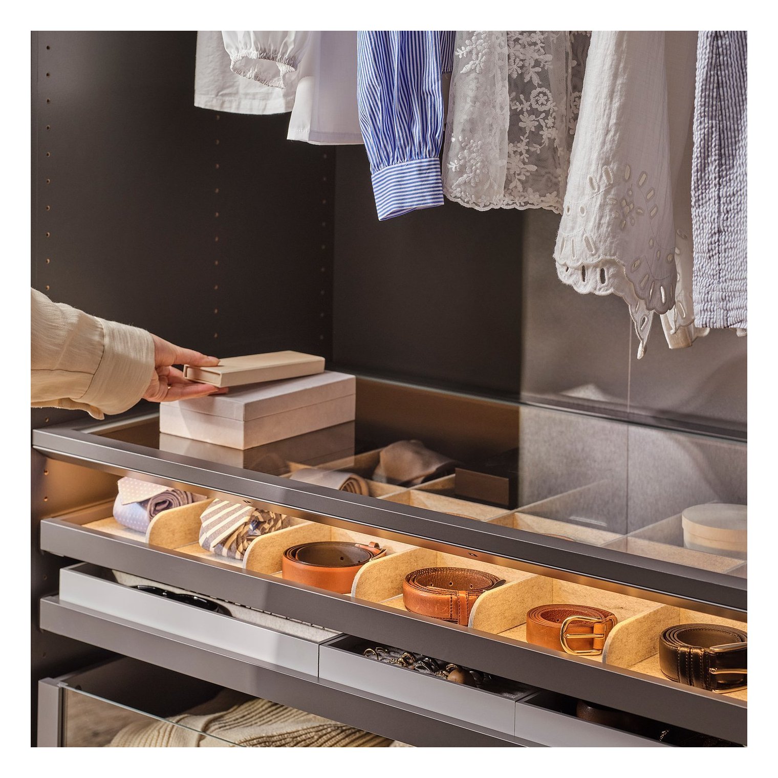Якщо розмістити скляну полицю у шафі високо, стежити за речами у глибині буде простіше.