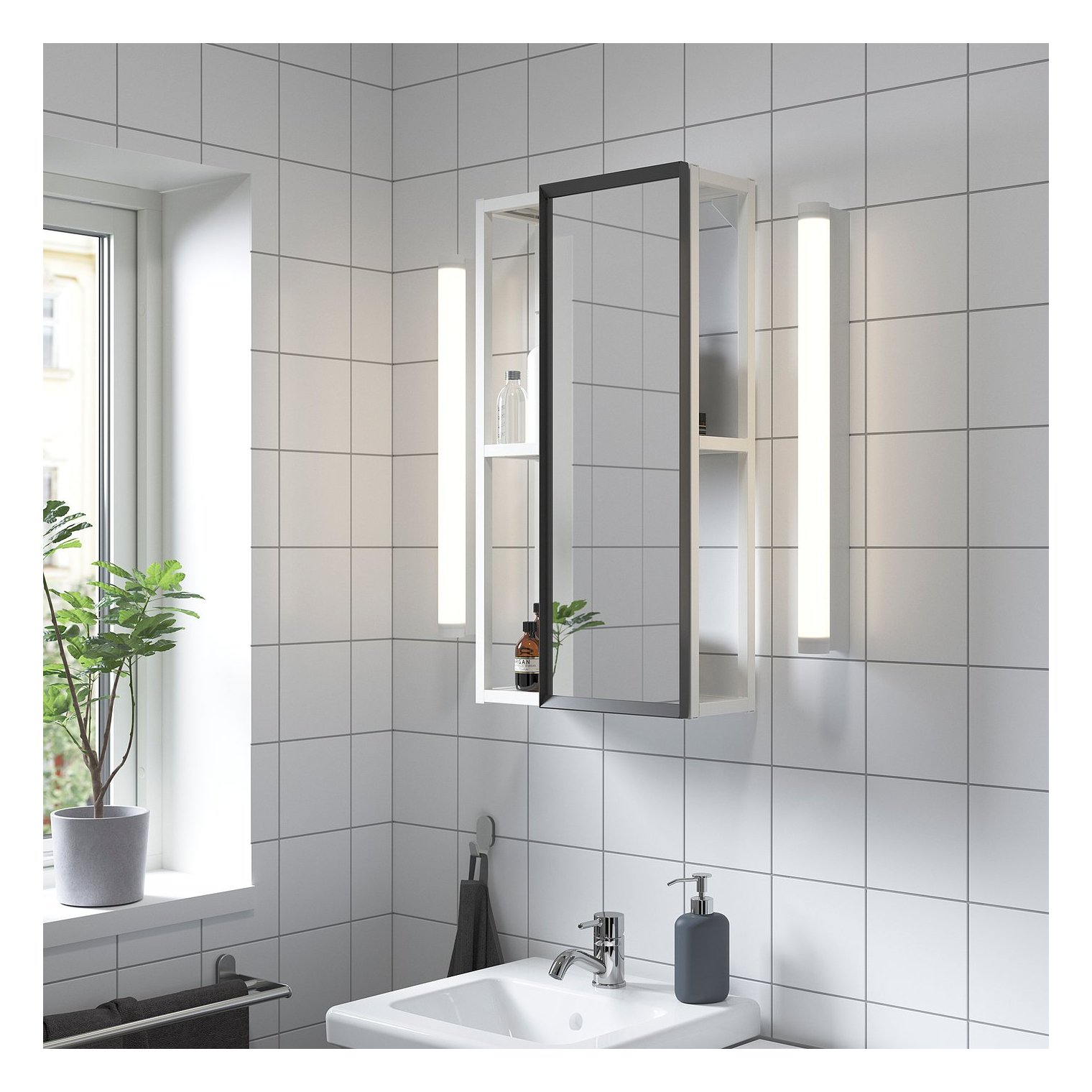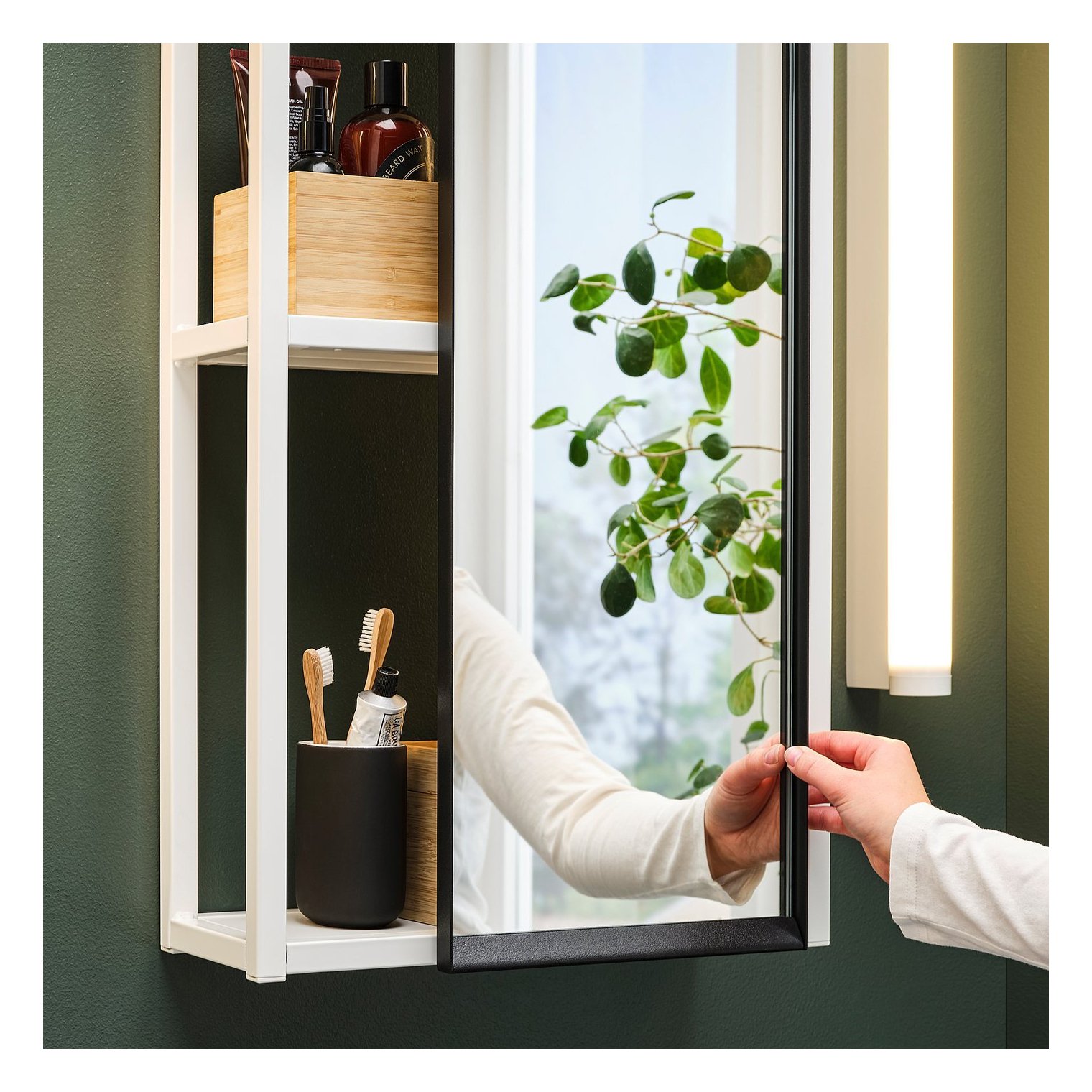 Дзеркало висить ENHET легко кріпиться на шафи з кріпленням на стіну, завдяки чому ви можете насолоджуватися ним в одну мить. Можна переміщати з одного боку в інший, забезпечуючи легкий доступ до необхідних статей повсякденного використання.