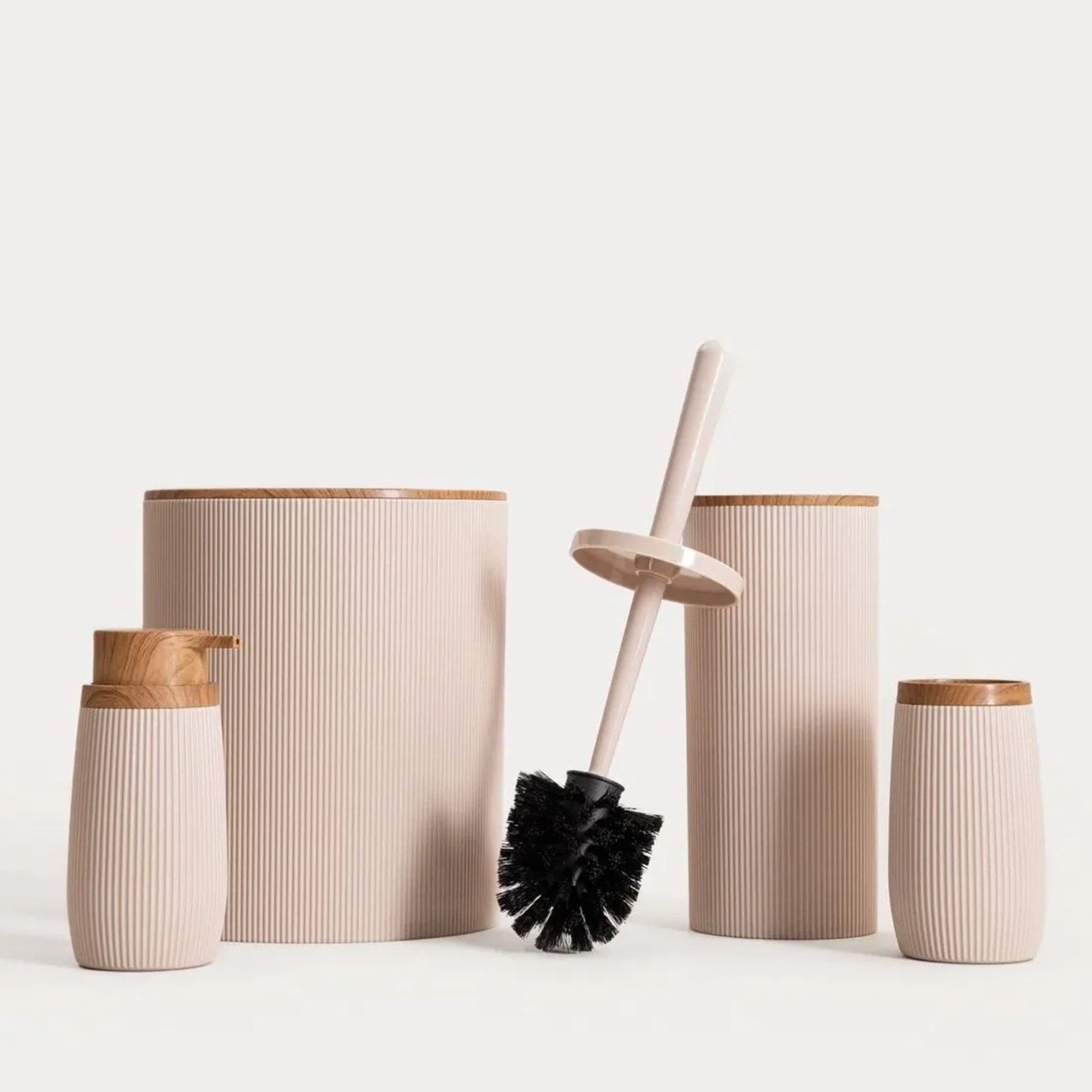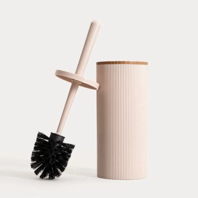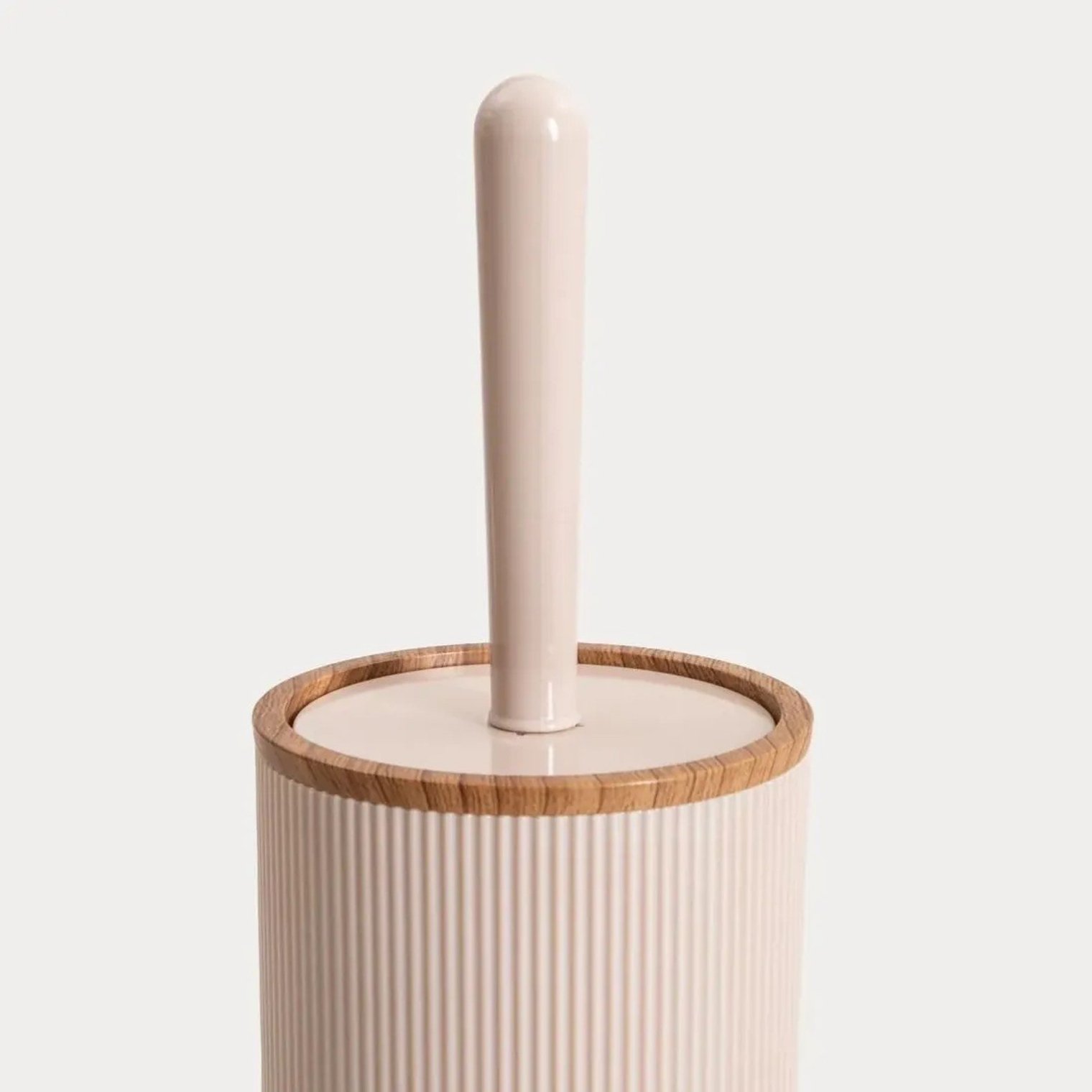 Туалетний йоржик DIALL - це функціональний та естетично привабливий аксесуар для ванної кімнати, що поєднує сучасний дизайн із повсякденною зручністю. Ніжний бежевий колір і вертикальні канавки контейнера надають йому елегантного мінімалістичного вигляду, що ідеально доповнює сучасні інтер'єри. Оздоблення під дерево додає теплий, декоративний штрих.