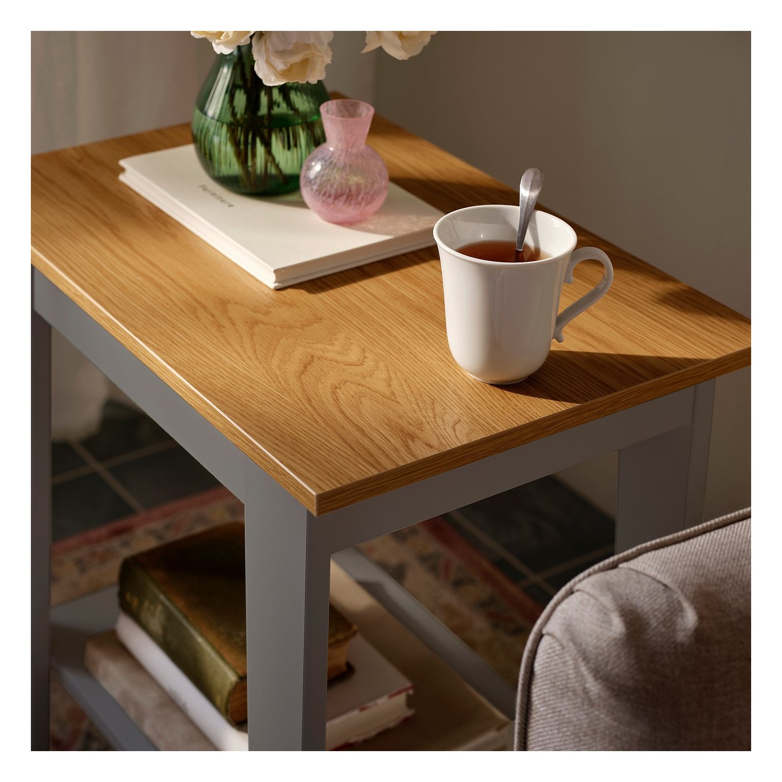 На столешнице можно разместить кофейные кружки и планшеты, а на полке – красивые книги. Для закрытого хранения можно также добавить корзины.