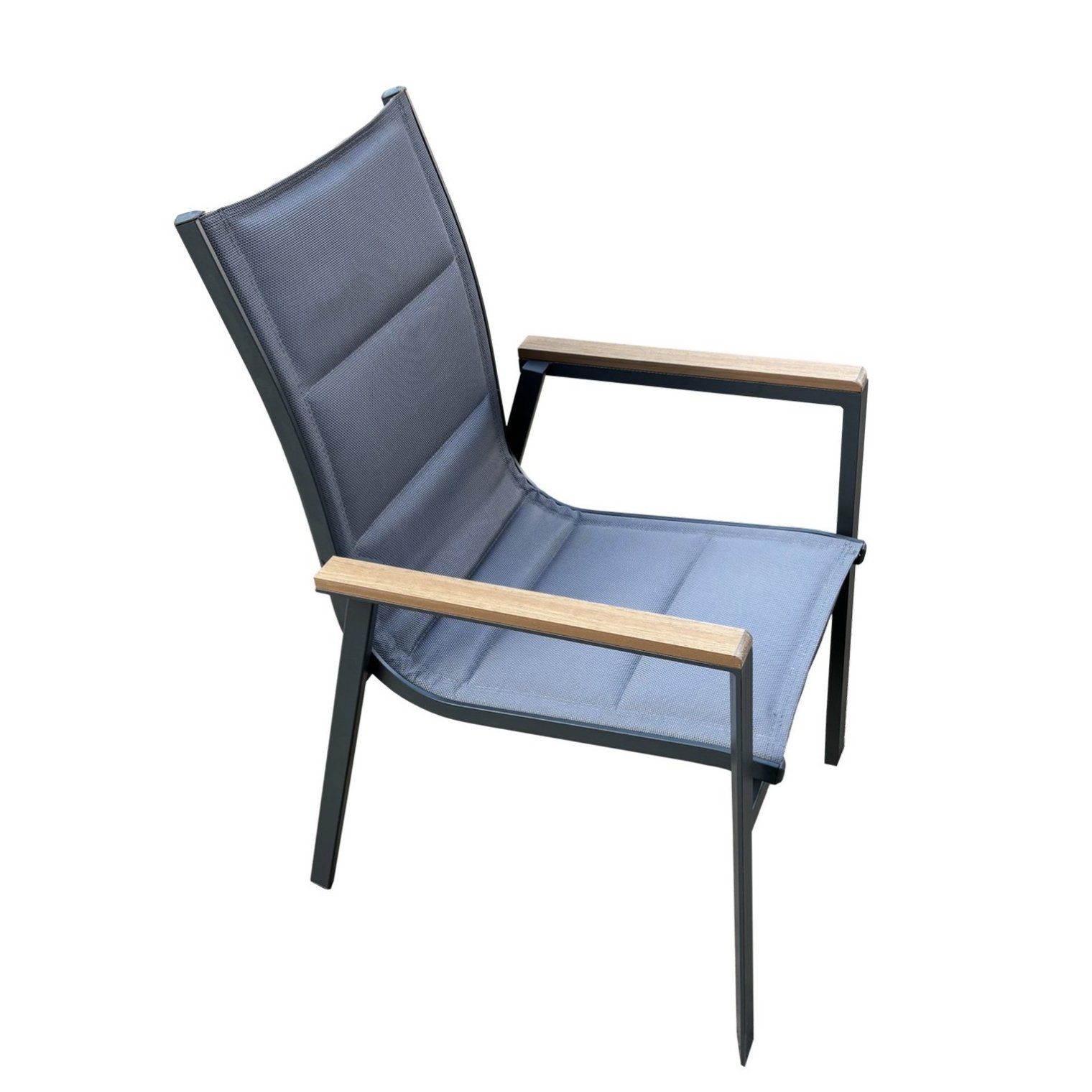 Сучасне та зручне садове крісло, виготовлене з легкого але міцного алюмінієвого каркасу, обробленого сіткою Textilene 2x1 з м'якою оббивкою. Ідеально підходить для тераси, саду чи балкону. Підлокітники з полівінілхлориду надають природного вигляду та забезпечують стійкість до погодних умов.