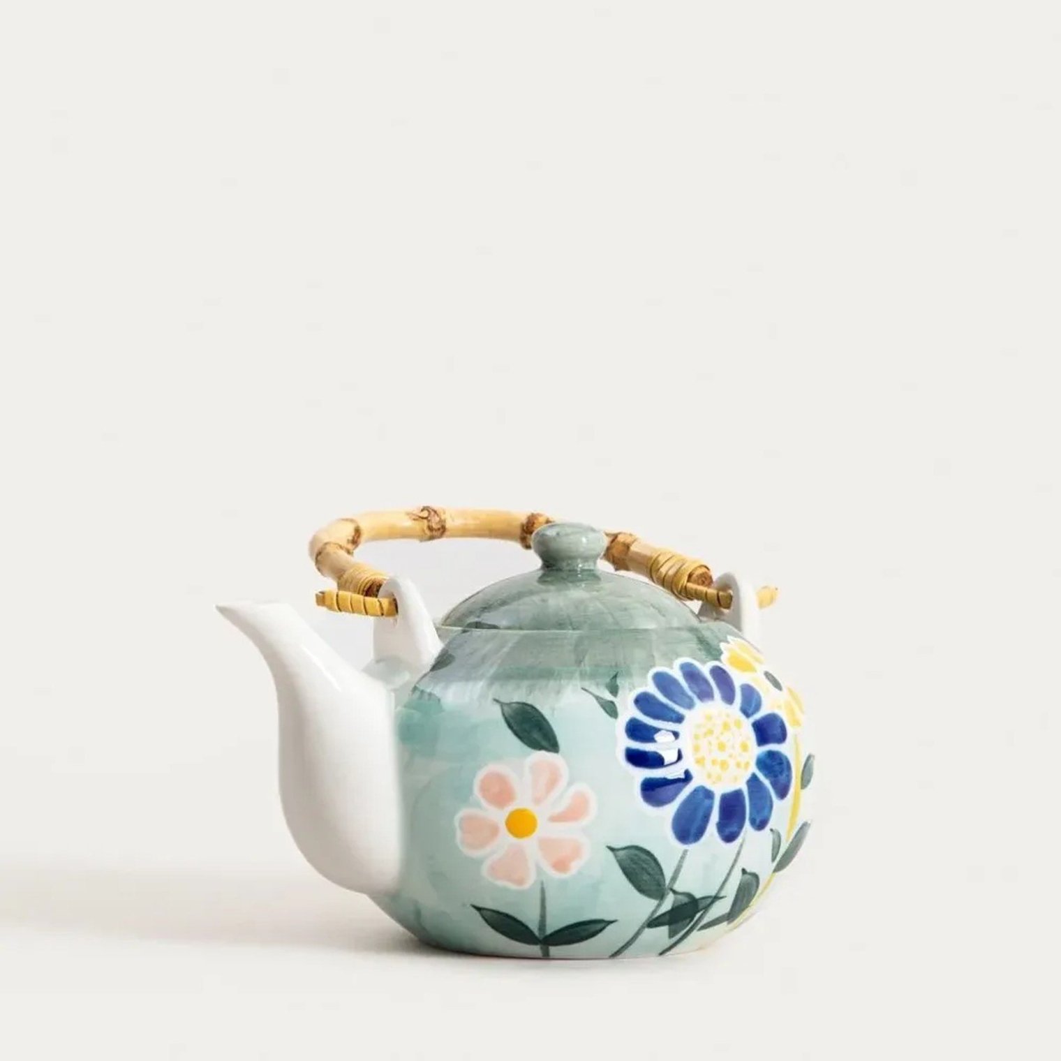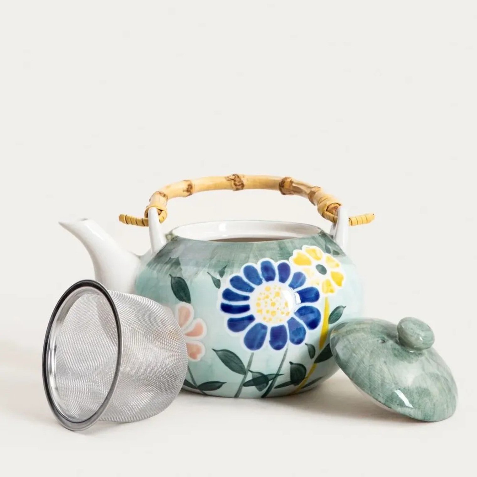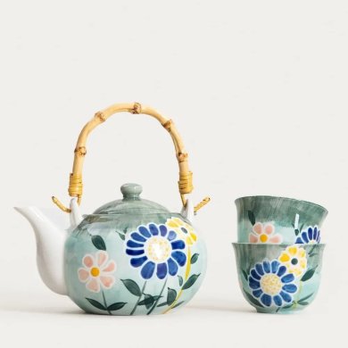 Чайний сервіз LIMITED зачаровує свіжим квітковим візерунком у відтінках зеленого, синього та ніжно-рожевого. Ретельно опрацьований декор надає йому художнього шарму, а злегка зістарений фон підкреслює сільський стиль сервізу. Приваблива ручка чайника, натхненна натуральним бамбуком, завершує образ.