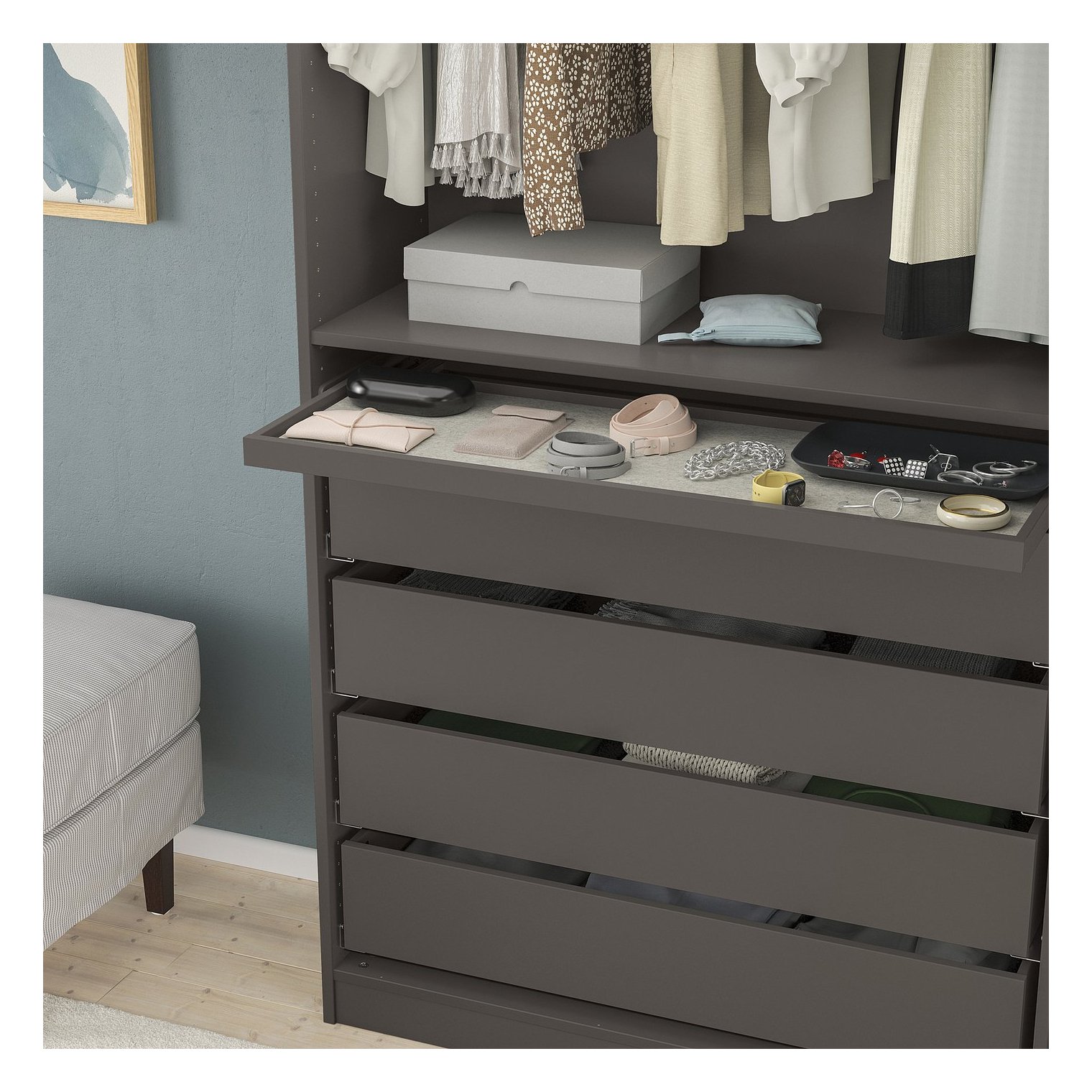 Відділення полегшують організацію та пошук дрібних предметів, таких як шарфи, ремені чи краватки.