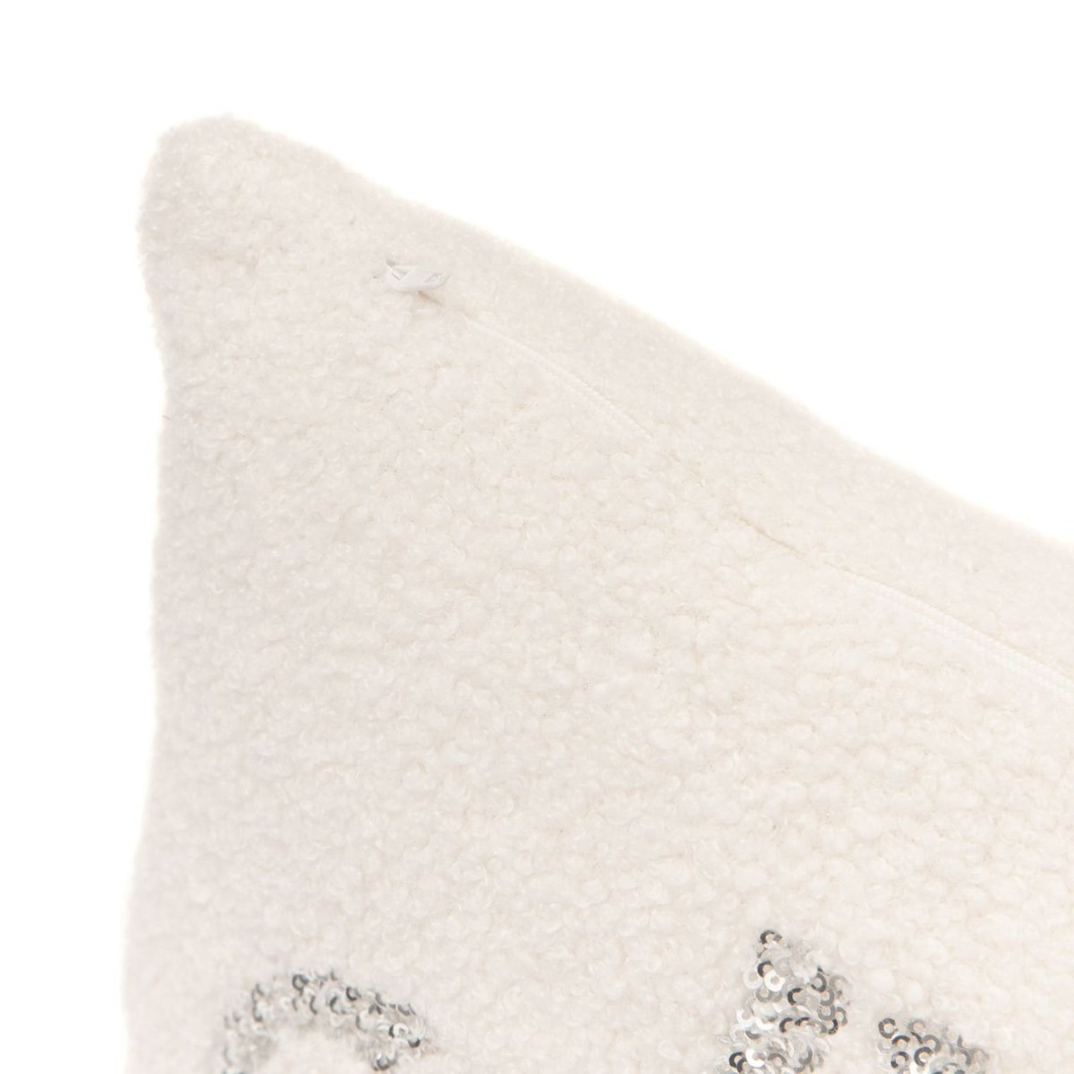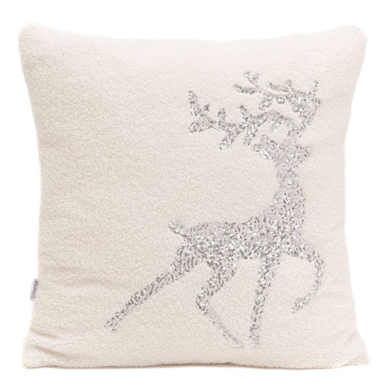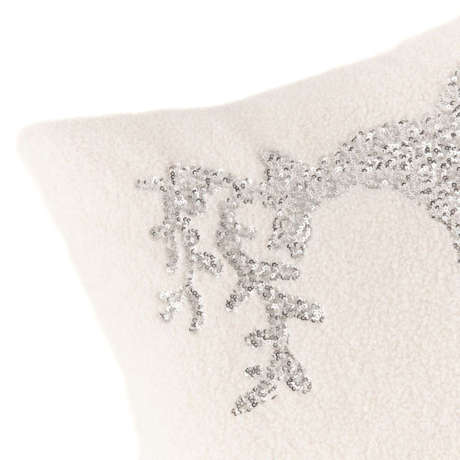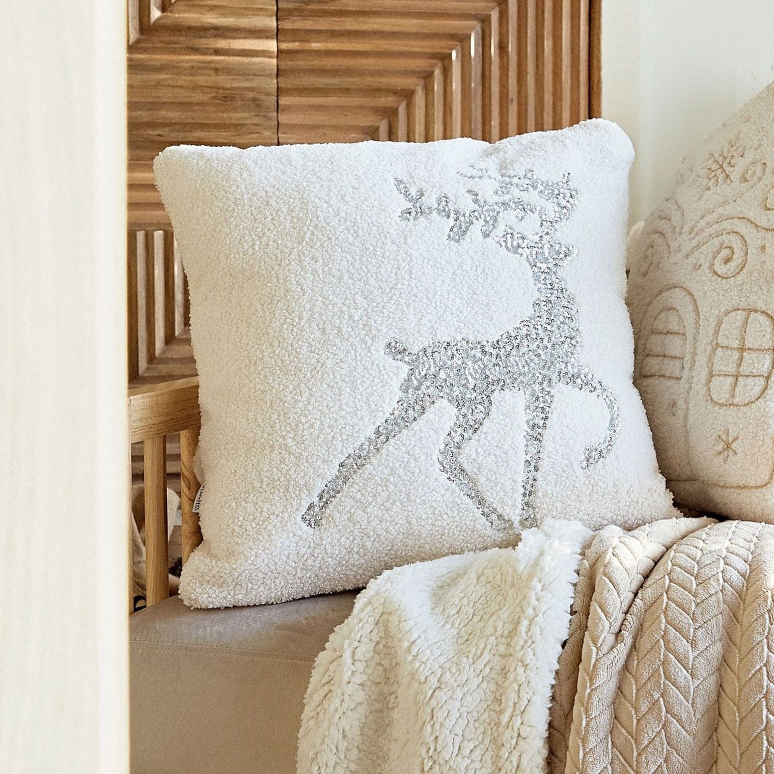 Наволочка NIKO має дуже оригінальний та цікавий дизайн. Вся наволочка вкрита бежевим матеріалом, що імітує овчину. Ця фактура неймовірно м'яка і приємна на дотик. Наволочка прикрашена фігуркою оленя, виконаної із сріблястих паєток.