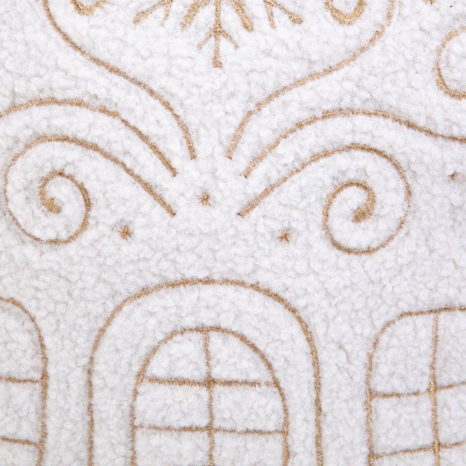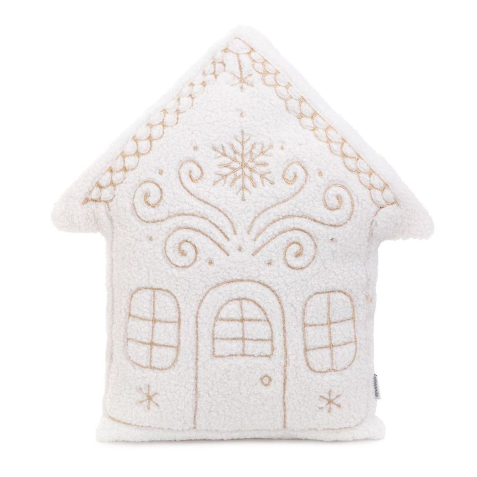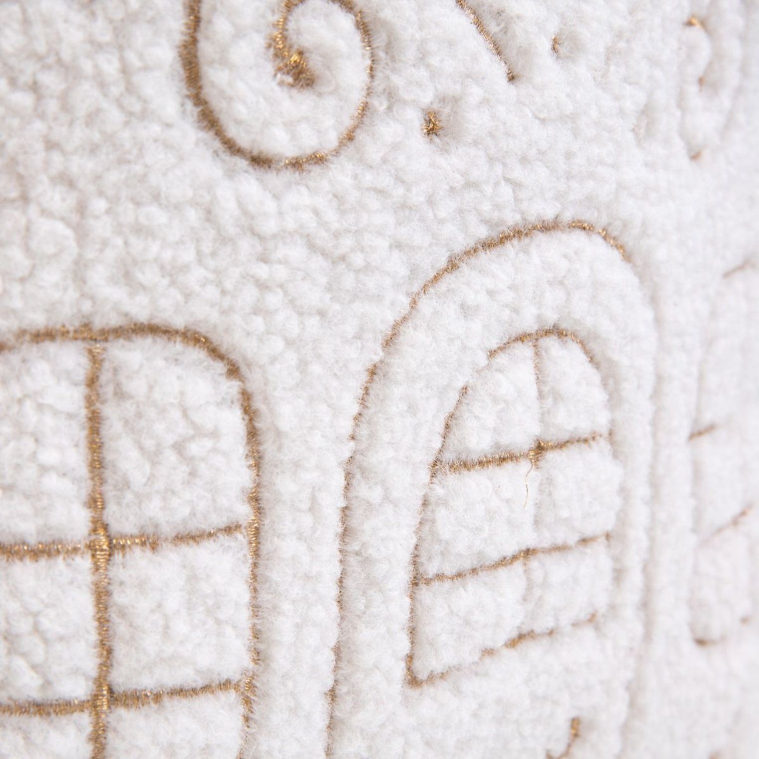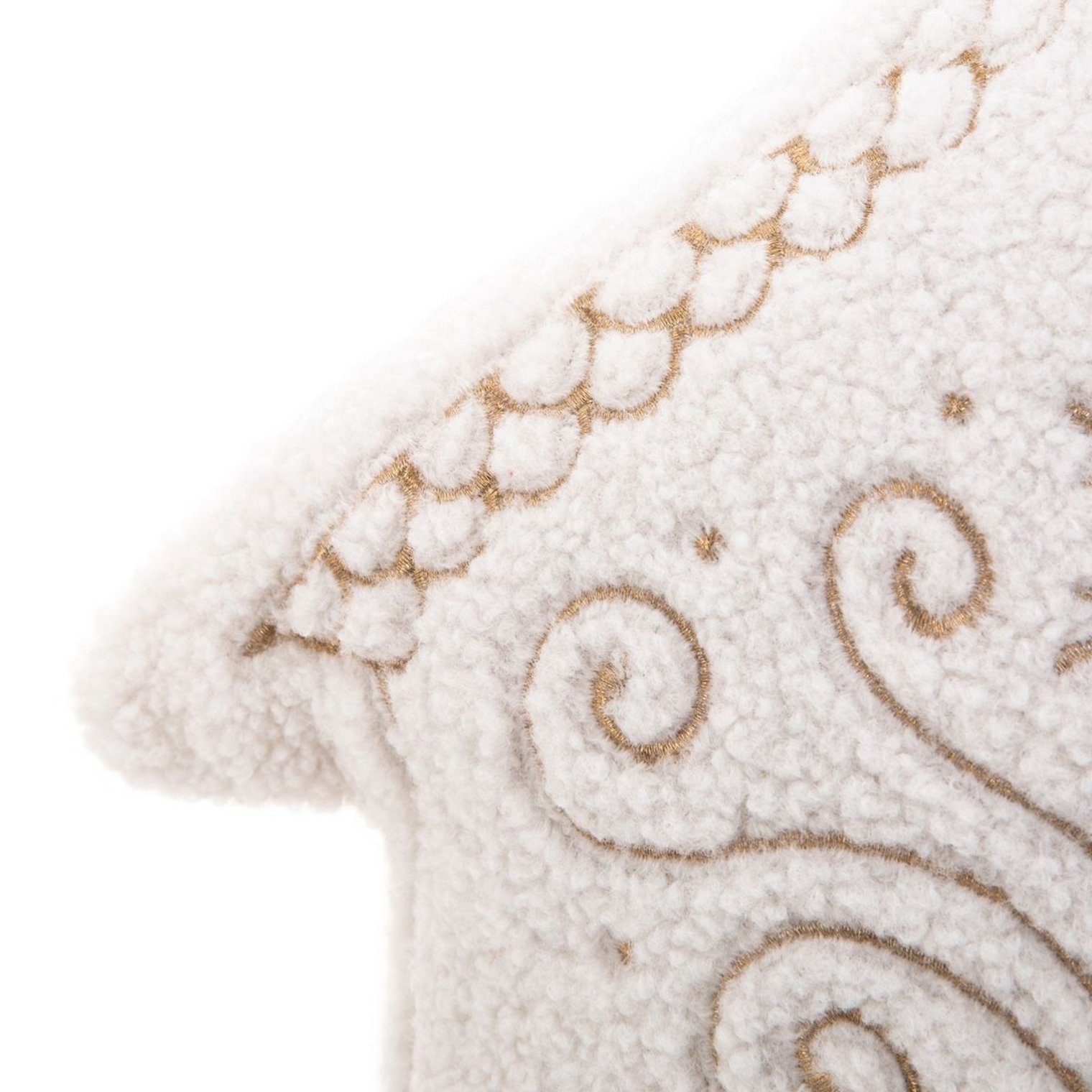 Подушка HOMLA BALAY привертає увагу своєю чарівною формою будиночка. Вікна, двері та дах прикрашені золотою ниткою, що ефектно виглядає на білому тлі подушки. Золотисті сніжинки ідеально доповнюють зимову атмосферу, роблячи подушку ідеальним доповненням до святкового декору.