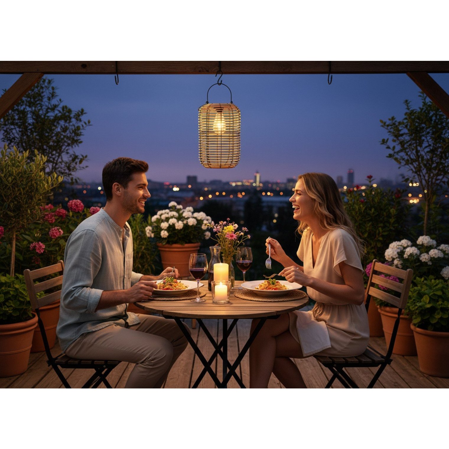 Завдяки вбудованій сонячній панелі, ліхтар автоматично заряджається протягом дня і випромінює тепле світло увечері, створюючи затишну атмосферу. Ідеально підходить для літніх вечорів та романтичних вечерь на відкритому повітрі.