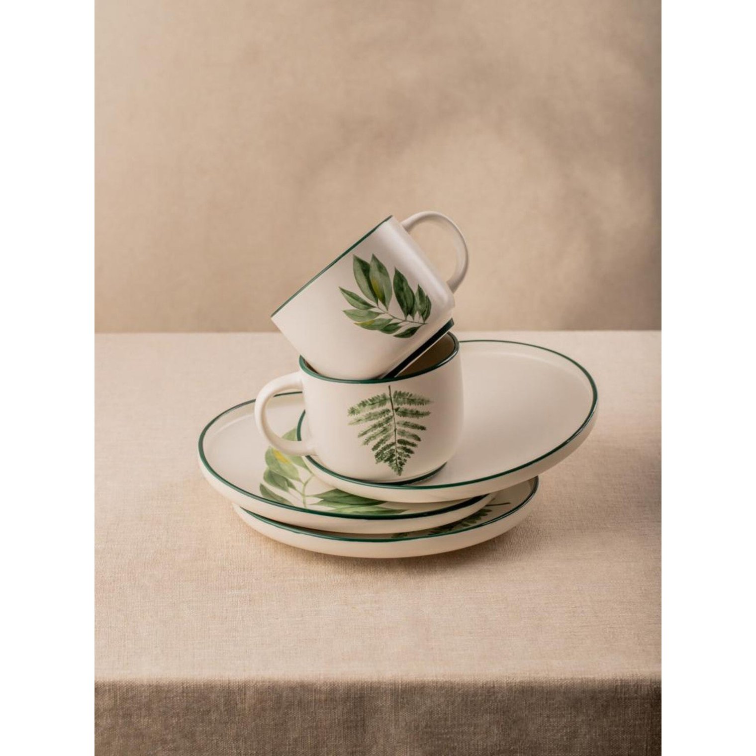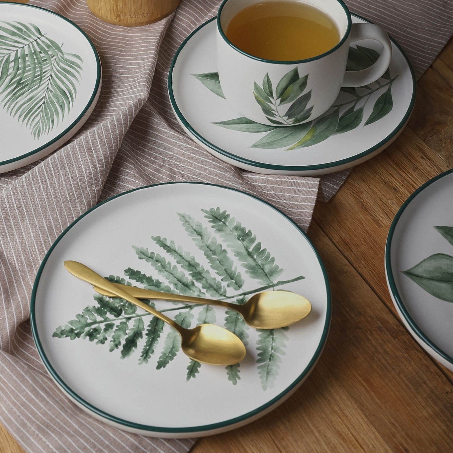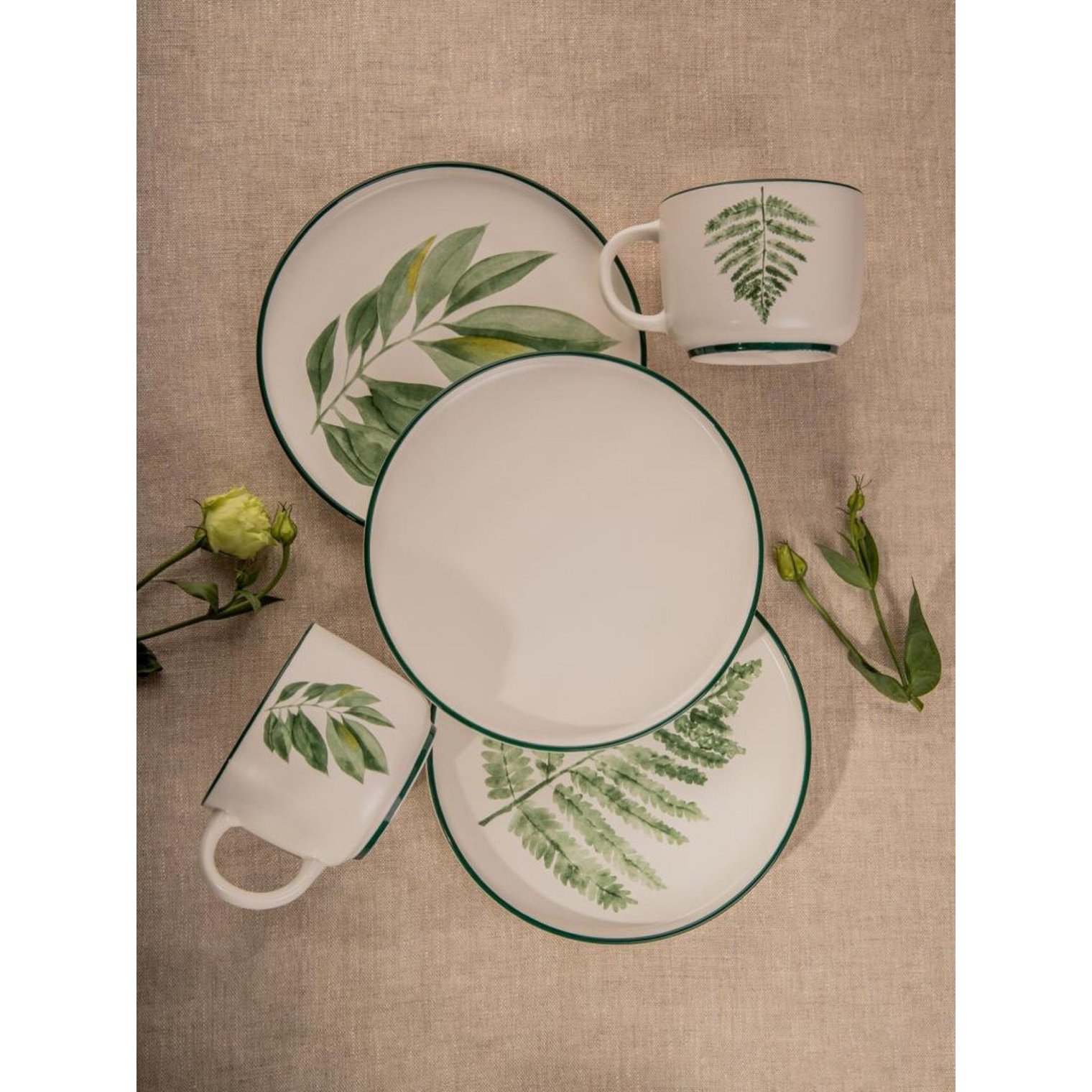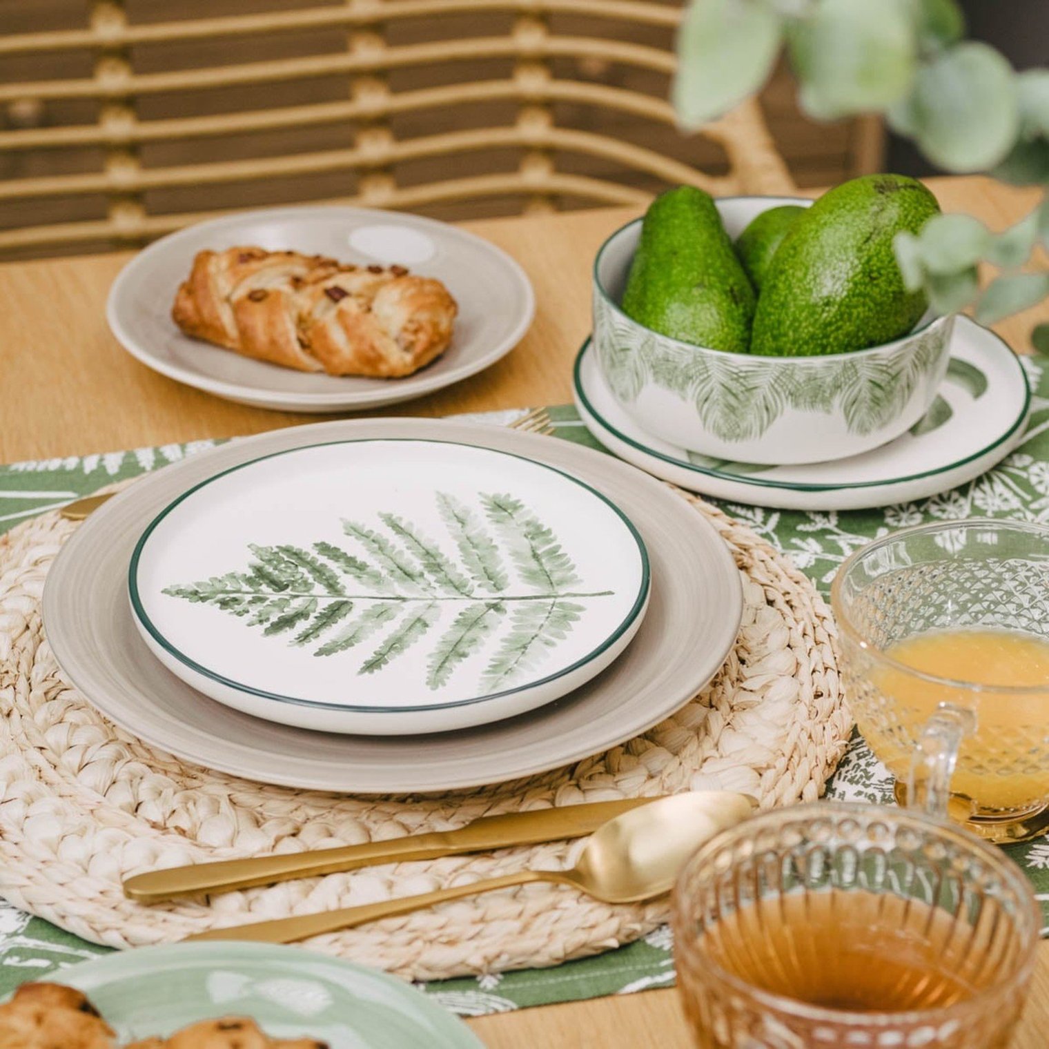 Ботанічна тарілка BLYDE діаметром 20 см доповнить різні композиції, насамперед завдяки своєму позачасовому білому кольору, який лежить в основі природної естетики. Лист каучукового дерева виглядає так, ніби намальований вручну аквареллю, відрізняючись витонченою чарівністю та спокійними квітами, обрамленими безліччю відтінків зеленого. Тарілка має мінімалістичну круглу форму, а її злегка підняті краї прикрашені яскравим пляшково-зеленим кольором, що обрамляє весь виріб.