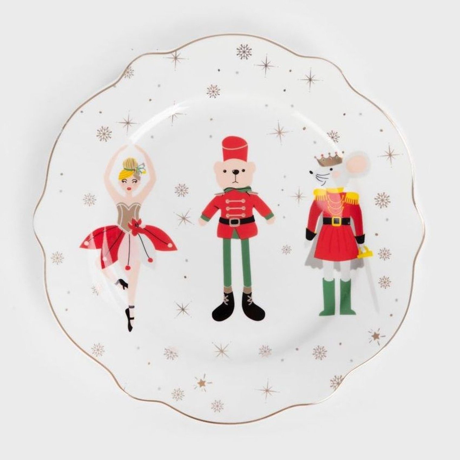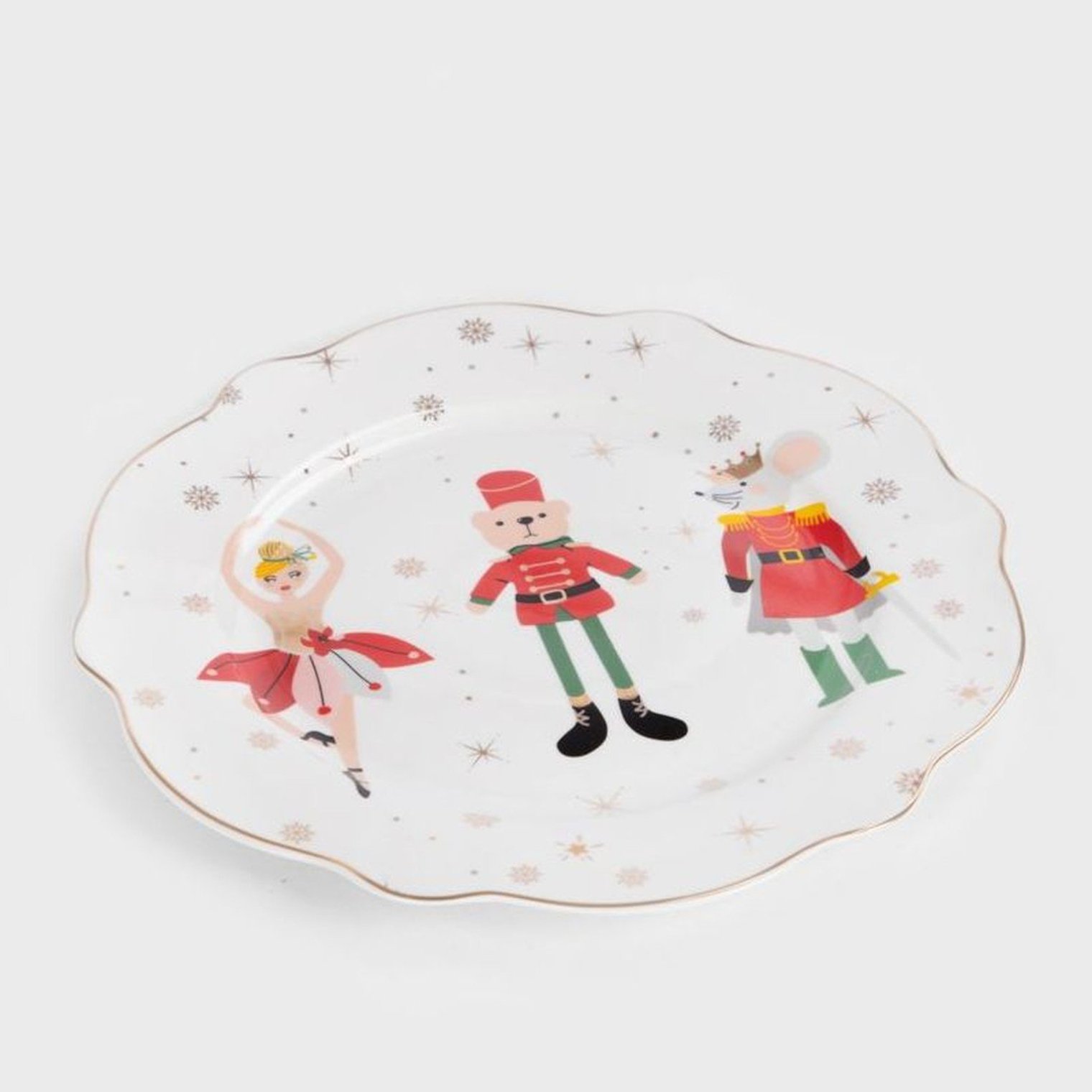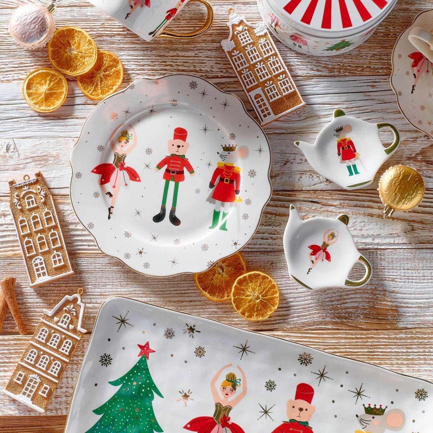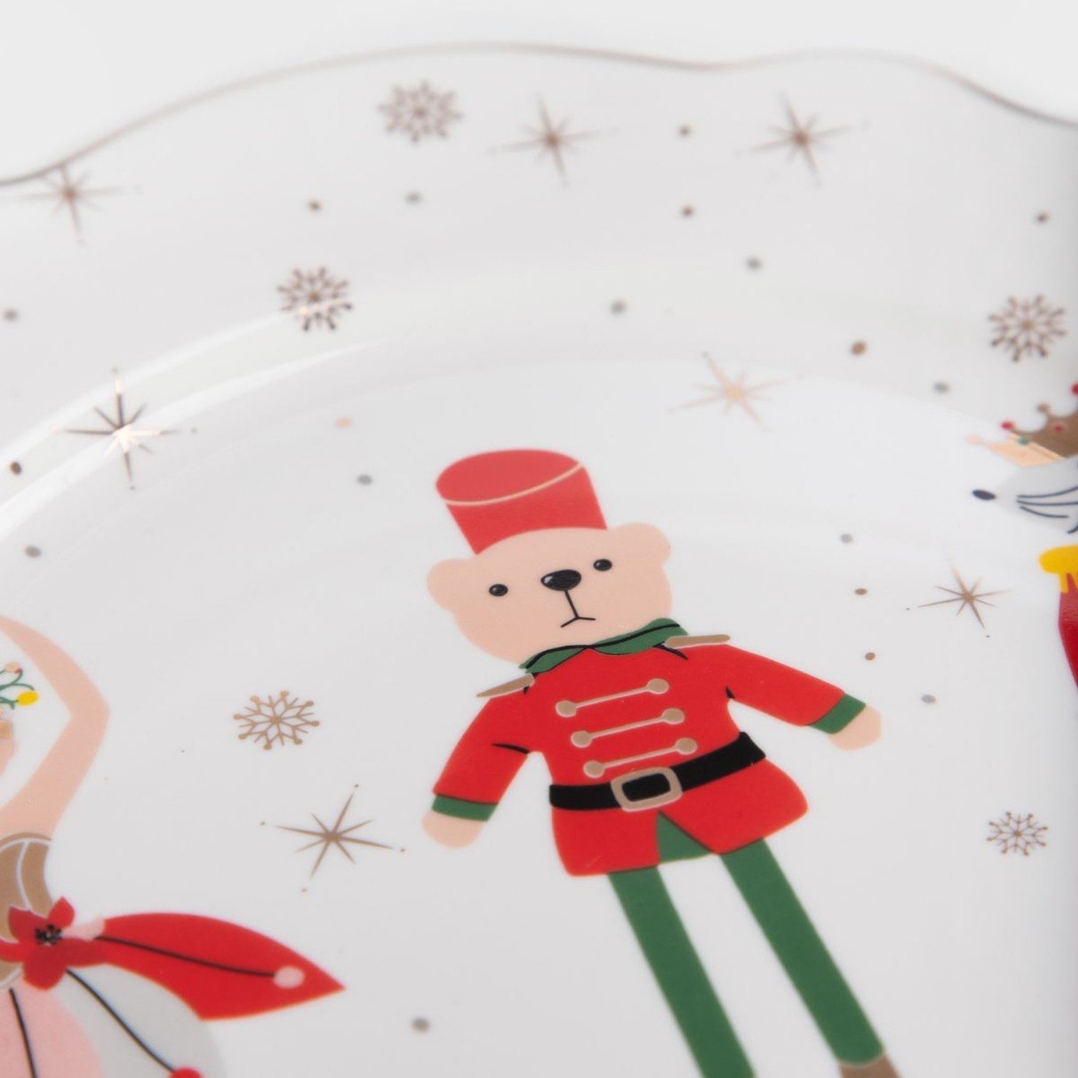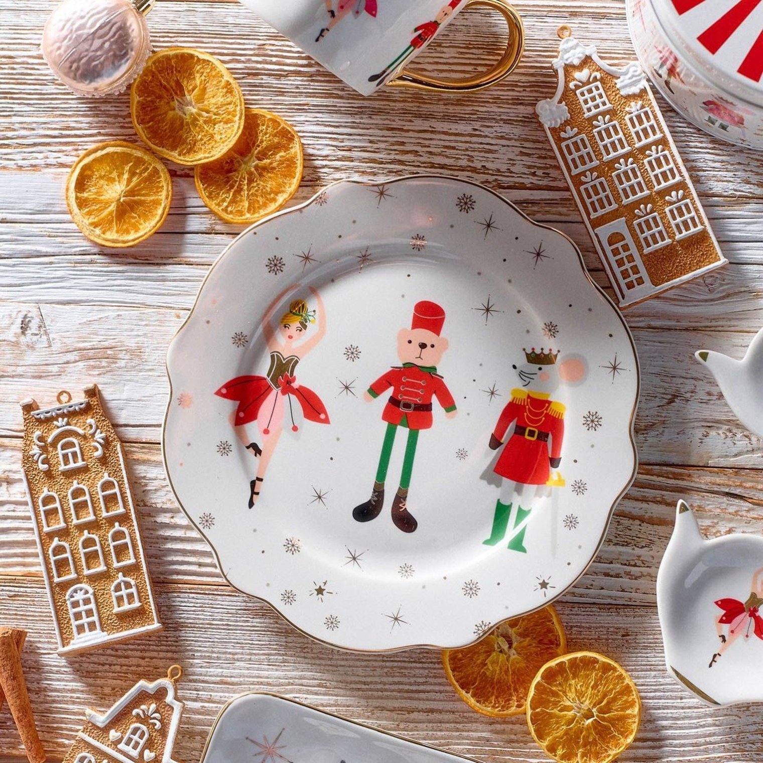 Привнесіть диво свята до своєї їдальні з десертною тарілкою LICOLA. Натхнена класичним балетом, тарілка зачаровує чарівними фігурками балерини, Лускунчика та мишачого короля, надаючи їй неповторного характеру. Витончені золоті деталі та хвилястий край додадуть будь-якому торту чи десерту, подається на ній, неповторний вигляд.