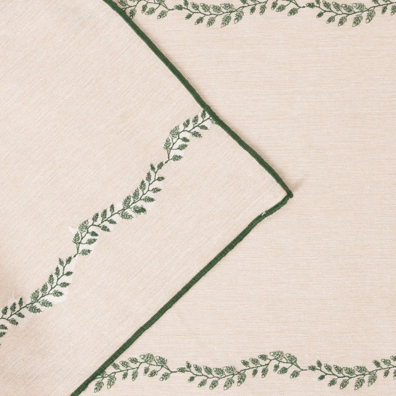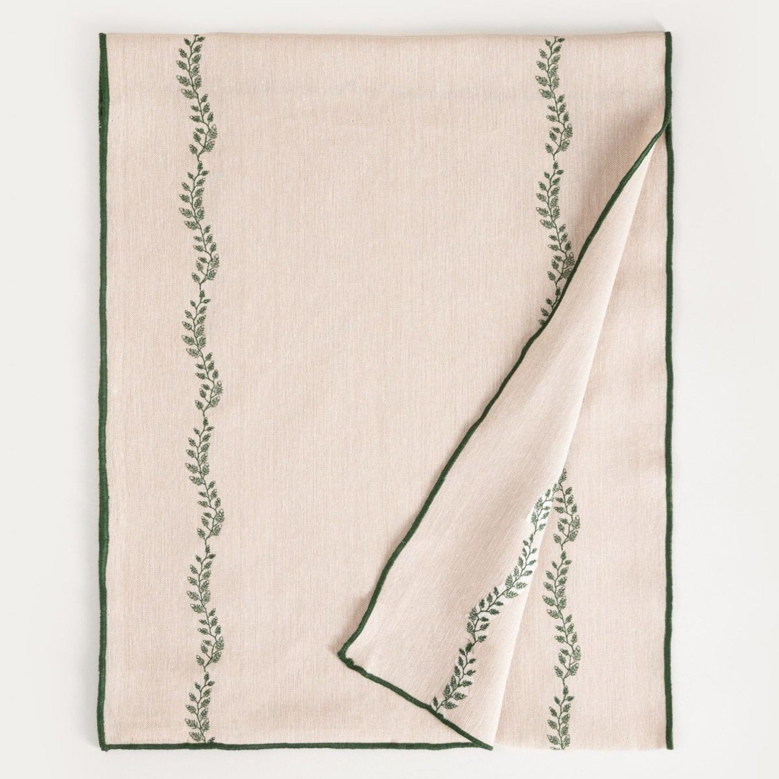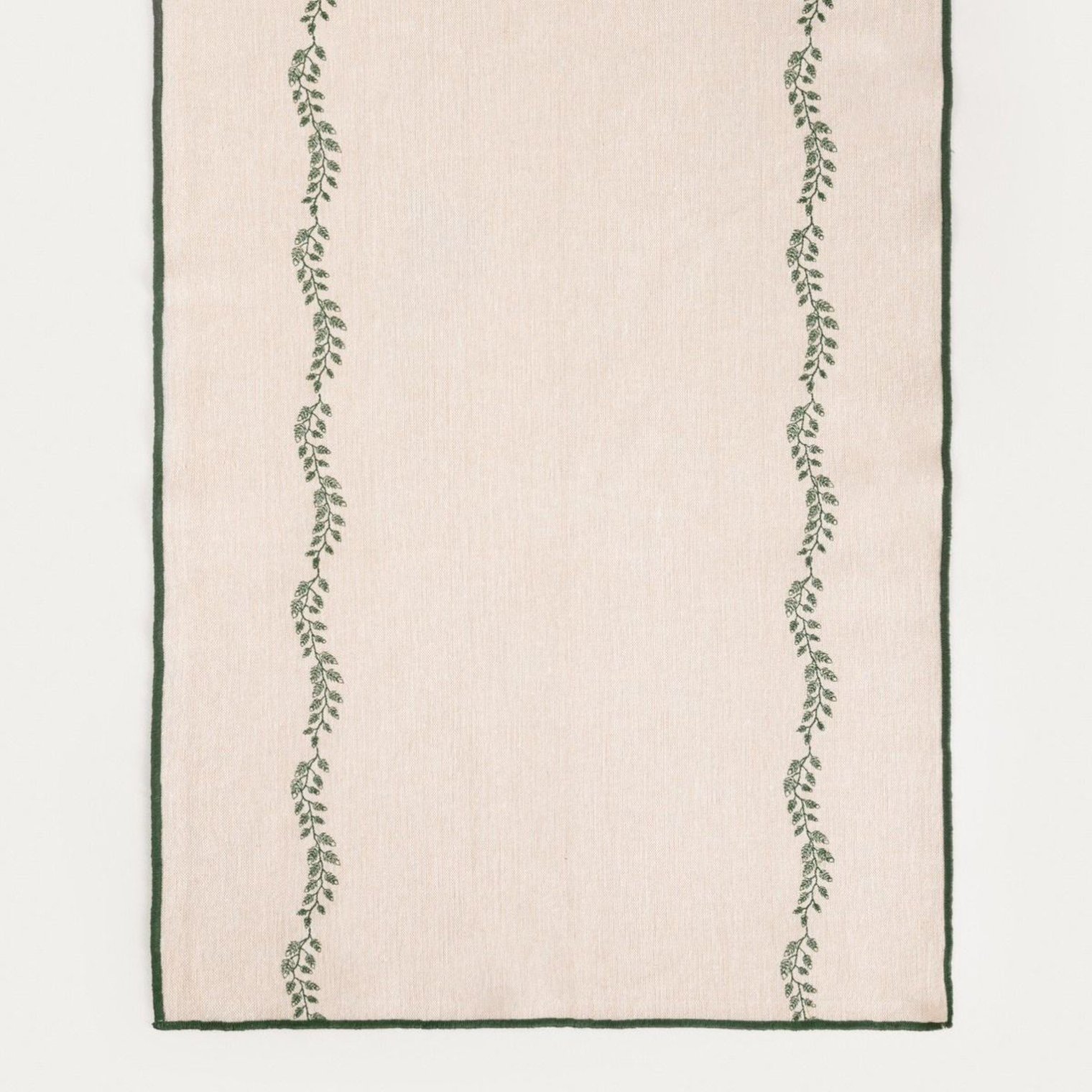 Якщо ви шукаєте елегантну прикрасу для столу, ARRIATE — ідеальний вибір. Бежева тканина прикрашена ніжною зеленою вишивкою у вигляді гілочок, що надає їй легкості та гармонійності. Темно-зелене оздоблення елегантно підкреслює форму доріжки, додаючи індивідуальності. Цей стильний аксесуар чудово виглядатиме як у святковий день, так і в повсякденному інтер'єрі.