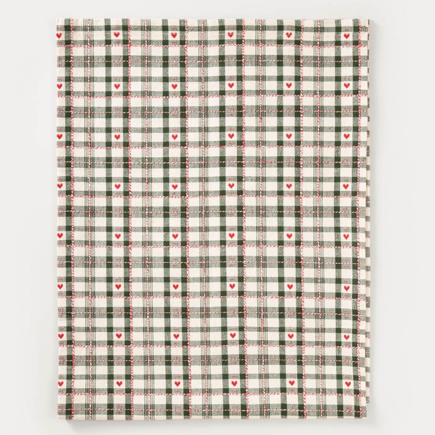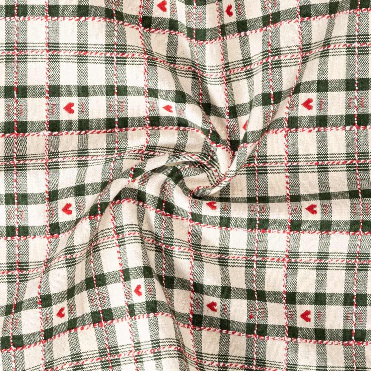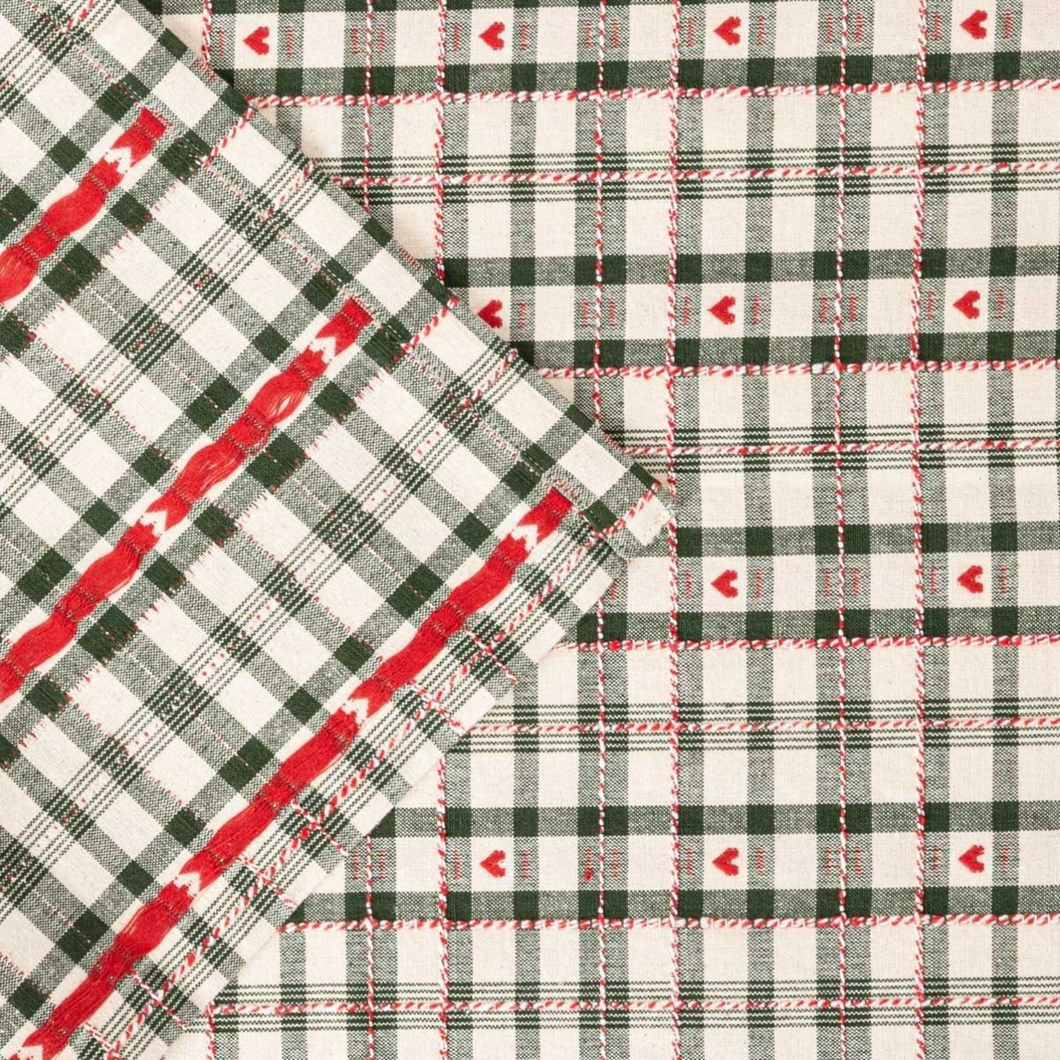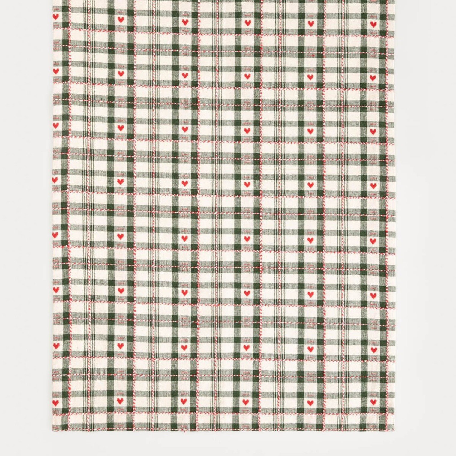 Настільна доріжка CORTEZ — це унікальна прикраса для столу, що поєднує класичний картатий мотив з ніжним, романтичним акцентом у вигляді червоних сердець. Візерунок відрізняється гармонійною гамою кольорів: домінує теплий зелений колір з червоними акцентами на світлому кремовому тлі. Вона чудово виглядає як у класичному, так і в сучасному інтер'єрі, створюючи гармонійну основу для сервірування столу.