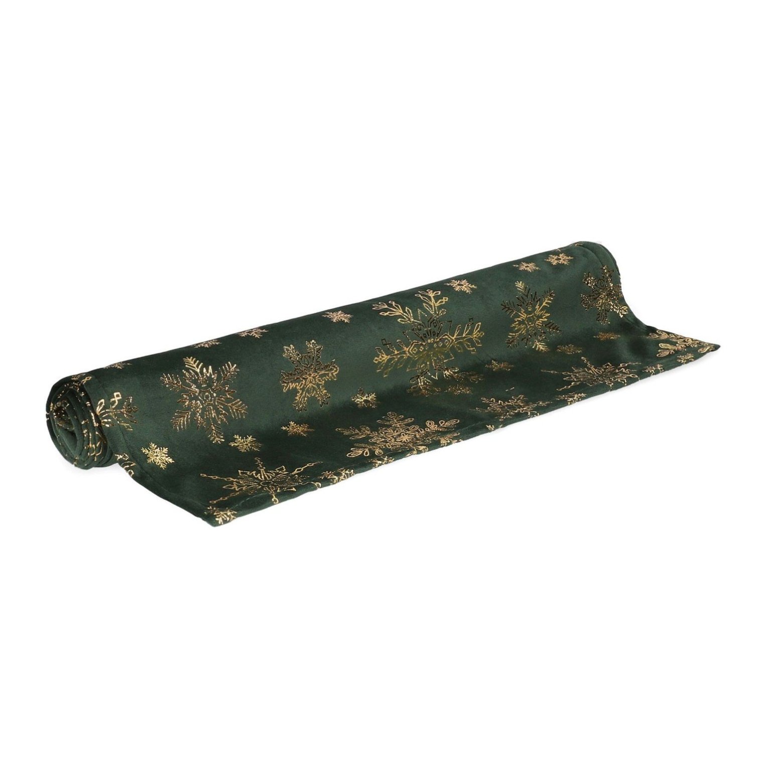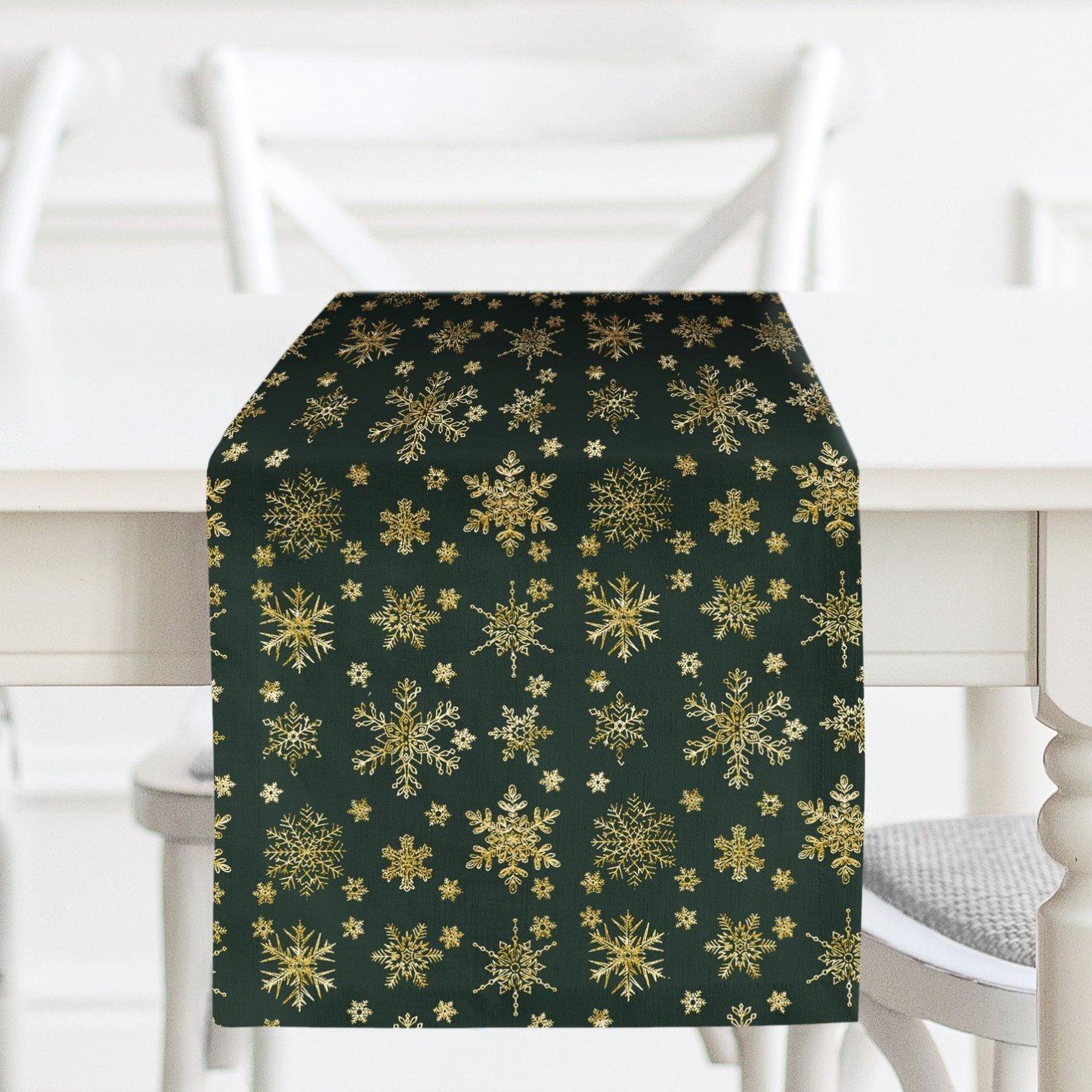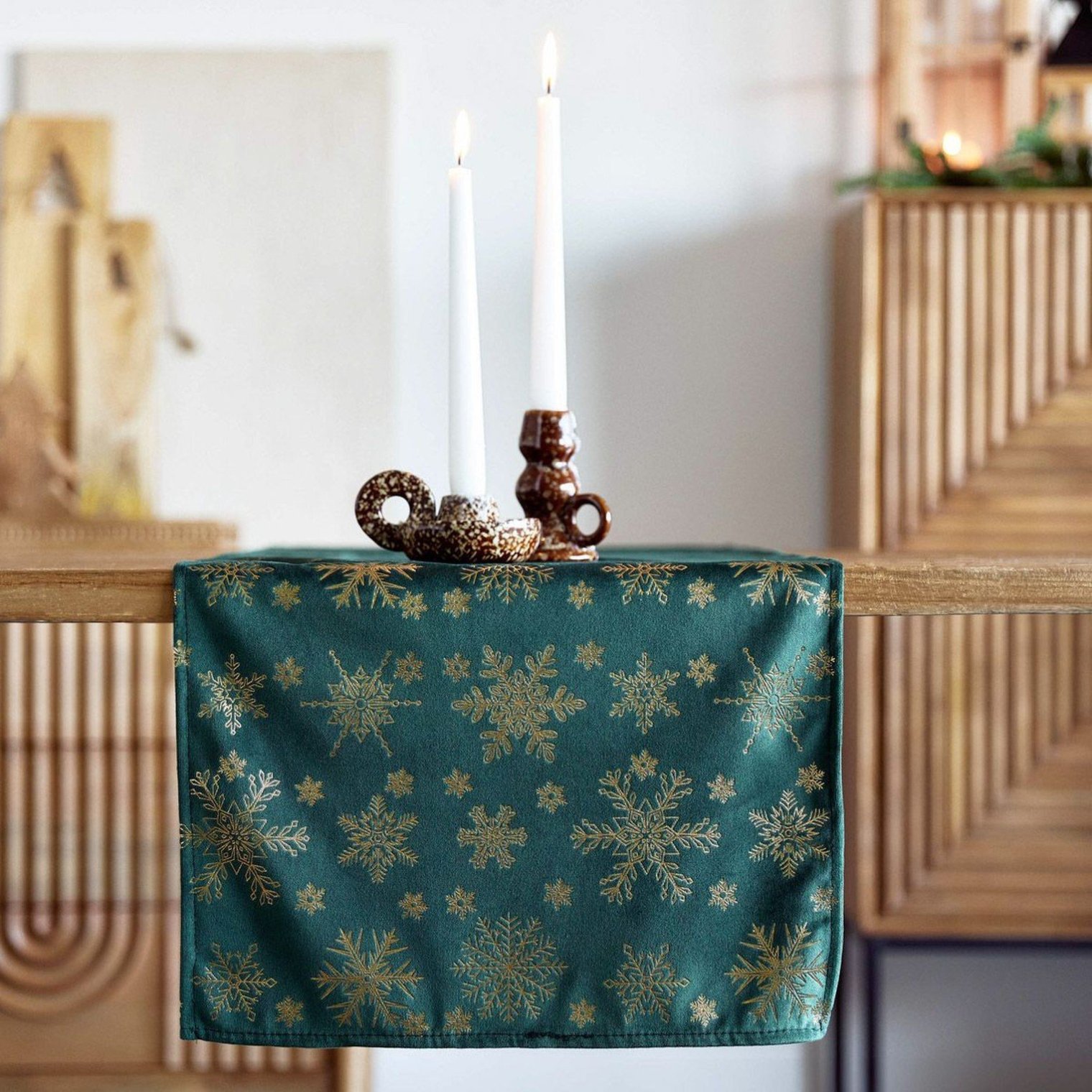 Ця зелена доріжка розміром 40 х 160 см прикрашена зимовим візерунком із золотими сніжинками.Мерехтливий золотий орнамент приголомшливо виглядає в атмосферному світлі свічок. Кольори та малюнок нагадують легкий сніжок, що падає з неба, освітленого північним сяйвом. Насичений колір робить будь-які забруднення непомітними.