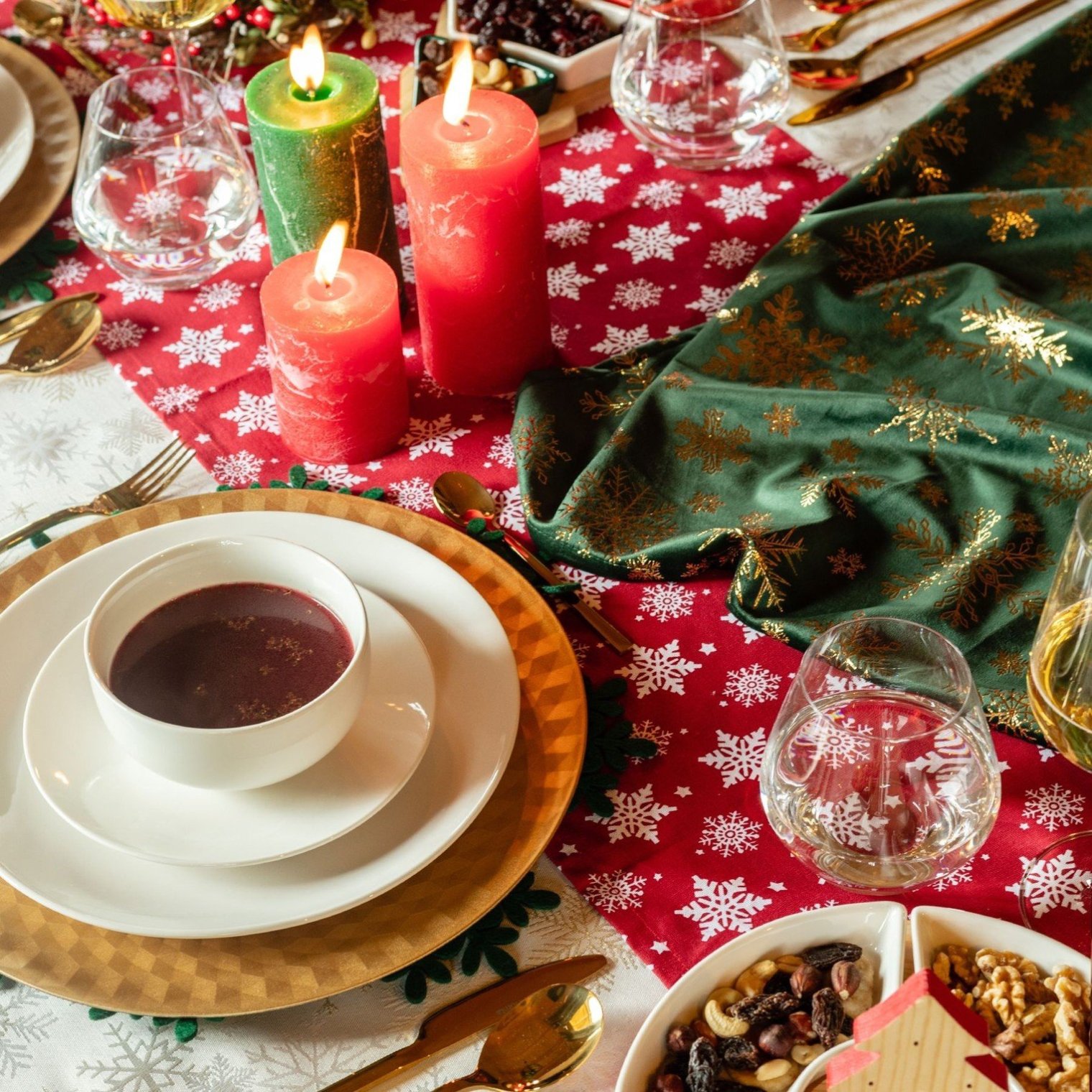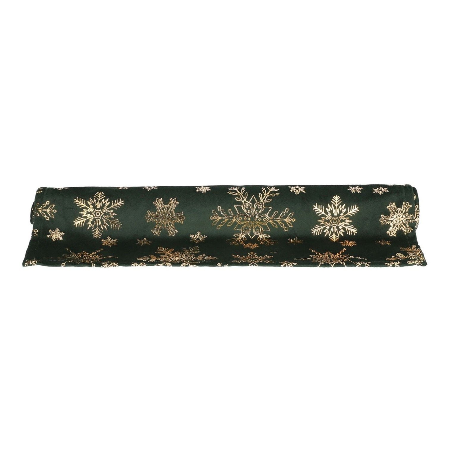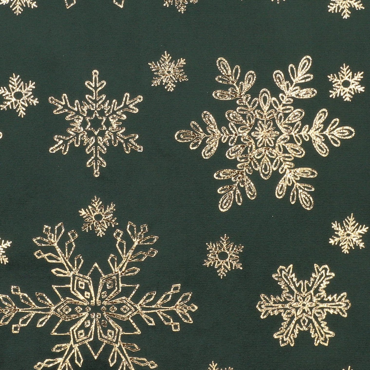 Ця зелена доріжка розміром 40 х 160 см прикрашена зимовим візерунком із золотими сніжинками.Мерехтливий золотий орнамент приголомшливо виглядає в атмосферному світлі свічок. Кольори та малюнок нагадують легкий сніжок, що падає з неба, освітленого північним сяйвом. Насичений колір робить будь-які забруднення непомітними.