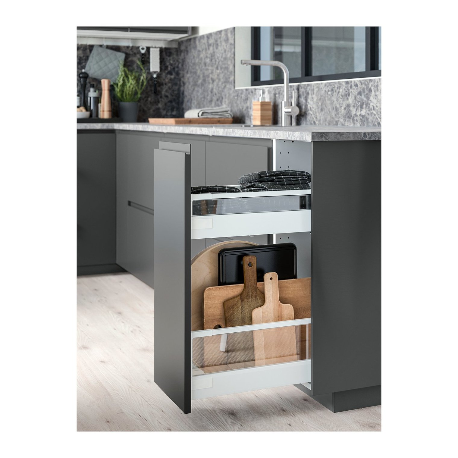 М'який висувний ящик з обмежувачем забезпечує хороший огляд вмісту і полегшує доступ до них.