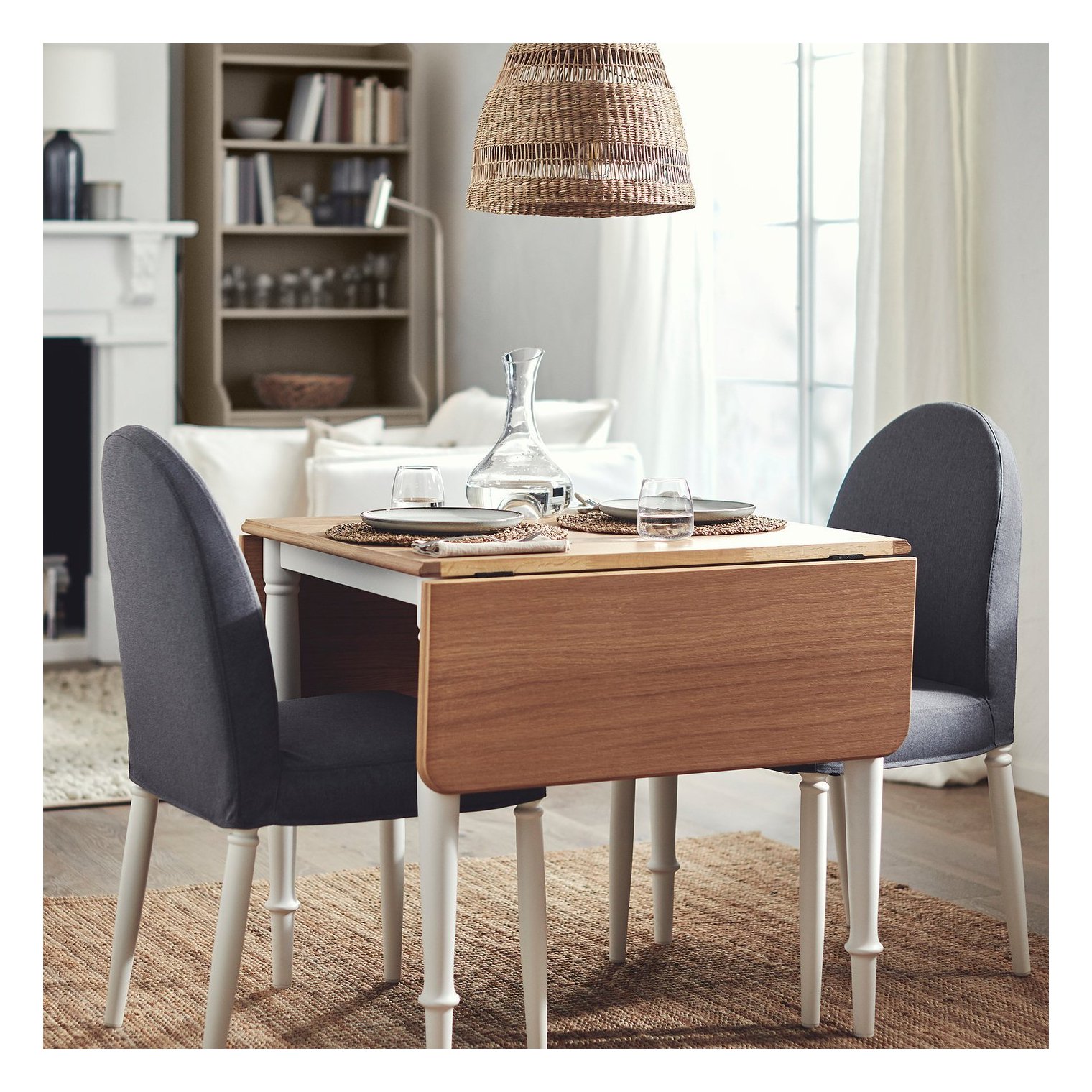 За цим столом із відкидною стільницею можуть розміститися від 2 до 4 осіб. Це гарне рішення для невеликих кімнат, тому що розмір можна зручно регулювати за необхідності.