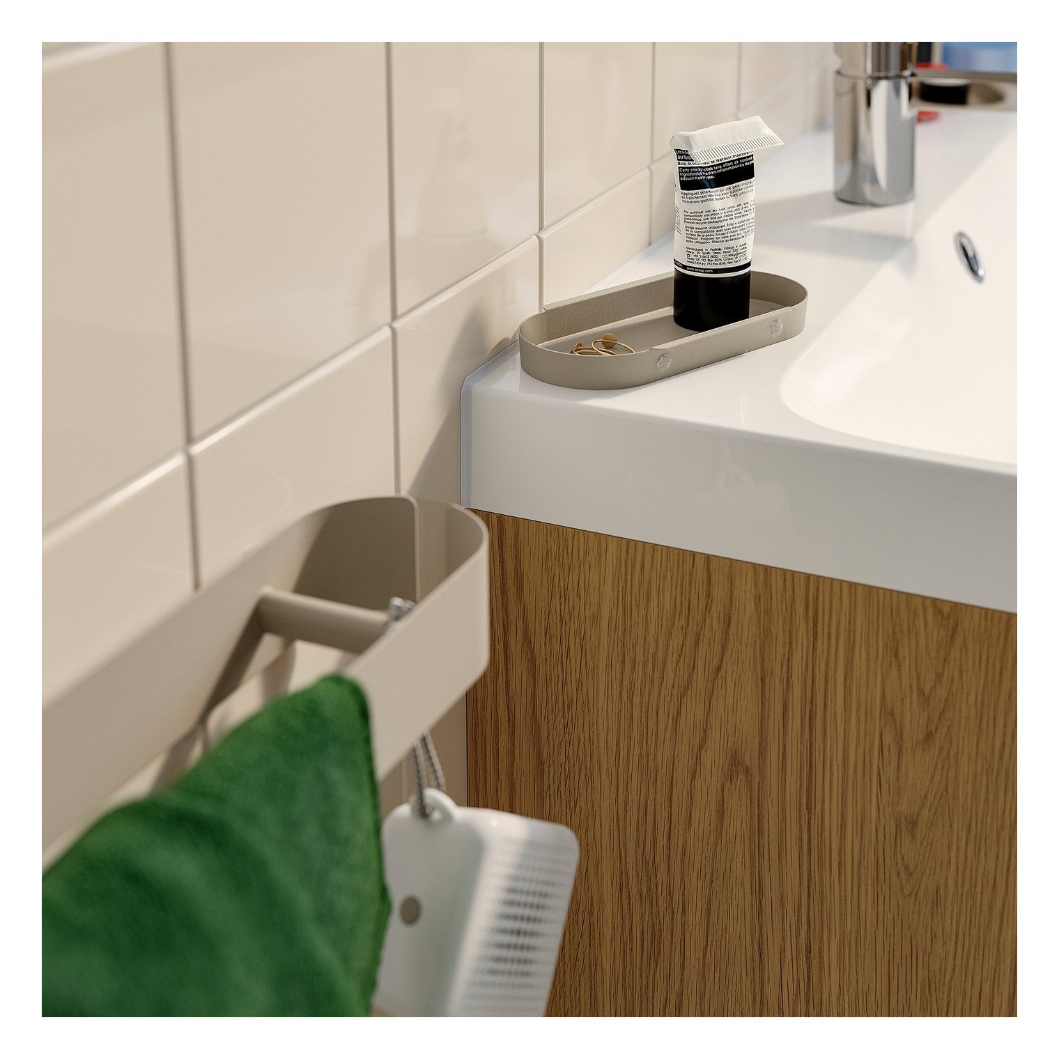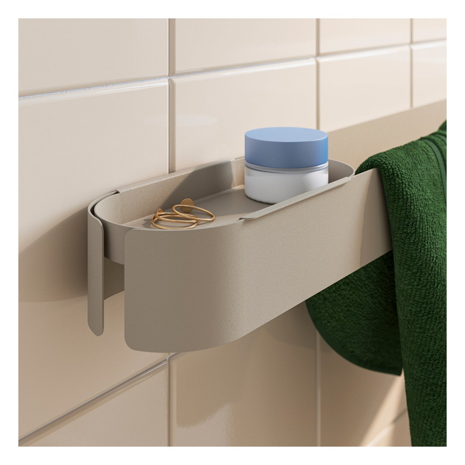 Съёмная полка — практичное место для мыла, украшений и других безделушек, которые часто теряются. Полку можно установить на направляющую или на раковину.