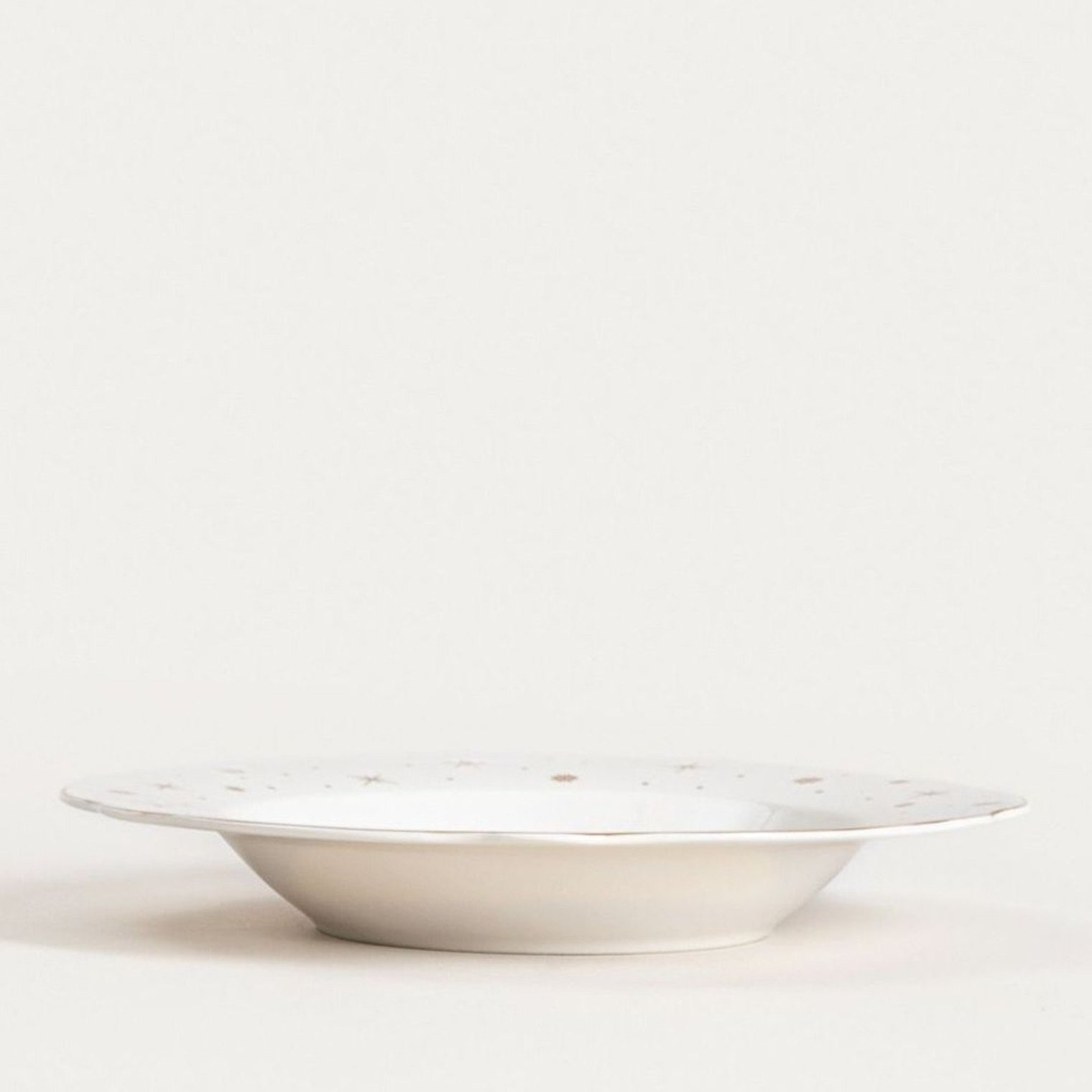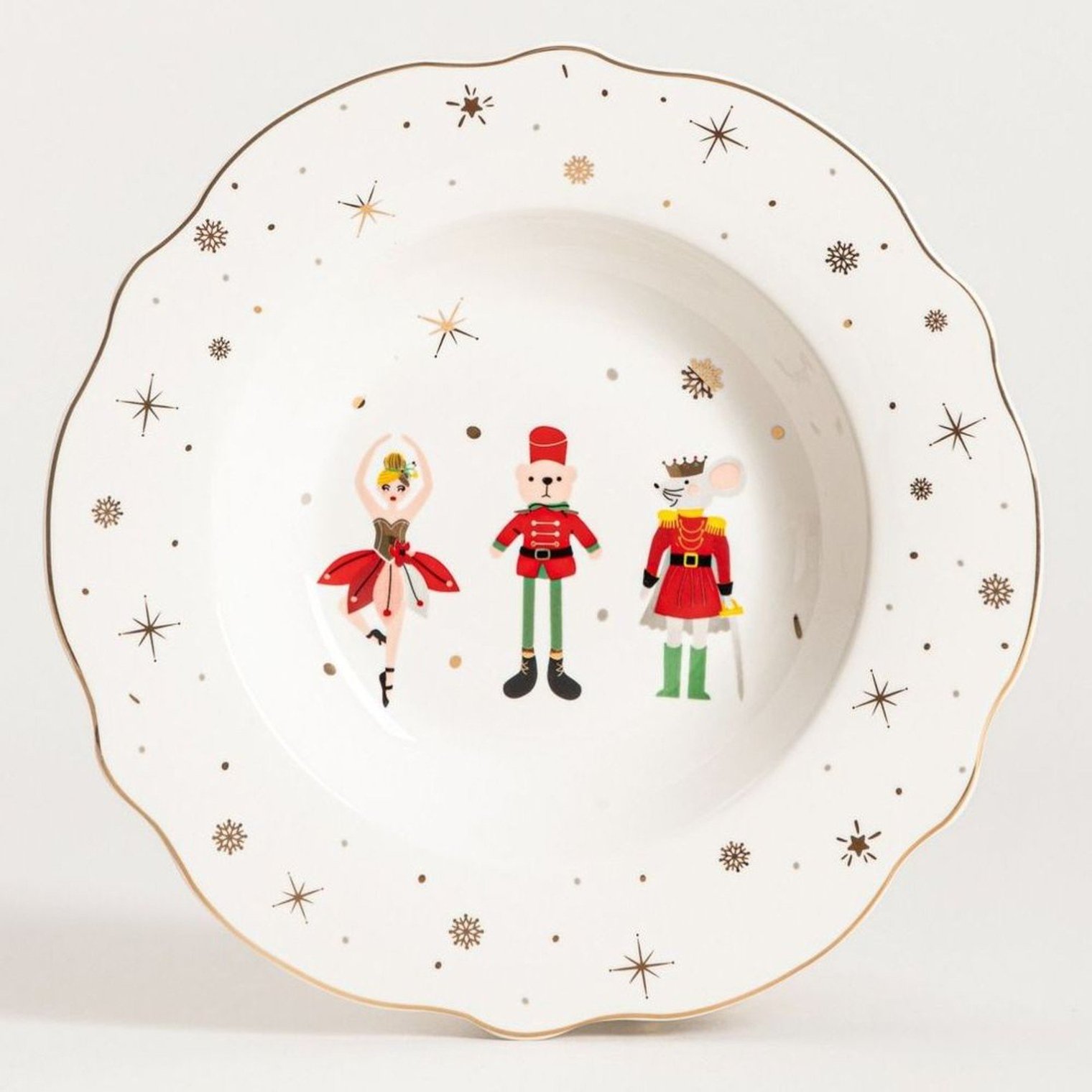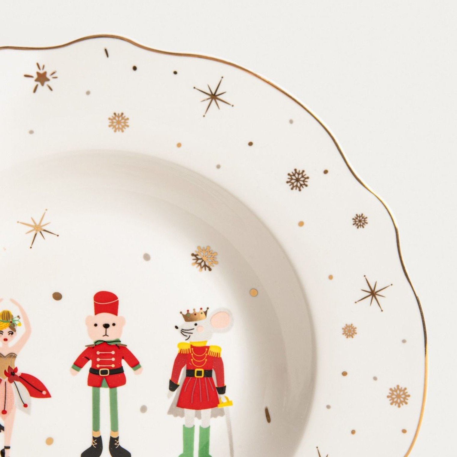 Ця супова тарілка прикрашена святковими деталями, такими як зірочки та сніжинки. На дні тарілки зображені персонажі казки «Лускунчик» — балерина, плюшевий ведмедик та мишеня. Ця чудова тарілка ідеально підійде для святкового столу. Вона чудово доповнить інші різдвяні прикраси.